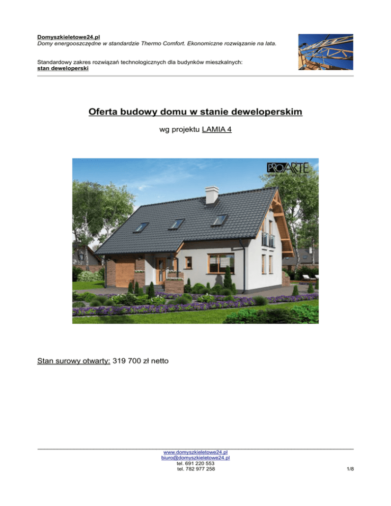 Domyszkieletowe24.pl Domy energooszczędne w standardzie Thermo Comfort. Ekonomiczne rozwiązanie na lata. Standardowy zakres rozwiązań technologicznych dla budynków mieszkalnych: stan deweloperski Oferta budowy domu w stanie deweloperskim wg projektu LAMIA 4 Stan surowy otwarty: 319 700 zł netto ________________________________________________________________________________________________ www.domyszkieletowe24.pl [email protected] tel. 691 220 553 tel. 782 977 258 1/8 Domyszkieletowe24.pl Domy energooszczędne w standardzie Thermo Comfort. Ekonomiczne rozwiązanie na lata. Standardowy zakres rozwiązań technologicznych dla budynków mieszkalnych: stan deweloperski OFERTA Obiekt: Budynek mieszkalny, jednorodzinny, wg projektu budowlanego LAMIA 4 Zakres robót: Stan deweloperski Cena: 319 700 zł netto (8% vat) 345 276 zł brutto Cena zawiera: • konstrukcja budynku jednorodzinnego, wykonana wg Opisu Konstrukcji Budynku, zgodnie z przedstawionym projektem • projekt produkcyjno-montażowy • montaż konstrukcji • koszt dźwigu budowlanego • koszty transportu ________________________________________________________________________________________________ www.domyszkieletowe24.pl [email protected] tel. 691 220 553 tel. 782 977 258 2/8 Domyszkieletowe24.pl Domy energooszczędne w standardzie Thermo Comfort. Ekonomiczne rozwiązanie na lata. Standardowy zakres rozwiązań technologicznych dla budynków mieszkalnych: stan deweloperski OPIS KONSTRUKCJI BUDYNKU stan deweloperski 1. Podwaliny • • • • elementy ścienne prefabrykowane ustawiane są na podwalinach 140x60 mm z drewna KVH podwaliny mocowane są do konstrukcji fundamentowej przy pomocy ocynkowanych łączników lub kotew chemicznych pod podwalinami ułożone są pasy izolacji poziomej z folii izolacyjnej fundamentowej o szerokości 200 mm szczelina pomiędzy podwaliną a podłożem betonowym wypełniona jest spienionym poliuretanem 2. Ściany zewnętrzne typu Thermo Comfort o współczynniku U=0,14 W/m2K • • • prefabrykowane płyty ścienne łączone na placu budowy w tarcze ścienne konstrukcja z drewna konstrukcyjnego KVH o wilgotności 15% (+/-3%), suszonego komorowo, czterostronnie struganego, o przekroju 140x60 mm łączna grubość ściany 28 cm •warstwy ściany zewnętrznej w kolejności od zewnątrz: • • • • • • • • • tynk zewnętrzny akrylowy (warstwa zewnętrzna strukturalna, siatka z włókna szklanego, warstwa podkładowa) izolacja termiczna (płyta styropianowa 100 mm) płyta konstrukcyjna OSB 3 grubości 12 mm membrana wiatroizolacyjna elementy konstrukcyjne z drewna KVH (140x60 mm) izolacja termiczna wewnętrzna (wełna mineralna 150 mm) płyta konstrukcyjna OSB 3 grubości 12 mm folia paroizolacyjna suchy tynk (płyta gipsowo-kartonowa grubości 12 mm) ________________________________________________________________________________________________ www.domyszkieletowe24.pl [email protected] tel. 691 220 553 tel. 782 977 258 3/8 Domyszkieletowe24.pl Domy energooszczędne w standardzie Thermo Comfort. Ekonomiczne rozwiązanie na lata. Standardowy zakres rozwiązań technologicznych dla budynków mieszkalnych: stan deweloperski 3. Ściany wewnętrzne • prefabrykowane moduły ścienne łączone na placu budowy w tarcze ścienne z drewna konstrukcyjnego KVH o wilgotności 15% (+/-3%), suszonego komorowo, czterostronnie struganego 140x60 mm •opis warstw ściany wewnętrznej: • • • • • • • suchy tynk (płyta gipsowo-kartonowa grubości 12 mm) płyta konstrukcyjna OSB 3 grubości 12 mm folia paroizolacyjna (w pomieszczeniach o podwyższonej wilgotności, tzw. mokrych) elementy konstrukcyjne z drewna KVH (140x60 mm) izolacja akustyczna wewnętrzna (wełna mineralna grubości 50 mm) płyta kartonowo-gipsowa grubości 12 mm suchy tynk (płyta gipsowo-kartonowa grubości 12 mm) 4. Konstrukcja dachu, U=0,14 W/m2K • • • wykonana jest z prefabrykowanych gotowych wiązarów dachowych z drewna konstrukcyjnego klasy C24 lub C30, impregnowanego przed korozją biologiczną i ogniem, suszonego komorowo i struganego czterostronnie, łączonego ocynkowanymi płytkami kolczastymi, lub więźba typu tradycyjnego dla budynków z użytkowym poddaszem dach jest typu "ciepłego", tzn. warstwa izolacji cieplnej umieszczona jest w połaci dachu połacie dachu pokryte dachówką ceramiczną, obróbki dekarskie, deska czołowa •opis kolejności warstw połaci dachu od zewnątrz: • ◦ ◦ ◦ ◦ ◦ ◦ ◦ ◦ • dachówka ceramiczna Roben lub odpowiednik cenowy, obróbki dekarskie łaty z drewna iglastego impregnowanego kontrłaty z drewna iglastego impregnowanego membrana dachowa wysokoparoprzepuszczalna pas górny wiązarów dachowych/krokwie dachowe izolacja termiczna wewnętrzna (wełna mineralna grubości 250 mm) płyta konstrukcyjna OSB 3 grubości 12 mm folia paroizolacyjna suchy tynk (płyta gipsowo-kartonowa grubości 12 mm) Strop zgodnie z projektem. Od spodu wykończony płytą OSB i suchym tynkiem (płyty GK), izolacja akustyczna z wełny mineralnej, od góry poszycie z płyty OSB 25 mm. ________________________________________________________________________________________________ www.domyszkieletowe24.pl [email protected] tel. 691 220 553 tel. 782 977 258 4/8 Domyszkieletowe24.pl Domy energooszczędne w standardzie Thermo Comfort. Ekonomiczne rozwiązanie na lata. Standardowy zakres rozwiązań technologicznych dla budynków mieszkalnych: stan deweloperski • opis kolejności warstw stropu od góry: ◦ ◦ ◦ ◦ ◦ ◦ płyta konstrukcyjna OSB 3 grubości 25 mm konstrukcja stropu (belki stropowe lub pas dolny wiązara prefabrykowanego) izolacja akustyczna wewnętrzna (wełna mineralna grubości 100 mm) płyta konstrukcyjna OSB 3 grubości 12 mm folia paroizolacyjna (w pomieszczeniach o podwyższonej wilgotności, tzw. mokrych) suchy tynk (płyta gipsowo-kartonowa grubości 12 mm) 5. Pasy podokapowe (nadwieszenia dachu) • pasy podokapowe wykończone są 