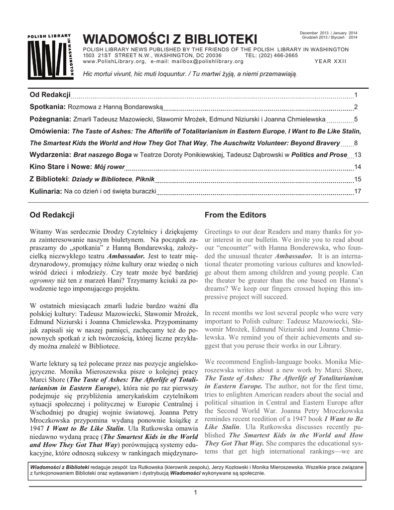 WiadomoĞci z Biblioteki GrudzieĔ 2013 / StyczeĔ 2014 WIADOMOĝCI Z BIBLIOTEKI December 2013 / January 2014 GrudzieĔ 2013 / StyczeĔ 2014 POLISH LIBRARY NEWS PUBLISHED BY THE FRIENDS OF THE POLISH LIBRARY IN WASHINGTON 1503 21ST STREET N.W., WASHINGTON, DC 20036 TEL: (202) 466-2665 ww w.Polish Li bra r y. or g, e - m a i l : m ai l b o x @ p o l i s h l i b r a r y. org YEAR XXII Hic mortui vivunt, hic muti loquuntur. / Tu martwi Īyją, a niemi przemawiają. Od Redakcji 1 Spotkania: Rozmowa z Hanną Bondarewską 2 PoĪegnania: Zmarli Tadeusz Mazowiecki, Sáawomir MroĪek, Edmund Niziurski i Joanna Chmielewska 5 Omówienia: The Taste of Ashes: The Afterlife of Totalitarianism in Eastern Europe, I Want to Be Like Stalin, The Smartest Kids the World and How They Got That Way, The Auschwitz Volunteer: Beyond Bravery 8 Wydarzenia: Brat naszego Boga w Teatrze Doroty Ponikiewskiej, Tadeusz Dąbrowski w Politics and Prose 13 Kino Stare i Nowe: Mój rower 14 Z Biblioteki: Dziady w Bibliotece, Piknik 15 Kulinaria: Na co dzieĔ i od ĞwiĊta buraczki 17 Od Redakcji From the Editors Witamy Was serdecznie Drodzy Czytelnicy i dziĊkujemy za zainteresowanie naszym biuletynem. Na początek zapraszamy do „spotkania” z Hanną Bondarewską, zaáoĪycielką niezwykáego teatru Ambassador. Jest to teatr miĊdzynarodowy, promujący róĪne kultury oraz wiedzĊ o nich wĞród dzieci i máodzieĪy. Czy teatr moĪe byü bardziej ogromny niĪ ten z marzeĔ Hani? Trzymamy kciuki za powodzenie tego imponującego projektu. Greetings to our dear Readers and many thanks for your interest in our bulletin. We invite you to read about our “encounter” with Hanna Bonderewska, who founded the unusual theater Ambassador. It is an international theater promoting various cultures and knowledge about them among children and young people. Can the theater be greater than the one based on Hanna’s dreams? We keep our fingers crossed hoping this impressive project will succeed. W ostatnich miesiącach zmarli ludzie bardzo waĪni dla polskiej kultury: Tadeusz Mazowiecki, Sáawomir MroĪek, Edmund Niziurski i Joanna Chmielewska. Przypominamy jak zapisali siĊ w naszej pamiĊci, zachĊcamy teĪ do ponownych spotkaĔ z ich twórczoĞcią, której liczne przykáady moĪna znaleĨü w Bibliotece. In recent months we lost several people who were very important to Polish culture: Tadeusz Mazowiecki, Sáawomir MroĪek, Edmund Niziurski and Joanna Chmielewska. We remind you of their achievements and suggest that you peruse their works in our Library. Warte lektury są teĪ polecane przez nas pozycje angielskojĊzyczne. Monika Mieroszewska pisze o kolejnej pracy Marci Shore (The Taste of Ashes: The Afterlife of Totalitarianism in Eastern Europe), która nie po raz pierwszy podejmuje siĊ przybliĪenia amerykaĔskim czytelnikom sytuacji spoáecznej i politycznej w Europie Centralnej i Wschodniej po drugiej wojnie Ğwiatowej. Joanna Petry Mroczkowska przypomina wydaną ponownie ksiąĪkĊ z 1947 I Want to Be Like Stalin. Ula Rutkowska omawia niedawno wydaną pracĊ (The Smartest Kids in the World and How They Got That Way) porównującą systemy edukacyjne, które odnoszą sukcesy w rankingach miĊdzynaro- We recommend English-language books. Monika Mieroszewska writes about a new work by Marci Shore, The Taste of Ashes: The Afterlife of Totalitarianism in Eastern Europe. The author, not for the first time, tries to enlighten American readers about the social and political situation in Central and Eastern Europe after the Second World War. Joanna Petry Mroczkowska remindes recent reedition of a 1947 book I Want to Be Like Stalin. Ula Rutkowska discusses recently published The Smartest Kids in the World and How They Got That Way. She compares the educational systems that get high international rankings—we are WiadomoĞci z Biblioteki redaguje zespóá: Iza Rutkowska (kierownik zespoáu), Jerzy Kozáowski i Monika Mieroszewska. Wszelkie prace związane z funkcjonowaniem Biblioteki oraz wydawaniem i dystrybucją WiadomoĞci wykonywane są spoáecznie. 1 Polish Library News December 2013 / January 2014 dowych; jest wĞród nich szkolnictwo polskie, co odnotowujemy z prawdziwą przyjemnoĞcią. Krzysztof Sąsiadek przybliĪa nam natomiast pozycjĊ niezwykáą – wydany po raz pierwszy po angielsku raport Witolda Pileckiego na temat warunków panujących w obozie hitlerowskim w Auschwitz (The Auschwitz Volunteer: Beyond Bravery). Przejmujący dokument napisany przez bohatera, o którym do niedawna nie moĪna byáo usáyszeü. Tragiczna historia, typowa dla czasów, które na szczĊĞcie przeminĊáy. happy to note that Poland is one of them. Krzysztof Sąsiadek tells us about an incredible book, The Auschwitz Volunteer: Beyond Bravery. Written by the “volunteer,” Witold Pilecki’s report (published in English for the first time) is the long-suppressed account of life in the Nazi camp in Auschwitz. This is an important historical document of these tragic times. We write about two recent cultural events. The first is the presentation of a young Polish poet at Politics and Prose bookstore. It was so successful that his books were instantly sold out. The second is the very ambitious venture of staging, by the amateur theater group of Dorota Ponikiewska, a play by Karol Wojtyáa titled Brat naszego Boga (Brother of our God). This philosophical tract on charity and marxism, in an impassioned presentation by Dorota’s thespians, is reviewed for us by Joanna Roberts. It is really worth reading, since the play won’t be staged again anytime soon. SpoĞród ostatnich wydarzeĔ kulturalnych piszemy o dwóch – pierwsze to prezentacja polskiego poety, którego tomiki zostaáy „na pniu” wysprzedane w waszyngtoĔskiej Politics and Prose. Drugie to przedsiĊwziĊcie niezwykle ambitne – inscenizacja przez amatorski Teatr Doroty Ponikiewskiej sztuki Karola Wojtyáy Brat naszego Boga. Ten filozoficzny traktat o miáosierdziu i marksizmie,