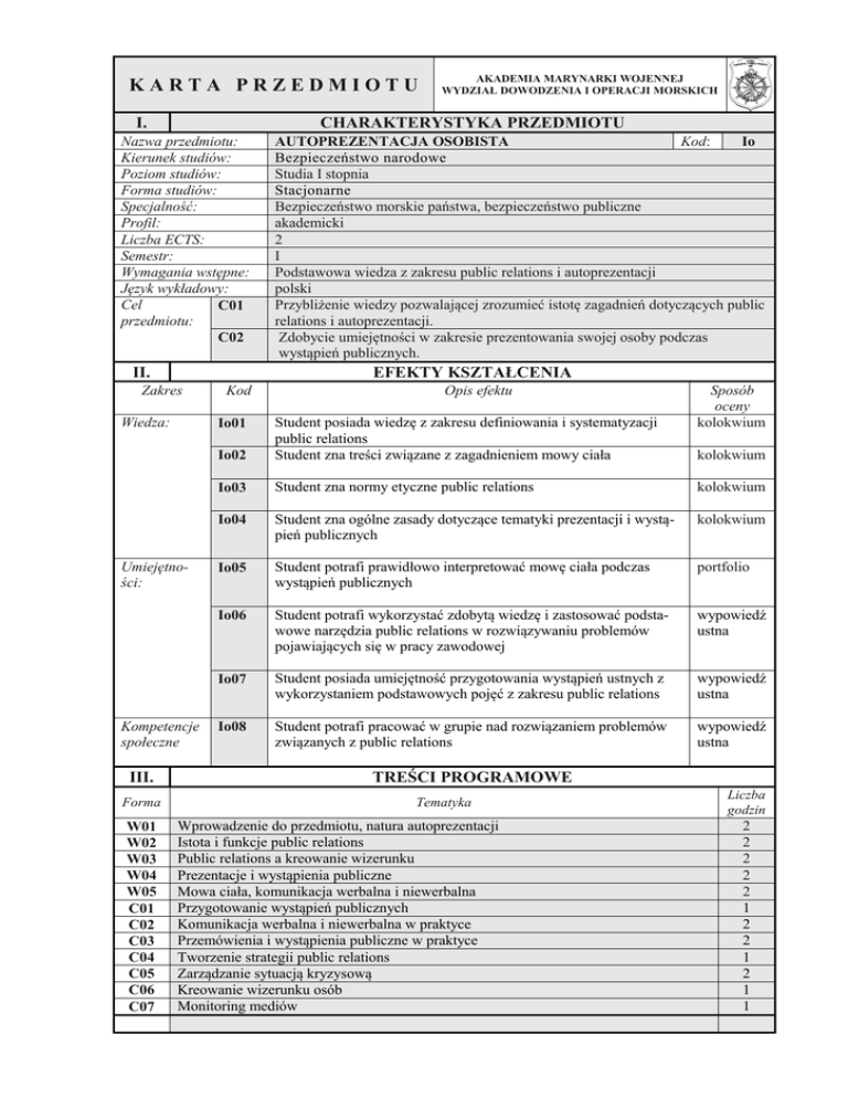 KARTA PRZEDMIOTU I. CHARAKTERYSTYKA PRZEDMIOTU Nazwa przedmiotu: Kierunek studiów: Poziom studiów: Forma studiów: Specjalność: Profil: Liczba ECTS: Semestr: Wymagania wstępne: Język wykładowy: Cel C01 przedmiotu: C02 II. Wiedza: Kompetencje społeczne W01 W02 W03 W04 W05 C01 C02 C03 C04 C05 C06 C07 Kod Opis efektu Sposób oceny kolokwium Io02 Student posiada wiedzę z zakresu definiowania i systematyzacji public relations Student zna treści związane z zagadnieniem mowy ciała kolokwium Io03 Student zna normy etyczne public relations kolokwium Io04 Student zna ogólne zasady dotyczące tematyki prezentacji i wystąpień publicznych kolokwium Io05 Student potrafi prawidłowo interpretować mowę ciała podczas wystąpień publicznych portfolio Io06 Student potrafi wykorzystać zdobytą wiedzę i zastosować podstawowe narzędzia public relations w rozwiązywaniu problemów pojawiających się w pracy zawodowej wypowiedź ustna Io07 Student posiada umiejętność przygotowania wystąpień ustnych z wykorzystaniem podstawowych pojęć z zakresu public relations wypowiedź ustna Io08 Student potrafi pracować w grupie nad rozwiązaniem problemów związanych z public relations wypowiedź ustna Io01 Umiejętności: Forma Kod: AUTOPREZENTACJA OSOBISTA Io Bezpieczeństwo narodowe Studia I stopnia Stacjonarne Bezpieczeństwo morskie państwa, bezpieczeństwo publiczne akademicki 2 I Podstawowa wiedza z zakresu public relations i autoprezentacji polski Przybliżenie wiedzy pozwalającej zrozumieć istotę zagadnień dotyczących public relations i autoprezentacji. Zdobycie umiejętności w zakresie prezentowania swojej osoby podczas wystąpień publicznych. EFEKTY KSZTAŁCENIA Zakres III. AKADEMIA MARYNARKI WOJENNEJ WYDZIAŁ DOWODZENIA I OPERACJI MORSKICH TREŚCI PROGRAMOWE Tematyka Wprowadzenie do przedmiotu, natura autoprezentacji Istota i funkcje public relations Public relations a kreowanie wizerunku Prezentacje i wystąpienia publiczne Mowa ciała, komunikacja werbalna i niewerbalna Przygotowanie wystąpień publicznych Komunikacja werbalna i niewerbalna w praktyce Przemówienia i wystąpienia publiczne w praktyce Tworzenie strategii public relations Zarządzanie sytuacją kryzysową Kreowanie wizerunku osób Monitoring mediów Liczba godzin 2 2 2 2 2 1 2 2 1 2 1 1 IV. KORELACJA EFEKTÓW KSZTAŁCENIA Forma Kod efektu przedmiotu Io01, Io03, Io01, Io03, Io06, Io07, Io01, Io02, Io03, Io06 Io02, Io04, Io05, Io06, Io07 Io02, Io04, Io05, Io07 Io02, Io04, Io05, Io06, Io07, Io08 W01 W02 W03 W04 W05 C01 C02 Io02, Io04, Io05, Io07, Io08 C03 Io02, Io04, Io05, Io07, Io08 C04 C05 C06 Io01, Io03, Io08 Io01, Io02, Io03, Io04, Io08 C07 Io01, Io08 Io01, Io02, Io03, Io04, Io08 V. Kod efektu kierunkowego Kod efektu obszarowego BN1_W01 BN1_W02 BN1_W02 BN1_W02, BN1_U06 BN1_W02, BN1_U06 BN1_W02, BN1_U06, BN1_K02 BN1_W02, BN1_U06, BN1_K02 BN1_W02, BN1_U06, BN1_K02 BN1_W02, BN1_K02 BN1_W02, BN1_K02 BN1_W02, BN1_U06, BN1_K02 BN1_W02, BN1_K02 S1A_W01 S1A_W04 S1A_W04 S1A_W04, S1A_U06 S1A_W04, S1A_U06 S1A_W04, S1A_U06, S1A_K02 S1A_W04, S1A_U06, S1A_K02 S1A_W04, S1A_U06, S1A_K02 S1A_W04, S1A_K02 S1A_W04, S1A_K02 S1A_W04, S1A_U06, S1A_K02 S1A_W04, S1A_K02 NAKŁAD PRACY STUDENTA Forma aktywności Wykład Ćwiczenia Seminaria Konwersatoria Konsultacje Rozliczenie rygorów przedmiotu Przygotowanie do ćwiczeń Opanowanie informacji Przygotowanie do rozliczenia rygorów RAZEM VI. Liczba godzin kontaktowych 10 10 Liczba godzin niekontaktowych Razem liczba godzin Pkt. ECTS 50 2 15 35 5 5 5 15 METODY DYDAKTYCZNE 1. 2. 3. Wykład z prezentacją multimedialną Ćwiczenia audytoryjne: dyskusja Ćwiczenia audytoryjne: praca w grupach VII. FORMA ZALICZENIA PRZEDMIOTU Rygor Zaliczenie Kryteria składowe Średnia ze sprawdzianów na ćwiczeniach Ocena z kolokwium Ocena z przygotowania i aktywności na ćwiczeniach Waga 0,2 0,6 0,2 Egzamin VIII. 1 2 3 4 LITERATURA PODSTAWOWA I UZUPEŁNIAJĄCA OBOWIĄZKOWA Wojcik K., Public relations. Wiarygodny dialog z otoczeniem., Placet, Warszawa 2010 Rozwadowska B., Public Relations. Teoria, praktyka, perspektywy., Studio Emka, Warszawa 2009 Pease A. i B., Mowa Ciała, Dom Wydawniczy REBIS, Poznań 2011 Blein B., Sztuka Prezentacji i Wystąpień Publicznych, Wydawnictwo RM, Warszawa 2010 UZUPEŁNIAJĄCA 1. 2. Leary M., Wywieranie wrażenia na innych. O sztuce Autoprezentacji, Gdańskie Wydawnictwo Psychologiczne, Gdańsk 2010 Collins A., Mowa ciała. Co znaczą nasze gesty?, Oficyna Wydawnicza RYTM, Warszawa 2002 IX. PROWADZĄCY PRZEDMIOT Stopień, Imię i nazwisko adres e-mail kmdr dr hab. Krzysztof Rokiciński, mgr Małgorzata Porębska [email protected]