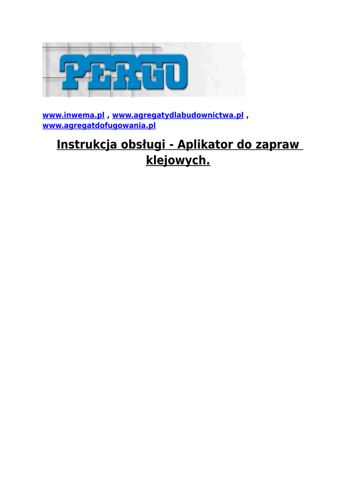www.inwema.pl , www.agregatydlabudownictwa.pl , www.agregatdofugowania.pl Instrukcja obsługi - Aplikator do zapraw klejowych. Wskazówki bezpieczeństwa 1. Należy przy wszelkich czynnościach np. mycie zasobnika na zaprawę lub wymiana „grzebienia” wyciągać wtyczkę z kontaktu. 2. Przed wyciągnięciem wtyczki z kontaktu należy osuszyć ręce. 3. Podczas pracy silnika/wibratora nie wolno chwytać za pracujące się elementy itp. 4. Przed uruchomieniem urządzenia (ADZK) należy zamontować wszystkie osłony. 5. Aplikator do zapraw klejowych jest przeznaczony do nakładania zapraw klejowych cementowych lub podobnych. 6. Kabel zasilający/przedłużacz może być łączony tylko z wtyczką znajdującą się przy włączniku . 7. Aplikator do zapraw klejowych nie może być używany w otoczeniu grożącym wybuchem. 8. Należy uważać aby w obszarze działania maszyny nie znajdowały się osoby. 9. Należy chronić długie części odzieży lub długie włosy przed wkręceniem w ruchome elementy Aplikatora. 10.Stosuj odpowiednie ubranie robocze. Nie należy nosić luźnej biżuterii. Zalecanym jest używanie gumowych rękawiczek oraz antypoślizgowego obuwia roboczego 11.Należy używać okularów ochronnych. 12.Należy chronić kabel zasilający przed przetarciem lub przecięciem. Nie należy ciągnąć za kabel i należy chronić przed zabrudzeniem olejami, i wysoką temperaturą. 13.Należy zachowywać pozycję roboczą stabilną i pionową. Należy unikać zbytniego wychylania, pochylania się aby nie stracić równowagi. 14.Stosowanie kabla zasilającego/przedłużacza na zewnątrz może być tylko używane przy pomocy do tego przystosowanych kabli. 15.Należy zwrócić uwagę na że, podczas czyszczenia maszyny lub zasobnika zapraw istnieje ryzyko zachlapania się lub ubrudzenia resztkami zapraw do klejenia. 16.Naprawy mechaniczne lub elektryczne są nie dopuszczalne z wyjątkiem autoryzowanego serwisu. 17.Maszyna zmywająca może być obsługiwana tylko przez przeszkolony personel oraz przez osoby pełnoletnie (18 lat). Aplikator do zapraw klejowych. Aplikator do nakładania zapraw klejowych stosowany do zapraw cienkowarstwowych, zapraw cementowych, epoksydowych i polimerowych. Aplikator wyposażony jest w wymienne kielnie/grzebienie (regulowane w zakresie od 3 do 5mm). Aplikator wykonany jest w całości ze stali nierdzewnej, urządzenie jest łatwe w czyszczeniu i konserwacji. Aplikator do zapraw klejowych jest łatwy w obsłudze i eksploatacji, dlatego pozwala na stały i równomierny przepływ materiału i szybką aplikację na podłoże. Obsługa Aplikatora do zapraw klejowych. 1. Uprzednio wymieszaną i przygotowana zaprawę klejową wlewamy do dozownika (max. 50 kg). 2. Po załączeniu silnika/wibratora (po odczekaniu paru sekund) za pomocą dźwigni otwieramy dozownik pozycja "open". 3. Rozpoczynamy aplikację materiału na powierzchnię uprzednio przygotowaną (podłoże musi być: równe, suche, nośne itp). 4. Nakładanie zaprawy odbywa się – ciągnąc Aplikator do tyłu. 5. Po zakończeniu aplikacji – należy zamknąć dozownik poz. „close” za pomocą dźwigni i wyłączyć silnik/wibrator. 6. Nie wolno dopuścić do trwałego zabrudzenia Aplikatora resztkami zapraw. Tuż po zakończeniu aplikacji należy Aplikator umyć i osuszyć. Deklaracja zgodności z normą europejską EG. Deklaruję, że firma Pergo Geratebau GmbH, A-5165 Berndorf, Handwerkstr. 4-5 Austria, że wyprodukowane maszyny………………………………………………………………… ……………………………………………………………….Produkcja seryjna jest zgodna z normą europejską: 89/392/EWG. Berndorf, 1209.1998 Edgar Perdolt Technischer Leiter Gwarancja 1 rok ( z wyjątkiem elementy wymienne) Serwis techniczny dystrybutora Tel. 501-167-225 Stempel