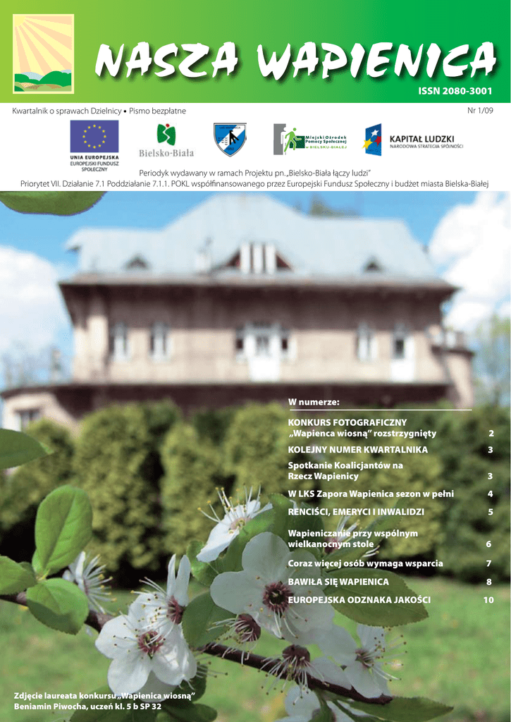 ISSN 2080-3001 Nr 1/09 Kwartalnik o sprawach Dzielnicy Pismo bezpłatne Periodyk wydawany w ramach Projektu pn. „Bielsko-Biała łączy ludzi” Priorytet VII. Działanie 7.1 Poddziałanie 7.1.1. POKL współfinansowanego przez Europejski Fundusz Społeczny i budżet miasta Bielska-Białej W numerze: KONKURS FOTOGRAFICZNY „Wapienca wiosną” rozstrzygnięty 2 KOLEJNY NUMER KWARTALNIKA 3 Spotkanie Koalicjantów na Rzecz Wapienicy 3 W LKS Zapora Wapienica sezon w pełni 4 RENCIŚCI, EMERYCI I INWALIDZI 5 Wapieniczanie przy wspólnym wielkanocnym stole 6 Coraz więcej osób wymaga wsparcia 7 BAWIŁA SIĘ WAPIENICA 8 EUROPEJSKA ODZNAKA JAKOŚCI Zdjęcie laureata konkursu „Wapienica wiosną” Beniamin Piwocha, uczeń kl. 5 b SP 32 10 2 KONKURS FOTOGRAFICZNY „Wapienica wiosną” rozstrzygnięty Przedstawiamy zdjęcia wyróżnione w konkursie Beniamin Piwocha, uczeń kl. 5 b SP 32 – STRUMYK Natanael Lorek, uczeń kl. 5 b SP 32 – KAPLICZKA Na początek chcemy podziękować wszystkim osobom, które wzięły udział w konkursie. Większość nadesłanych na niego zdjęć była na wysokim poziomie, co niezwykle nas cieszy. Po długiej dyskusji jury (zespół redakcyjny periodyku) w składzie: Artur Kulas i Dariusz Czupryna wyłoniło zwycięskie zdjęcie, które widnieje na okładce naszego wiosennego numeru kwartalnika „Nasza Wapienica”. Oceniono, zarówno spójność fotografii z tematem konkursu, jak i pomysłowość oraz względy artystyczne. Autorem wybranego zdjęcia jest: Beniamin Piwocha uczeń klasy 5b Szkoły Podstawowej nr 32. Jury wyróżniło również zdjęcia: Natanaela Lorka ucznia klasy 5b ze Szkoły Podstawowej nr 32. Wszystkim uczestnikom konkursu: Paulinie Machalicy, Patrycji Sapecie, Mikołajowi Szumińskiemu, Justynie Wiencek, Krzysztofowi Włodarkowi, Rafałowi Zasuwie (uczniom klasy 5b Szkoły Podstawowej nr 32) oraz Kindze Milczanowskiej i Patrycji Huczek (uczennicom klasy 1d Gimnazjum nr 15) serdecznie dziękujemy za udział w konkursie. Na konkurs wpłynęło 85 prac uczniów ze Szkoły Podstawowej nr 32 i Gimnazjum nr 15 w Wapienicy. Ogromnie cieszymy się z wyniku i bardzo dziękujemy za wszystkie nadesłane prace. Natanael Lorek, uczeń kl. 5 b SP 32 – TORY 3 KOLEJNY NUMER KWARTALNIKA Po kilkumiesięcznej przerwie, oddajemy do rąk naszych Czytelników kolejny numer periodyku, który ukazuje się w ramach unijnego projektu „Bielsko-Biała łączy ludzi”. W tym roku ukazywał się będzie w cyklu kwartalnym. Jego celem jest integracja środowisk dzielnicy Wapienica. Chcemy być blisko Was, pisać o Waszych problemach i zmartwieniach, ale przede wszystkim radościach i osiągnięciach. Bo Wapienica to dzielnica, która uważana jest za peryferyjną nie tylko terytorialnie, a my postanowiliśmy to zmienić. Dla wielu osób możliwość zmian i sukcesów daje udział w projekcie, który obejmuje wspieranie zdolności do podjęcia zatrudnienia poprzez uczestnictwo beneficjentów w Klu- bie Integracji Społecznej oraz w szkoleniach i kursach, usługi o charakterze edukacyjnym, zdrowotnym i społecznym których celem jest wsparcie mobilności na rynku pracy pozwalające na przezwyciężenie indywidualnych barier w powrocie na rynek pracy oraz upowszechnienie aktywnej integracji i pracy socjalnej. W naszym periodyku staramy się pokazać instytucje i ludzi, którzy robią bardzo dużo dla integracji środowiska, przede wszystkim zachęcić pozostałych do włączenia się do wspólnego działania. Tych, którzy chcieliby się przyłączyć do idei propagowanej przez projekt, zapraszamy do kontaktu z naszym biurem przy ul. 1 Maja 17a w siedzibie Miejskiego Ośrodka Pomocy Społecznej (tel. 033-497-42-94), Klubem Integracji Społecznej Centrum przy ul. Piastowskiej 4 (tel. 033-819-24-95) lub Punktem Poradnictwa Obywatelskiego przy ul. Cieszyńskiej 365 (tel. 033-499-64-50). Zapraszamy również do współredagowania naszego periodyku. Spotkanie Koalicjantów na Rzecz Wapienicy Pracowicie było w piątek, 3 kwietnia, w siedzibie Rady Osiedla Wapienica. Koalicjanci dogrywali szczegóły drugiego Rodzinnego Dnia Wapienicy. Program już ustalony, pozostały detale. Na uczestników festynu czeka mnóstwo atrakcji: turniej futbolowy, liczne występy artystyczne, pokaz ratownictwa, loteria fantowa, zabawy integracyjne, konkurencje rodzinne, kiermasz rę- kodzieła i wypieków, Ciuchcia Beskidzka i wiele innych. Festyn odbędzie się w sobotę, 30 maja, na stadionie LKS Zapora. 4 W LKS Zapora Wapienica sezon w pełni Najlepiej radzą sobie młodzicy Drużyna żaków LKS Zapora Wapienica awansowała do finału rozgrywek o puchar prezesa BOZPN Bielsko-Biała. Razem z nią w finale są Podbeskidzie Bielsko-Biała, Rekord Bielsko-Biała i Walcownia Czechowice. Awansowały cztery drużyny z osiemnastu, które brały udział w eliminacjach. – To duży sukces. Juniorzy nasi jako beniaminek utrzymali się w lidze okręgowej A. Jestem z tego bardzo dumny. Baliśmy się o tę drużynę, bo personalnie mocno nam się posypała. Zawodnicy dali sobie jednak radę i utrzymali się w tej lidze. To od ponad pół wieku istnienia klubu największy sukces juniorów – zapewnia prezes LKS Zapora Wapienica, Ireneusz Furczyk. Słabiej grają seniorzy. Trudno zrozumieć dlaczego, bo do sezonu byli dobrze przygotowali, trenowali ostro na obozach, ale nie widać tego na boisku. Drużyna zajmuje obecnie przedostatnie miejsce w lidze okręgowej, ale będzie walczyć jak lew, by miejsce w niej utrzymać. Miłym zaskoczeniem jest drużyna B seniorów, która gra w B klasie i dzielnie walczy z drużynami z Mazańcowic i Międzyrzecza. Zajmuje tam 3 miejsce. LKS Zapora ma więc dwie drużyny seniorów na niemal tym samym poziomie. Jest już zapewnienie, że będzie można wziąć trenującą w klubie młodzież w lecie na dwutygodniowy obóz wypoczynkowo-treningowy. Jak zapewnia prezes, pojadą najprawdopodobniej trampkarze, bo najbardziej swoją pracą na treningach i wynikami zasłużyl