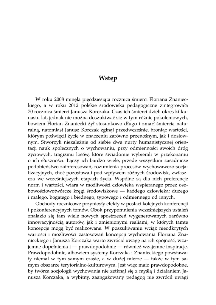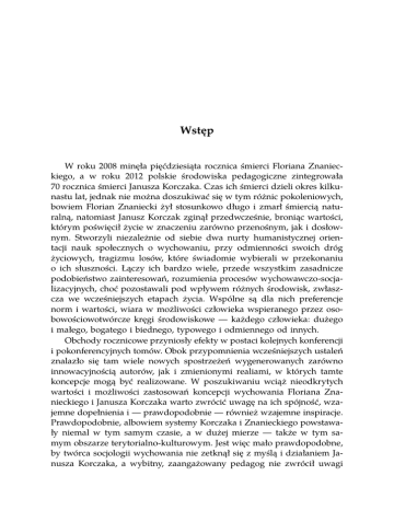 Wstęp W roku 2008 minęła pięćdziesiąta rocznica śmierci Floriana Znanieckiego, a w roku 2012 polskie środowiska pedagogiczne zintegrowała 70 rocznica śmierci Janusza Korczaka. Czas ich śmierci dzieli okres kilkunastu lat, jednak nie można doszukiwać się w tym różnic pokoleniowych, bowiem Florian Znaniecki żył stosunkowo długo i zmarł śmiercią naturalną, natomiast Janusz Korczak zginął przedwcześnie, broniąc wartości, którym poświęcił życie w znaczeniu zarówno przenośnym, jak i dosłownym. Stworzyli niezależnie od siebie dwa nurty humanistycznej orientacji nauk społecznych o wychowaniu, przy odmienności swoich dróg życiowych, tragizmu losów, które świadomie wybierali w przekonaniu o ich słuszności. Łączy ich bardzo wiele, przede wszystkim zasadnicze podobieństwo zainteresowań, rozumienia procesów wychowawczo-socjalizacyjnych, choć pozostawali pod wpływem różnych środowisk, zwłaszcza we wcześniejszych etapach życia. Wspólne są dla nich preferencje norm i wartości, wiara w możliwości człowieka wspieranego przez osobowościowotwórcze kręgi środowiskowe — każdego człowieka: dużego i małego, bogatego i biednego, typowego i odmiennego od innych. Obchody rocznicowe przyniosły efekty w postaci kolejnych konferencji i pokonferencyjnych tomów. Obok przypomnienia wcześniejszych ustaleń znalazło się tam wiele nowych spostrzeżeń wygenerowanych zarówno innowacyjnością autorów, jak i zmienionymi realiami, w których tamte koncepcje mogą być realizowane. W poszukiwaniu wciąż nieodkrytych wartości i możliwości zastosowań koncepcji wychowania Floriana Znanieckiego i Janusza Korczaka warto zwrócić uwagę na ich spójność, wzajemne dopełnienia i — prawdopodobnie — również wzajemne inspiracje. Prawdopodobnie, albowiem systemy Korczaka i Znanieckiego powstawały niemal w tym samym czasie, a w dużej mierze — także w tym samym obszarze terytorialno-kulturowym. Jest więc mało prawdopodobne, by twórca socjologii wychowania nie zetknął się z myślą i działaniem Janusza Korczaka, a wybitny, zaangażowany pedagog nie zwrócił uwagi 10 Wstęp na takie prace Znanieckiego, jak: Wprowadzenie do socjologii wychowania1 , Chłop polski w Europie i Ameryce2 czy Ludzie teraźniejsi a cywilizacja przyszłości3 . Niezależnie od możliwych bezpośrednich wpływów twórczości publikowanej niemal w tym samym czasie, Korczaka i Znanieckiego łączyło również pozostawanie pod wpływem tych samych czynników środowiskowych. Obydwaj należeli do pokolenia, które marzyło o wolności Polski i Polaków, przeżyło entuzjazm odzyskania niepodległości, obserwowało odradzanie się Ojczyzny, jej struktur społecznych, pełne nadziei na realizację ideałów, o które walczyły poprzednie pokolenia, w tym także ideałów wychowawczych. Wnikliwa obserwacja musiała być źródłem rozczarowań i frustracji, zastępujących początkową euforię. Nowa Polska, podobnie jak cała ówczesna Europa, zdominowana była przez nierówności społeczne, powszechne było odrzucenie wartości człowieka, odebranie szans na godne życie szerokim kręgom społecznym. Gdy Europa odchodziła już od najbardziej drastycznych form wyzysku, w rodzącej się polskiej rzeczywistości nędza i beznadzieja obejmowała większość społeczeństwa, w tym przede wszystkim małorolną ludność wiejską oraz mieszkańców miast pozostających bez pracy i szans na jej zdobycie. O wyjątkowym dramatyzmie sytuacji ówczesnego społeczeństwa polskiego świadczy wstrząs, jaki przeżyła Europa, zapoznając sie z tłumaczonymi wówczas na wiele języków pamiętnikami polskich chłopów i bezrobotnych4 . Od czasów Korczaka i Znanieckiego Polska przeżyła wiele kolejnych zdarzeń, także wysoce traumatycznych. Entuzjazmowi odbudowy kraju po II wojnie światowej towarzyszyło poczucie bezsilnego gniewu wobec 1 F. Znaniecki, Wprowadzenie do socjologii, Drukarnia Uniwersytetu Jagiellońskiego, Warszawa–Kraków 1928; Tenże, Wstęp do socjologii, t. 1, Komisja Pedagogiczna MWRiOP, Warszawa 1928; t. 2, Komisja Pedagogiczna MWRiOP, Warszawa 1930; Tenże, Wstęp do socjologii, Państwowe Wydawnictwo Naukowe, Warszawa 1988. 2 W. I. Thomas, F. Znaniecki, The Polish Peasant in Europe and America. Monograph of an Immigrant Group, Richard G. Badger, t. 1–2, Boston 1918; t. 3, Boston 1919; t. 4–5, Boston 1920; wyd. 2, A. A. Knopf, New York 1927 (2 tomy); wyd. 3, Dover Publ., New York 1958 (2 tomy); wyd. 4, Octagon Books, New York 1974 (2 tomy); Ciż, Chłop polski w Europie i Ameryce, tłum. z języka angielskiego, t. 1–5, Ludowa Spółdzielnia Wydawnicza, Warszawa 1976. 3 F. Znaniecki, Ludzie teraźniejsi a cywilizacja przyszłości, „Książnica-Atlas”, Warszawa 1934; Tenże, Ludzie teraźniejsi a cywilizacja przyszłości, Państwowe Wydawnictwo Naukowe, Warszawa 1974; Tenże, Ludzie teraźniejsi a cywilizacja przyszłości, Wydawnictwo Naukowe PWN, Warszawa 2001. 4 Pamiętniki bezrobotnych, nr 1–57, wstęp L. Krzywicki, Instytut Gospodarstwa Społecznego, Warszawa 1933; Pamiętniki chłopów, nr 1–51, oprac. L. Krzywicki, Instytut Gospodarstwa Społecznego, Warszawa 1935. Wstęp 11 zniewolenia ideologicznego i ekonomicznego. Utrudniało to często obiektywną ocenę rzeczywistych dokonań peerelowskiego systemu, w tym zwłaszcza wyrównania szans edukacyjnych, umożliwienia dostępności wykształcenia na wszystkich poziomach, a następnie pracy zapewniającej życie skromne, ale jednak ustabilizowane. Zdecydowana większość społeczeństwa, zmęczona przeżyciami czasu wojennego, godziła się z istniejącymi realiami, przynajmniej dopóty, dopóki nie zagrażały jej egzystencji. Jednak bunt stopniowo narastał, a jego wybuchy pisały historię powojennej Polski, począwszy od roku 1956, poprzez lata 1968, 1970, do ery „Solidarności” i jej pełnego zwycięstwa. Po roku 1989 znowu nastąpiło budowanie nowej Polski. Tym razem ni