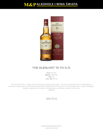 THE GLENLIVET 15 YO 0,7L Kraj: Szkocja Region: Speyside Poj.: 0,7 Zaw. Alk. %: 40 The Glenlivet 15YO – Single malt, od którego wszystko się zaczęło … 15 letnia the Glenlivet French Oak Reserve zachwyca wyrazistością uzyskaną podczas procesu dojrzewania w beczkach z francuskiego dębu z rejonu Dordogne. Bogaty i egzotyczny charakter z dominującymi aromatami owoców i orzechów. 189 PLN 189 PLN [email protected] +48 512 270 830