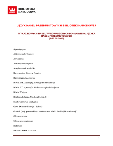 JĘZYK HASEŁ PRZEDMIOTOWYCH BIBLIOTEKI NARODOWEJ WYKAZ NOWYCH HASEŁ WPROWADZONYCH DO SŁOWNIKA JĘZYKA HASEŁ PRZEDMIOTOWYCH (9-22.08.2013) Agnostycyzm Aktorzy meksykańscy Akwaparki Albumy na fotografie Antyfonarz Gottschalka Barcelońska, diecezja (katol.) Bezrobocie długotrwałe Biblia. NT. Apokryfy. Ewangelia Bartłomieja Biblia. ST. Apokryfy. Wniebowstąpienie Izajasza Biblia Wulgata Bodleian Library. Ms. Laud Misc. 511 Duchowieństwo koptyjskie Gave d'Ossau (Francja ; dolina) Gdańsk (woj. pomorskie) – sanktuarium Matki Boskiej Brzemiennej" Gleby ochrowe Gleby rdzawoziemne Holarktis Intifada 2000 r. Al-Aksa 1 IS-2 Mucha Jasiołka (dolina) Jazydyzm Jubileusz Roku 1929 – kościół koptyjski Kulancja Kustosz Pamięci Narodowej Listy syryjskie Luperkalia Lutomskie, Jezioro Malarstwo monumentalne słowackie Martyrologia (księgi) Matka Boska Brzemienna z Matemblewa Matka Boska Podkamieńska Menologia Miasta-państwa Monochord Multibooki Muzyka na duduk Muzyka na mandolinę i fortepian Nabożeństwo żałobne Nawigacja radarowa Nazwy osobowe tatarskie Obóz hitlerowski Sajmište Ojcowie Pustyni 2 Otręby żytnie Parys Pianiści fińscy Pięcioksiąg Ashburnhama Podejźrzon wirginijski Pojazdy elektryczne Powroty Przestępstwa giełdowe Rezerwaty faunistyczne Rezerwaty krajobrazowe Rezerwaty leśne Rezerwaty słonoroślowe Rezerwaty stepowe Rękopisy albańskie (Kaukaz) Rękopisy gruzińskie Rękopisy irlandzkie Salmonelloza Seleucydów, państwo Sztuka sakralna perska Śpiewacy żydowscy Trio (skrzypce, wiolonczela i organy) Uroczystości żałobne Warszawa – pomnik Marii Skłodowskiej-Curie Zarządzanie talentami Zaśnięcie Marii (ikon.) 3