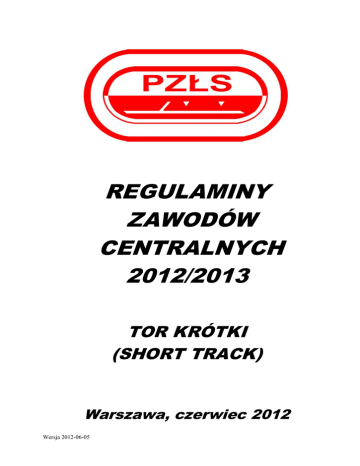 REGULAMINY ZAWODÓW CENTRALNYCH 2012/2013 TOR KRÓTKI (SHORT TRACK) Warszawa, czerwiec 2012 Wersja 2012-06-05 Spis treści:. 1. Zasady ogólne przeprowadzania zawodów........................................... 3 - 5 2. Regulamin Otwartych Mistrzostw Polski ............................................ 6 3. Regulamin Młodzieżowych Mistrzostw Polski ..................................... 7 4. Regulamin OOM - Mistrzostwa Polski Juniorów „A” ........................ 8 - 9 5. Regulamin OOM - Mistrzostwa Polski Juniorów „B” ........................ 10 - 11 6. Regulamin Międzywojewódzkich Mistrzostw Młodzików .................. 12 - 13 7. Regulamin Pucharu Polski ..................................................................... 14 - 15 8. Regulamin Ogólnopolskich Zawodów Rankingowych ........................ 16 9. Regulamin Ogólnopolskich Zawodów Uczniowskich Klubów Sportowych ............................................................................................... 17 10. Regulamin rankingu Polskiego Związku Łyżwiarstwa Szybkiego w Short-Tracku ........................................................................................ 18 - 19 11. Kalendarz zawodów centralnych PZŁS na sezon 2012/2013tor krótki .................................................................................................... 20 12. Normy czasowe na klasy sportowe ......................................................... 21 13. Normy na klasy sportowe za uzyskane miejsca .................................... 21 Wersja 2012-06-05 2 Zasady ogólne przeprowadzania zawodów w ramach kalendarza zawodów centralnych P.Z.Ł.S. 1. Organizatorem wszystkich imprez centralnych jest Polski Związek Szybkiego oraz działający z jego upoważnienia OZŁS lub klub. Łyżwiarstwa 2. W zawodach ogólnopolskich mają prawo startu zawodnicy klubów zarejestrowanych w PZŁS, posiadający ważną licencję zawodniczą w formie dokumentu (zawodnicy startujący w zawodach ogólnopolskich (od OZR) zobowiązani są do posiadania dokumentu licencji). Zawodnicy startujący w zawodach np. okręgowych powinni posiadać Nr licencji nadany przez PZŁS). 3. Dokumenty konieczne do przedstawienia podczas weryfikacji do zawodów –licencja zawodnika lub jeśli zawodnik jej nie posiada numer licencyjny PZŁS oraz aktualne badanie lekarskie. Zawodnik nie posiadający licencji lub nr licencji nie będzie dopuszczony do startu. Sędzia Główny weryfikuje zawodników na podstawie aktualnie opublikowanej listy licencjonowanych zawodników PZŁS na stronie www.pzls.pl. 4. Termin wykupienia licencji na sezon 2012/2013 upływa z dniem 15 września 2012r. Podstawą wydania licencji jest przedstawienie w biurze PZŁS opłaty licencyjnej ( od III klasy sportowej = 25zł, poniżej III klasy sportowej = 10zł) oraz zdjęcia zawodnika. Nowi zawodnicy którzy mają startować w trakcie aktualnego sezonu powinni wystąpić do PZŁS o wydanie licencji zawodniczej na minimum 5 dni przed następnymi zawodami. 5. Do udziału w zawodach kalendarzowych PZŁS obowiązują zgłoszenia imienne zawodników, które należy przesłać na adres organizatora zawodów w terminie poprzedzającym zawody na minimum 3-4 dni. Do zgłoszeń będzie wykorzystywany „System zgłoszeń elektronicznych” wykorzystujący bazę zawodników toru krótkiego. Domtel Sanok Elbląg Białystok Toruń Opole Gdańsk - [email protected] [email protected] [email protected] [email protected] [email protected] [email protected] [email protected] fax: (013) 465 91 26 fax: (055) 642 32 30 fax: (085) 742 68 01 fax: (056) 622 87 80 tel. 504-724-292 tel. 500-467-438 Zgłoszenie powinno zawierać: nazwisko i imię zawodnika, numer licencji, urodzenia (rrrr-mm-dd), przynależność klubową. Wzory zgłoszeń dostępne są na stronie internetowej PZŁS (www.pzls.pl). data 6. Zobowiązuje się sędziego weryfikującego zawodów do sporządzenia listy startowej z umieszczeniem dokładnej daty urodzenia, numeru licencji oraz nazwy klubu. 7. Zawodnik ma prawo do reprezentowania tylko jednego Klubu lub UKS-u w sezonie, zgodnie ze zgłoszeniem do PZŁS jakie dokonał Klub lub UKS (przed sezonem lub przed pierwszym startem zawodnika w sezonie – zgodnie z pkt.2). Zmiana barw klubowych bez zgody PZŁS będzie karana wykluczeniem zawodnika ze wszystkich klasyfikacji w aktualnym sezonie. Wersja 2012-06-05 3 8. Kategorie wiekowe jakie obowiązują w sezonie 2012/2013 zgodnie z systemem współzawodnictwa sportowego PZŁS oraz zgodnie z §108 przepisów ISU przedstawiają się następująco: Młodzieżowcy: Kat. M4 urodzeni od 01.07.1989 do 30.06.1990 Kat. M3 urodzeni od 01.07.1990 do 30.06.1991 Kat. M2 urodzeni od 01.07.1991 do 30.06.1992 Kat. M1 urodzeni od 01.07.1992 do 30.06.1993 Juniorzy: Kat.A2 urodzeni od 01.07.1993 do 30.06.1994 Kat. A1 urodzeni od 01.07.1994 do 30.06.1995 Juniorzy młodsi: Kat. B2 urodzeni od 01.07.1995 do 30.06.1996 Kat. B1 urodzeni od 01.07.1996 do 30.06.1997 Młodzicy: Kat. C2 urodzeni od 01.07.1997 do 30.06.1998 Kat. C1 urodzeni od 01.07.1998 do 30.06.1999 Dzieci: 13 lat - Kat. D2 urodzeni od 01.07.1999 do 30.06.1999 12 lat - Kat. D1 urodzeni od 01.07.2000 do 30.06.2001 11 lat - Kat. E2 urodzeni od 01.07.2001 do 30.06.2002 10 lat - Kat. E1 urodzeni od 01.07.2002 do 30.06.2003 9. Organizator każdych zawodów rozgrywanych w kraju zobowiązany jest do przesłania 2 kompletów protokołów na adres PZŁS i pocztą elektroniczną na adres: [email protected] oraz [email protected] . Nie dostarczenie dokumentów będzie skutkowało nie uznaniem czasów w statystykach zawodników. 10. Organizator zawodów ogólnopolskich ma obowiązek zapewnić następujące stanowiska sędziowskie: Sędzia Główny, Asystenci Sędziego Głównego x 2, Starter, Steward. Organizatorzy zawodów ogólnopolskich zobligowani są do przesłania propozycji składu sędziowskiego do Przewodniczącego Komisji Sędziowskiej (Marta Bakier – [email protected] ) przed rozpoczęciem sezonu,