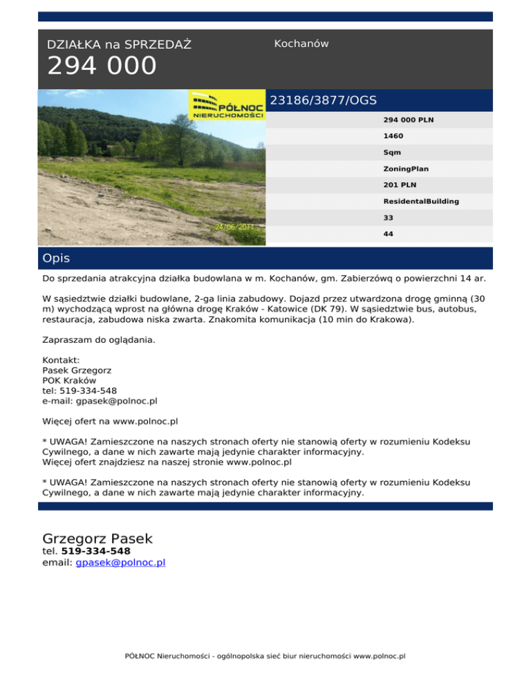 DZIAŁKA na SPRZEDAŻ Kochanów 294 000 23186/3877/OGS 294 000 PLN 1460 Sqm ZoningPlan 201 PLN ResidentalBuilding 33 44 Opis Do sprzedania atrakcyjna działka budowlana w m. Kochanów, gm. Zabierzówq o powierzchni 14 ar. W sąsiedztwie działki budowlane, 2-ga linia zabudowy. Dojazd przez utwardzona drogę gminną (30 m) wychodzącą wprost na główna drogę Kraków - Katowice (DK 79). W sąsiedztwie bus, autobus, restauracja, zabudowa niska zwarta. Znakomita komunikacja (10 min do Krakowa). Zapraszam do oglądania. Kontakt: Pasek Grzegorz POK Kraków tel: 519-334-548 e-mail: [email protected] Więcej ofert na www.polnoc.pl * UWAGA! Zamieszczone na naszych stronach oferty nie stanowią oferty w rozumieniu Kodeksu Cywilnego, a dane w nich zawarte mają jedynie charakter informacyjny. Więcej ofert znajdziesz na naszej stronie www.polnoc.pl * UWAGA! Zamieszczone na naszych stronach oferty nie stanowią oferty w rozumieniu Kodeksu Cywilnego, a dane w nich zawarte mają jedynie charakter informacyjny. Grzegorz Pasek tel. 519-334-548 email: [email protected] PÓŁNOC Nieruchomości - ogólnopolska sieć biur nieruchomości www.polnoc.pl Powered by TCPDF (www.tcpdf.org)