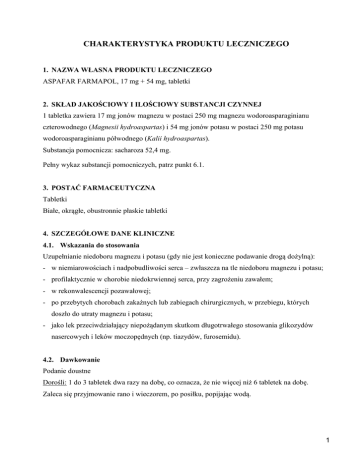 CHARAKTERYSTYKA PRODUKTU LECZNICZEGO 1. NAZWA WŁASNA PRODUKTU LECZNICZEGO ASPAFAR FARMAPOL, 17 mg + 54 mg, tabletki 2. SKŁAD JAKOŚCIOWY I ILOŚCIOWY SUBSTANCJI CZYNNEJ 1 tabletka zawiera 17 mg jonów magnezu w postaci 250 mg magnezu wodoroasparaginianu czterowodnego (Magnesii hydroaspartas) i 54 mg jonów potasu w postaci 250 mg potasu wodoroasparaginianu półwodnego (Kalii hydroaspartas). Substancja pomocnicza: sacharoza 52,4 mg. Pełny wykaz substancji pomocniczych, patrz punkt 6.1. 3. POSTAĆ FARMACEUTYCZNA Tabletki Białe, okrągłe, obustronnie płaskie tabletki 4. SZCZEGÓŁOWE DANE KLINICZNE 4.1. Wskazania do stosowania Uzupełnianie niedoboru magnezu i potasu (gdy nie jest konieczne podawanie drogą dożylną): - w niemiarowościach i nadpobudliwości serca – zwłaszcza na tle niedoboru magnezu i potasu; - profilaktycznie w chorobie niedokrwiennej serca, przy zagrożeniu zawałem; - w rekonwalescencji pozawałowej; - po przebytych chorobach zakaźnych lub zabiegach chirurgicznych, w przebiegu, których doszło do utraty magnezu i potasu; - jako lek przeciwdziałający niepożądanym skutkom długotrwałego stosowania glikozydów nasercowych i leków moczopędnych (np. tiazydów, furosemidu). 4.2. Dawkowanie Podanie doustne Dorośli: 1 do 3 tabletek dwa razy na dobę, co oznacza, że nie więcej niż 6 tabletek na dobę. Zaleca się przyjmowanie rano i wieczorem, po posiłku, popijając wodą. 1 4.3. Przeciwwskazania Produktu leczniczego nie należy stosować w nadwrażliwości na którykolwiek ze składników, ciężkiej niewydolności nerek, zakażeniach dróg moczowych, hiperkaliemii, hipermagnezemii, zaburzeniach przewodnictwa przedsionkowo-komorowego, bradykardii, myasthenia gravis. 4.4. Specjalne ostrzeżenia i środki ostrożności dotyczące stosowania Podczas długotrwałego stosowania należy kontrolować stężenie magnezu i potasu w osoczu. Ostrożnie stosować u pacjentów z chorobą wrzodową żołądka. Pacjenci z rzadkimi dziedzicznymi zaburzeniami związanymi z nietolerancją fruktozy, zespołem złego wchłaniania glukozy i galaktozy lub niedoborem sacharazy-izomaltazy, nie powinni przyjmować produktu leczniczego. 4.5. Interakcje z innymi lekami i inne rodzaje interakcji Podawanie produktu jednocześnie z antybiotykami z grupy tetracyklin, doustnymi lekami przeciwzakrzepowymi pochodnymi hydroksykumaryny, a także produktami zawierającymi fosforany, związki wapnia i żelaza, prowadzi do wzajemnego zmniejszania wchłaniania z przewodu pokarmowego. Dieta o dużej zawartości soli kuchennej (chlorku sodu) zwiększa wydalanie potasu w moczu. 4.6. Wpływ na płodność, ciążę i laktację W zalecanych dawkach produkt może być stosowany w okresie ciąży i karmienia piersią. 4.7. Wpływ na zdolność prowadzenia pojazdów i obsługiwania maszyn Aspafar Farmapol stosowany zgodnie z zaleceniami nie wpływa na zdolność kierowania pojazdami mechanicznymi, obsługę maszyn i sprawność psychofizyczną. 4.8. Działania niepożądane Nie zgłaszano przy zalecanym dawkowaniu. Możliwe jest wystąpienie hiperkaliemii z zaburzeniami rytmu serca (zwłaszcza u pacjentów z niewydolnością nerek), dolegliwości żołądkowo-jelitowych (nudności, wymioty, biegunka), uczucia metalicznego smaku. 4.9. Przedawkowanie Nie zgłoszono przypadków przedawkowania. 2 Możliwe objawy zatrucia: biegunka, nudności, zaburzenia przewodnictwa przedsionkowo-komorowego, zaburzenia oddechu, spadek ciśnienia krwi, drgawki, nużliwość mięśni, uczucie znużenia, opadanie powiek. Należy stosować leczenie objawowe, przy ciężkich objawach dożylnie podawać sole wapnia lub wykonywać dializę. 5. WŁAŚCIWOŚCI FARMAKOLOGICZNE 5.1. Właściwości farmakodynamiczne Grupa farmakoterapeutyczna: preparaty uzupełniające związki mineralne. Kod ATC: A12 Zawartość magnezu w ustroju dorosłego człowieka wynosi około 14,5 mmol/kg mc. Odpowiada to około 1000 mmol (24 g) przy masie ciała 70 kg. W przybliżeniu połowa całkowitej ilości znajduje się w postaci nierozpuszczalnej w kościach, 45% w płynie wewnątrzkomórkowym, a jedynie 5% znajduje się w płynie pozakomórkowym. Około 2% magnezu niezjonizowanego, zawartego w związkach nierozpuszczalnych i w połączeniach z białkami, podlega stałej wymianie z magnezem zjonizowanym w płynach ustrojowych. Magnez bierze udział w licznych przemianach metabolicznych w ustroju, jak synteza i wykorzystanie związków wysokoenergetycznych oraz synteza wielu enzymów. Wywiera stabilizujący wpływ na błony komórkowe. Utrzymuje stan mitochondriów, w których fosforylacja przebiega z dużą wydajnością. Magnez chroni lizosomy, potrzebny jest do utrzymania stabilności rybosomów i umożliwia wiązanie mRNA z rybosomami. Jest więc głównym stabilizatorem komórkowym i wewnątrzkomórkowym oraz bierze udział we wszystkich podstawowych czynnościach fizjologicznych. Potwierdza to fakt, iż wyraźne kliniczne objawy niedoboru magnezu można usunąć tylko przez suplementację. Magnez wykazuje działanie neurotropowe, co powoduje jego działanie uspokajające, a niedobór – nadpobudliwość nerwowo-mięśniową. Wywiera depresyjne działanie na autonomiczny układ nerwowy, a w nadmiarze doprowadzić może do porażenia zwojów nerwowych. Zmniejsza także pobudliwość włókien mięśniowych poprzecznie prążkowanych. Magnez wywiera ochronny wpływ na mięsień sercowy, zmniejszając jego niedotlenienie. Wydłuża czas przewodzenia bodźców w układzie bodźcoprzewodzącym. Przeciwdziała gromadzeniu wapnia i zmianom tkanki łącznej w ścianach naczyń. Jest także fizjologicznym czynnikiem przeciwzakrzepowym stabilizującym płytki krwi. Usprawnia fagocytozę i wytwarzanie limfocytów, co prowadzi do złagodzenia procesu zapalnego. 3 Magnez bierze udział w rozwoju i mineralizacji kości, a jego niedobór powoduje szybsze starzenie się tkanki kostnej. Jest również niezbędny do syntezy niektórych hormonów, np. insuliny. Ma