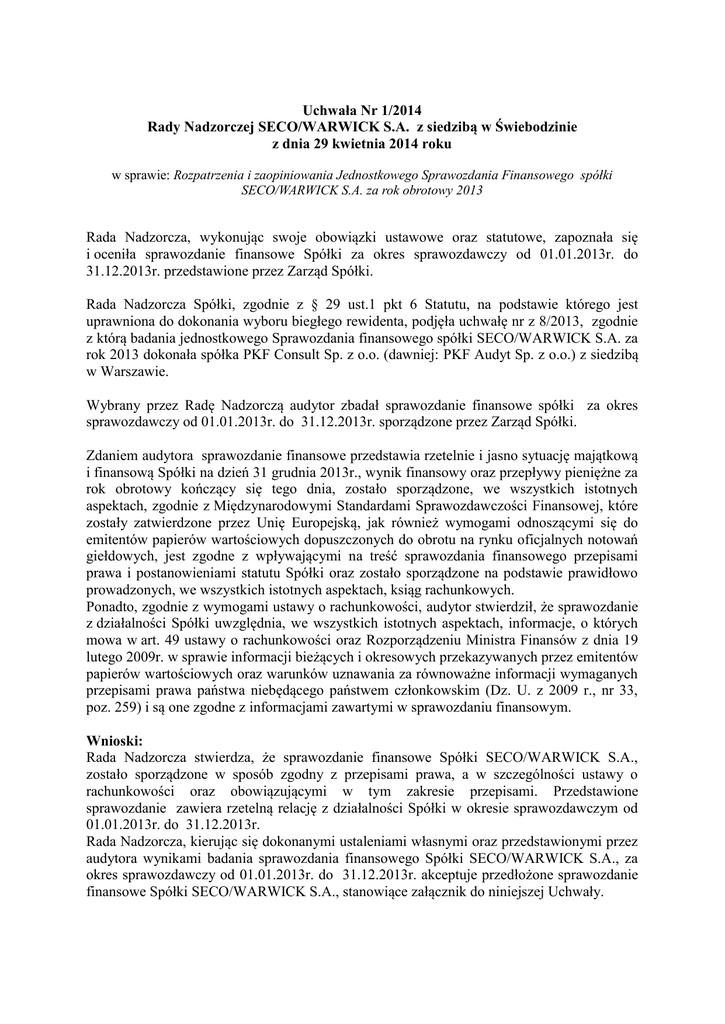 Uchwała Nr 1/2014 Rady Nadzorczej SECO/WARWICK S.A. z siedzibą w Świebodzinie z dnia 29 kwietnia 2014 roku w sprawie: Rozpatrzenia i zaopiniowania Jednostkowego Sprawozdania Finansowego spółki SECO/WARWICK S.A. za rok obrotowy 2013 Rada Nadzorcza, wykonując swoje obowiązki ustawowe oraz statutowe, zapoznała się i oceniła sprawozdanie finansowe Spółki za okres sprawozdawczy od 01.01.2013r. do 31.12.2013r. przedstawione przez Zarząd Spółki. Rada Nadzorcza Spółki, zgodnie z § 29 ust.1 pkt 6 Statutu, na podstawie którego jest uprawniona do dokonania wyboru biegłego rewidenta, podjęła uchwałę nr z 8/2013, zgodnie z którą badania jednostkowego Sprawozdania finansowego spółki SECO/WARWICK S.A. za rok 2013 dokonała spółka PKF Consult Sp. z o.o. (dawniej: PKF Audyt Sp. z o.o.) z siedzibą w Warszawie. Wybrany przez Radę Nadzorczą audytor zbadał sprawozdanie finansowe spółki za okres sprawozdawczy od 01.01.2013r. do 31.12.2013r. sporządzone przez Zarząd Spółki. Zdaniem audytora sprawozdanie finansowe przedstawia rzetelnie i jasno sytuację majątkową i finansową Spółki na dzień 31 grudnia 2013r., wynik finansowy oraz przepływy pieniężne za rok obrotowy kończący się tego dnia, zostało sporządzone, we wszystkich istotnych aspektach, zgodnie z Międzynarodowymi Standardami Sprawozdawczości Finansowej, które zostały zatwierdzone przez Unię Europejską, jak również wymogami odnoszącymi się do emitentów papierów wartościowych dopuszczonych do obrotu na rynku oficjalnych notowań giełdowych, jest zgodne z wpływającymi na treść sprawozdania finansowego przepisami prawa i postanowieniami statutu Spółki oraz zostało sporządzone na podstawie prawidłowo prowadzonych, we wszystkich istotnych aspektach, ksiąg rachunkowych. Ponadto, zgodnie z wymogami ustawy o rachunkowości, audytor stwierdził, że sprawozdanie z działalności Spółki uwzględnia, we wszystkich istotnych aspektach, informacje, o których mowa w art. 49 ustawy o rachunkowości oraz Rozporządzeniu Ministra Finansów z dnia 19 lutego 2009r. w sprawie informacji bieżących i okresowych przekazywanych przez emitentów papierów wartościowych oraz warunków uznawania za równoważne informacji wymaganych przepisami prawa państwa niebędącego państwem członkowskim (Dz. U. z 2009 r., nr 33, poz. 259) i są one zgodne z informacjami zawartymi w sprawozdaniu finansowym. Wnioski: Rada Nadzorcza stwierdza, że sprawozdanie finansowe Spółki SECO/WARWICK S.A., zostało sporządzone w sposób zgodny z przepisami prawa, a w szczególności ustawy o rachunkowości oraz obowiązującymi w tym zakresie przepisami. Przedstawione sprawozdanie zawiera rzetelną relację z działalności Spółki w okresie sprawozdawczym od 01.01.2013r. do 31.12.2013r. Rada Nadzorcza, kierując się dokonanymi ustaleniami własnymi oraz przedstawionymi przez audytora wynikami badania sprawozdania finansowego Spółki SECO/WARWICK S.A., za okres sprawozdawczy od 01.01.2013r. do 31.12.2013r. akceptuje przedłożone sprawozdanie finansowe Spółki SECO/WARWICK S.A., stanowiące załącznik do niniejszej Uchwały. Uchwała wchodzi w życie z dniem podjęcia. Głosowanie przeprowadzono w trybie jawnym. Liczba obecnych członków Rady Nadzorczej:________ Liczba głosów "za" przyjęciem uchwały:________ Liczba głosów "przeciw": ________ Liczba głosów "wstrzymujących się": ________