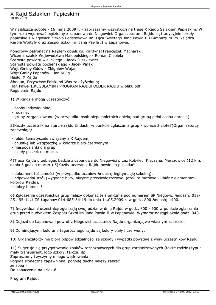 Niegowić - Papieska Parafia X Rajd Szlakiem Papieskim 10.05.2009. W najbliższą sobotę - 16 maja 2009 r. - zapraszamy wszystkich na trasę X Rajdu Szlakiem Papieskim. W tym roku wędrować będziemy z Łapanowa do Niegowici. Organizatorami Rajdu są tradycyjnie szkoły papieskie z Niegowici: Szkoła Podstawowa im. Ojca Świętego Jana Pawła II i Gimnazjum im. księdza Karola Wojtyły oraz Zespół Szkół im. Jana Pawła II w Łapanowie. honorowy patronat na Rajdem objęli:Ks. Kardynał Franciszek Macharski, Wicemarszałek Województwa Małopolskiego - Roman Ciepiela Starosta powiatu wielickiego - Jacek Juszkiewicz Starosta powiatu bocheńskiego - Jacek Pająk Wójt Gminy Gdów - Zbigniew Wojas Wójt Gminy Łapanów - Jan Kulig Hasło X Rajdu „ Przyszłość Polski od Was zależy” Jan Paweł IIREGULAMIN i PROGRAM RAJDUFOLDER RAJDU w pliku pdf Regulamin Rajdu: 1) W Rajdzie mogą uczestniczyć: - osoby indywidualne, - rodziny, - grupy zorganizowane (w przypadku osób niepełnoletnich opiekę nad grupą pełni osoba dorosła). 2)Każdy uczestnik na starcie rajdu – w punkcie zgłaszania grup - wpłaca 2 złote3)Organizatorzy zapewniają: - folder tematycznie związany z X Rajdem, chustkę lub wstążeczkę w kolorze biało-czerwonym niespodzianki dla grup, ciepły posiłek na mecie. 4)Trasa Rajdu przebiegać będzie z Łapanowa do Niegowici przez Kobylec, Klęczaną, Marszowice (12 km, około 3 godzin marszu).5)Każdy uczestnik Rajdu powinien posiadać: - dokument tożsamości (w przypadku uczniów – legitymację szkolną), - odpowiedni strój (wygodne buty, okrycie przeciwdeszczowe, jeżeli to możliwe - ubiór z elementami kolorów Rajdu), - dobry humor !!! 6) Zgłoszenia uczestnictwa grup należy dokonać telefonicznie pod numerem SP Niegowić – 012251-95-14, i ZS Łapanów 014-685-34-19 do dnia 14.05.2009 r. w godz. 800 – 1400. 7) Indywidualni uczestnicy zgłaszają swój udział w dniu Rajdu w godz. 800 - 900 w punkcie zgłaszania grup przed budynkiem Zespołu Szkół im Jana Pawła II w Łapanowie. Wymarsz nastąpi około godz. 940. 8) Dojazd do Łapanowa i powrót z Niegowici uczestnicy Rajdu organizują we własnym zakresie. 9) Dominującymi kolorami tegorocznego rajdu są kolory biały i czerwony. 10) Organizatorzy nie biorą odpowiedzialności za szkody i wypadki powstałe z winy uczestników Rajdu. 11) Sugeruje się przygotowanie znaków rozpoznawczych dla grup zorganizowanych (także rodzin) typu: mały transparent, logo szkoły, tarcza, itp. Zapraszamy i życzymy miłego wędrowania! Pogoda słoneczna zapewniona, pogodę ducha należy zabrać ze sobą ! Do zobaczenia na szlaku! Program Rajdu: http://parafia.niegowic.pl Kreator PDF Utworzono 6 March, 2017, 23:57 Niegowić - Papieska Parafia 800 – 900 zapisy i wpłaty uczestników Rajdu na placu przy Zespole Szkół im. Jana Pawła II w Łapanowie; odbieranie gadżetów, wstążeczek i numerowanych biletów uczestnictwa, które są losami uprawniającymi do wzięcia udziału w losowaniu nagród na mecie Rajdu w Niegowici. 900 - ogłoszenie wyników konkursu literackiego - wręczenie nagród i wyróżnień. 930 – krótka modlitwa w kościele parafialnym 940 – wymarsz na trasę Rajdu (jako pierwsze wyruszają grupy najmłodsze wiekowo). ok. 1230 – przyjmowanie grup w Niegowici, zwiedzanie kościoła (replika grobu Jana PawłaII) 1300 – losowanie nagród rzeczowych, w tym kilku rowerów górskich dla ,,Szczęściarzy” Rajdu, ciepły posiłek, wspólne zabawy, inne atrakcje.DO ZOBACZENIA NA SZLAKU http://parafia.niegowic.pl Kreator PDF Utworzono 6 March, 2017, 23:57