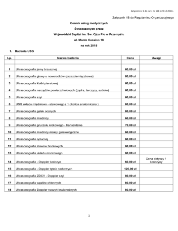 Załącznik nr 1 do zarz. Nr 158 z 29.12.2014r. Załącznik 1B do Regulaminu Organizacyjnego Cennik usług medycznych Świadczonych przez Wojewódzki Szpital im. Św. Ojca Pio w Przemyślu ul. Monte Cassino 18 na rok 2015 1. Badania USG Lp. Nazwa badania Cena 1 Ultrasonografia jamy brzusznej 60,00 zł 2 Ultrasonografia głowy u noworodków (przezciemiączkowe) 80,00 zł 3 Ultrasonografia klatki piersiowej 60,00 zł 4 Ultrasonografia narządów powierzchniowych ( jądra, tarczycy, sutków) 60,00 zł 5 Ultrasonografia szyi 60,00 zł 6 USG układu mięśniowo - stawowego ( 1 okolica anatomiczna ) 80,00 zł 7 Ultrasonografia gałek ocznych 80,00 zł 8 Ultrasonografia miednicy 60,00 zł 9 Ultrasonografia gruczołu krokowego - transektalne 70,00 zł 10 Ultrasonografia miednicy małej i ginekologiczne 60,00 zł 11 Ultrasonografia opłucnej 60,00 zł 12 Ultrasonografia stawów biodrowych 60,00 zł 13 Ultrasonografia układu moczowego 60,00 zł 14 Ultrasonografia - Doppler kończyn 60,00 zł 15 Ultrasonografia - Doppler tętnic nerkowych 120,00 zł 16 Ultrasonografia ZDCV - Doppler szyi 80,00 zł 17 Ultrasonografia węzłów chłonnych 80,00 zł 18 Ultrasonografia Doppler naczyń krwionośnych 80,00 zł 1 Uwagi Cena dotyczy 1 kończyny Załącznik nr 1 do zarz. Nr 158 z 29.12.2014r. 2. Konsultacje Lp. Nazwa badania Cena 1 Oddział Chorób Wewnętrznych i Diabetologii 80,00 zł 2 Oddział Kardiologii z Pododdziałem Intensywnego Nadzoru Kardiologicznego 80,00 zł 3 Oddział Okulistyczny 80,00 zł 4 Oddział Pulmonologiczny 80,00 zł 5 Oddział Chirurgii Ogólnej z Pododdziałem Chirurgii Onkologicznej 80,00 zł 6 Oddział Urologiczny 80,00 zł 7 Oddział Dermatologiczny 80,00 zł 8 Oddział Obserwacyjno - Zakaźny 80,00 zł 9 Oddział Chirurgii Urazowo - Ortopedycznej 80,00 zł 10 Oddział Otolaryngologiczny 80,00 zł 11 Oddział Chorób Dzieci z Pododdziałem Pulmonologii Dziecięcej 80,00 zł 12 Oddział Neonatologiczny z Pododdziałem Patologii Noworodka 80,00 zł 13 Oddział Ginekologiczny - Położniczy 80,00 zł 14 Oddział Chirurgiczny dla Dzieci 80,00 zł 15 Oddział Neurologiczny z Pododdziałem Udarowym 80,00 zł 16 Oddział Reumatologiczny 80,00 zł 17 Oddział Anestezjologii i Intensywnej Terapii z Pododdziałem Toksykologii 80,00 zł 18 Oddział Gastroenterologiczny 80,00 zł 19 Oddział Rehabilitacji z Pododdziałem Rehabilitacji Neurologicznej 80,00 zł 20 Oddział Onkologiczny z Pododdziałem Dziennej Chemioterapii 80,00 zł 21 Oddział Chirurgii Naczyniowej 80,00 zł 1 Poradnia Rehabilitacyjna 80,00 zł 2 Poradnia Gastroenterologiczna dla Dorosłych 80,00 zł 3 Poradnia Urazowo - Ortopedyczna dla Dorosłych 80,00 zł 4 Poradnia Onkologiczna 80,00 zł 5 Poradnia Gruźlicy i Chorób Płuc 80,00 zł 6 Poradnia Urologiczna 80,00 zł 7 Poradnia Chorób Zakaźnych 80,00 zł 8 Poradnia Kardiologiczna 80,00 zł 9 Poradnia Chirurgiczna 80,00 zł 10 Poradnia Ginekologiczno - Położnicza 80,00 zł 11 Poradnia Urazowo - Ortopedyczna dla Dzieci 80,00 zł 12 80,00 zł 13 Poradnia Chirurgii Dziecięcej Poradnia Foniatryczna ( nauka oddychania, prawidłowej funkcji zakresu głosu, czasu fonacji). 90,00 zł 14 Poradnia Chorób Piersi 80,00 zł 15 Poradnia Laryngologiczna 80,00 zł 16 Poradnia Dermatologiczna 80,00 zł 17 Poradnia Reumatologiczna 80,00 zł 18 Poradnia Chirurgii Naczyniowej 80,00 zł 1 Konsultacja Endokrynologiczna 80,00 zł 2 Konsultacja Hematologiczna 80,00 zł 2 Załącznik nr 1 do zarz. Nr 158 z 29.12.2014r. 3 Konsultacja Psychologiczna 80,00 zł UWAGA: Do ceny konsultacji należy doliczyć koszt dodatkowych badań. 3. Badania Kardiologiczne Lp. Nazwa badania Cena 1 Holter ciśnieniowy 24 h 140,00 zł 2 Holter EKG 140,00 zł 3 Echokardiografia 100,00 zł 4 EKG wysiłowe 4. Badania w Poradni Gruźlicy i Chorób Płuc Lp. 100,00 zł Nazwa Badania Cena 1 Próba tuberkulinowa 50,00 zł 2 Testy skórne - 10 alergenów 80,00 zł 3 Monitorowanie pulsoksymetryczne 18,00 zł 4 Elektrokardiogram z opisem 30,00 zł 5 Wstrzyknięcie substancji leczniczej lub profilaktycznej 20,00 zł 6 Spirometria 35,00 zł 7 Spirometria + próba rozkurczowa 70,00 zł 5. EEG Lp. 1 NAZWA BADANIA CENA Elektroencefalogram - EEG W cenie badania EEG zawarty jest opis. 70,00 zł 6. BRONCHOSKOPIA Lp. Nazwa świadczenia Cena 1 Usunięcie ciała obcego ze światła tchawicy bez nacięcia 570,00 zł 2 Endoskopowa biopsja oskrzela 650,00 zł 3 Bronchoskopia fiberoskopowa 550,00 zł 4 Bronchoskopia fiberoskopowa - TBNA 900,00 zł 5 Bronchoskopia fiberoskopowa wraz z materiałem pobranym na cytologie Uwaga: W cenie badania nie ujęto ceny badań histopatologicznych i cytologicznych 680,00 zł 7. Badania w Pracowni Cytologii i Histopatologii Lp. Nazwa badania Cena 1 Cytodiagnostyka złuszczeniowa rozmazu nieginekologicznego (popłuczyny oskrzelowe, płyny z jam ciała, plwocina) 80,00 zł 2 Badanie histopatologiczne (za bloczek parafinowy) 30,00 zł 3 Badanie śródoperacyjne jednego narządu bez względu na ilość wycinków - łącznie z barwieniami dodatkowymi 100,00 zł 3 Załącznik nr 1 do zarz. Nr 158 z 29.12.2014r. 4 Biopsja aspiracyjna cienkoigłowa - BAC 90,00 zł 5 Cytodiagnostyka rozmazu ginekologicznego - badanie wykonywane podwykonawcy u 25,00 zł 8. Zakład Patomorfologii Lp. Nazwa badania Cena netto Vat Cena brutto 1 Administracyjna sekcja zwłok wraz z kosztami materiałowymi 300,00 zł 23% 369,00 zł 2 Koszty materiałowe sekcji 50,00 zł 23% 61,50 zł 3 Przechowywanie zwłok ( cena za rozpoczętą dobę za jedne zwłoki) 60,00 zł 8% 64,80 zł 4 Przechowywanie zwłok w chłodni Zakładu Patomorfologii dla pacjentów, których zgon nastąpił w Wojewódzkim Szpitalu im. Św. Ojca Pio w Przemyślu. * 60,00 zł 8% 64,80 zł 5 Transport zwłok 30,00 zł 23% 36,90 zł Uwagi * - Cena za każdą rozpoczętą dobę po upływie 72 godzin od daty przyjęcia zwłok z wyłączeniem dni w których Zakład Patomorfologii nie pracuje. 9. Badania w Pracowni Prątka Gruźlicy Lp. Nazwa badania Cena 1 Posiew materiału