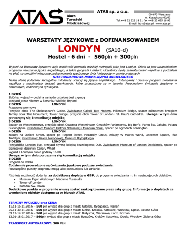 ATAS sp. z o.o. Biuro Turystyki Młodzieżowej 00-673 Warszawa ul. Koszykowa 60/62 Tel.+48 22 625 18 51 fax +48 22 625 16 92 E-mail: [email protected] www.atas.pl WARSZTATY JĘZYKOWE z DOFINANSOWANIEM LONDYN (SA10-d) Hostel - 6 dni - 560pln + 300pln Wyjazd na Warsztaty Językowe daje możliwość poznania wielkiej metropolii jaką jest Londyn. Oferta ta jest uzupełnieniem programu nauczania języka angielskiego, a także geografii i historii. Uczestnicy będą zakwaterowani wspólnie z podziałem na płeć, co umożliwi wieczorne podsumowania spędzonego dnia i integrację w gronie znajomych. NIESTANDARDOWA NAUKA JĘZYKA ANGIELSKIEGO Naszą ofertę polecamy szczególnie młodzieży uczącej się języka angielskiego. Intensywny i ciekawy program zwiedzania współgra z możliwością ćwiczeń językowych, które prowadzone są w terenie. Proponujemy ćwiczenia językowe w naturalnych, codziennych sytuacjach. 1 DZIEŃ Zbiórka, wyjazd – godzina wyjazdu ustalona jest z grupą przejazd przez Niemcy w kierunku Wielkiej Brytanii 2 DZIEŃ LONDYN Przeprawa promowa Przejście obok The Shakespeare's Globe. Zwiedzanie Galerii Tate Modern, Millenium Bridge, spacer północnym brzegiem Tamizy obok The Monument, Tower Bridge, przejście obok Tower of London i St. Paul's Cathedral. Uwaga: w tym dniu poruszamy się komunikacją miejską 3 DZIEŃ LONDYN Spacer po Westminsterze, przejście obok Opactwa Westminster, Gmachów Parlamentu, Big Ben'a, Parku Św. Jakuba, Pałacu Buckingham. Zwiedzanie: Muzeum Historii Naturalnej i Muzeum Nauki, spacer po ogrodach Kensington 4 DZIEŃ LONDYN zakupy na Oxford Street, spacer po Regent Street, Piccadilly Circus, zakupy w M&M's World, Leicester Square, Plac Trafalgar. Zwiedzanie: Galerii Narodowej, Muzeum Brytyjskiego 5 DZIEŃ LONDYN Przejażdżka London Eye, przejazd słynną kolejką bezzałogową DLR. Zwiedzanie: Muzeum of London Docklands, spacer po biznesowej dzielnicy Canary Wharf wyjazd z Londynu około godziny 16.00 Uwaga: w tym dniu poruszamy się komunikacją miejską 6 DZIEŃ Przyjazd do Polski Codziennie prowadzone są ćwiczenia językowe podczas zwiedzania. Poszczególne punkty programu mogą ulec przesunięciu lub zmianie. *Istnieje możliwość dodania, za dodatkową dopłatą w GBP, do programu zwiedzania m. in. następujących obiektów: Muzeum Figur Woskowych Madame Tussaud's Tower of London Katedra Św. Pawła Dodatkowe punkty w programie muszą zostać zaakceptowane przez całą grupę. Informacje o dopłatach za wymienione obiekty dostępne są w biurach ATAS. TERMINY WYJAZDU oraz CENA: 11.11-16.11.2016 – 560 pln wyjazd dla grup z miast: Gdańsk, Bydgoszcz, Poznań 25.11-30.11.2016 – 560 pln wyjazd dla grup z miast: Kielce, Kraków, Katowice, Wrocław, Opole, Zielona Góra 09.12-14.12.2016 – 560 pln wyjazd dla grup z miast: Białystok, Warszawa, Łódź, Poznań 13.01-18.01.2017 – 560pln wyjazd dla grup z miast: Rzeszów, Kraków, Katowice, Opole, Wrocław, Zielona Góra TRANSPORT AUTOKAROWY: 300 PLN. GRUPA: 25 uczestników + 2 nauczycieli Uwaga: warunkiem realizacji wyjazdu jest zgłoszenie się 2 grup po 25 uczestników + 2 nauczycieli w tym samym terminie (grupy autokarowej 50 uczniów i 4 nauczycieli). WIEK UCZESTNIKÓW: 12 - 18 lat DOPŁATY: – – – – – – podstawienie autokaru: + 50 PLN/os. - Białystok, Rzeszów dobrowolne ubezpieczenie od kosztów rezygnacji – 3% całkowitej ceny imprezy (w ciągu 3 dni roboczych od podpisania umowy) dopłata za podstawienie autokaru w przypadku wyjazdu z miejscowości oddalonych od podanych miast więcej niż 60 km (możliwość podstawienia autokaru oraz kwota dopłaty do uzgodnienia w biurach ATAS) 100 pln/osobę powyżej 18 roku życia ubezpieczenie od chorób przewlekłych (nie objęte głównym ubezpieczeniem) – ok. 15 PLN/dzień CENA NIE OBEJMUJE: - biletów wstępów i realizacji programu: Młodzież <16- 40 GBP. Młodzież ≥16 50 GBP Nauczyciele i Dorośli – 60 GBP - dodatkowo można zamówić 3 x pakowany lunch – 100 PLN/osobę ŚWIADCZENIA ZAWARTE W CENIE: przejazd komfortowym autokarem przeprawa promowa zakwaterowanie: 3 noclegi w Londynie wyżywienie: 3 śniadania, 3 obiadokolacje zeszyt ćwiczeń opieka pilota ubezpieczenia NNW i KL, bagaż AXA ZAKWATEROWANIE I WYŻYWIENIE: Zakwaterowanie w hostelu Via Lewisham w Londynie. Hostel z dużym ogrodem i salą wspólną. Pokoje wieloosobowe z piętrowymi łóżkami i łazienkami. Wyżywienie: śniadania (płatki na mleku, tosty z dżemem, sok, herbata), obiadokolacje (jednodaniowy ciepły posiłek, herbata). Posiłki przygotowane są i serwowane w hostelu. Wyjazd z nauką języka. Warsztaty językowe dofinansowane zostały przez Wydawnictwo Macmillan Polska sp. z o.o. oraz Fundację FRATE.