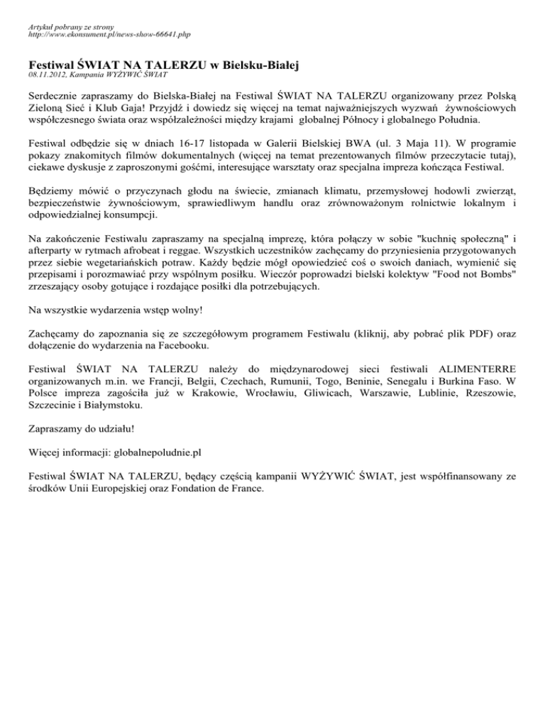 Artykuł pobrany ze strony http://www.ekonsument.pl/news-show-66641.php Festiwal ŚWIAT NA TALERZU w Bielsku-Białej 08.11.2012, Kampania WYŻYWIĆ ŚWIAT Serdecznie zapraszamy do Bielska-Białej na Festiwal ŚWIAT NA TALERZU organizowany przez Polską Zieloną Sieć i Klub Gaja! Przyjdź i dowiedz się więcej na temat najważniejszych wyzwań żywnościowych współczesnego świata oraz współzależności między krajami globalnej Północy i globalnego Południa. Festiwal odbędzie się w dniach 16-17 listopada w Galerii Bielskiej BWA (ul. 3 Maja 11). W programie pokazy znakomitych filmów dokumentalnych (więcej na temat prezentowanych filmów przeczytacie tutaj), ciekawe dyskusje z zaproszonymi gośćmi, interesujące warsztaty oraz specjalna impreza kończąca Festiwal. Będziemy mówić o przyczynach głodu na świecie, zmianach klimatu, przemysłowej hodowli zwierząt, bezpieczeństwie żywnościowym, sprawiedliwym handlu oraz zrównoważonym rolnictwie lokalnym i odpowiedzialnej konsumpcji. Na zakończenie Festiwalu zapraszamy na specjalną imprezę, która połączy w sobie "kuchnię społeczną" i afterparty w rytmach afrobeat i reggae. Wszystkich uczestników zachęcamy do przyniesienia przygotowanych przez siebie wegetariańskich potraw. Każdy będzie mógł opowiedzieć coś o swoich daniach, wymienić się przepisami i porozmawiać przy wspólnym posiłku. Wieczór poprowadzi bielski kolektyw "Food not Bombs" zrzeszający osoby gotujące i rozdające posiłki dla potrzebujących. Na wszystkie wydarzenia wstęp wolny! Zachęcamy do zapoznania się ze szczegółowym programem Festiwalu (kliknij, aby pobrać plik PDF) oraz dołączenie do wydarzenia na Facebooku. Festiwal ŚWIAT NA TALERZU należy do międzynarodowej sieci festiwali ALIMENTERRE organizowanych m.in. we Francji, Belgii, Czechach, Rumunii, Togo, Beninie, Senegalu i Burkina Faso. W Polsce impreza zagościła już w Krakowie, Wrocławiu, Gliwicach, Warszawie, Lublinie, Rzeszowie, Szczecinie i Białymstoku. Zapraszamy do udziału! Więcej informacji: globalnepoludnie.pl Festiwal ŚWIAT NA TALERZU, będący częścią kampanii WYŻYWIĆ ŚWIAT, jest współfinansowany ze środków Unii Europejskiej oraz Fondation de France.