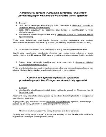Komunikat w sprawie wydawania świadectw i dyplomów potwierdzających kwalifikacje w zawodzie (nowy egzamin) 1. Dotyczy: osób, które ukończyły kwalifikacyjny kurs zawodowy i deklarację składały do Okręgowej Komisji Egzaminacyjnej, osób, które przystąpiły do egzaminu zawodowego w kwalifikacjach w trybie eksternistycznym, absolwentów zlikwidowanych szkół, którzy deklarację składali do Okręgowej Komisji Egzaminacyjnej. Wyniki oraz świadectwa, ewentualnie dyplomy, zostaną przekazane ww. osobom bezpośrednio za pośrednictwem Poczty Polskiej (list polecony za potwierdzeniem odbioru). 2. Uczniowie i absolwenci szkół zawodowych, którzy deklarację składali w szkole: Wyniki oraz świadectwa, ewentualnie dyplomy, ww. osoby mogą odebrać w szkole macierzystej od dnia 26 sierpnia 2016 roku, w godzinach ustalonych przez dyrektora szkoły. 3. Osoby, które ukończyły kwalifikacyjny kurs zawodowy i deklarację składały w podmiocie prowadzącym kurs: Wyniki oraz świadectwa, ewentualnie dyplomy, mogą odebrać w podmiocie prowadzącym kurs od dnia 26 sierpnia 2016 roku, w godzinach ustalonych przez dyrektora. Komunikat w sprawie wydawania dyplomów potwierdzających kwalifikacje zawodowe (stary egzamin) Dotyczy: absolwentów zlikwidowanych szkół, którzy deklarację składali do Okręgowej Komisji Egzaminacyjnej. Absolwent, który zdawał oba etapy zgłasza się po odbiór do szkoły/placówki, w której zdawał etap pisemny egzaminu. W przypadku, gdy absolwent zdawał wyłącznie etap praktyczny egzaminu zawodowego – zgłasza się do szkoły, placówki, w której etap praktyczny zdawał. Absolwenci szkół zawodowych, którzy deklaracje składali w szkołach: Dyplomy ww. osoby mogą odebrać w szkole macierzystej od dnia 26 sierpnia 2016 roku, w godzinach ustalonych przez dyrektora szkoły.