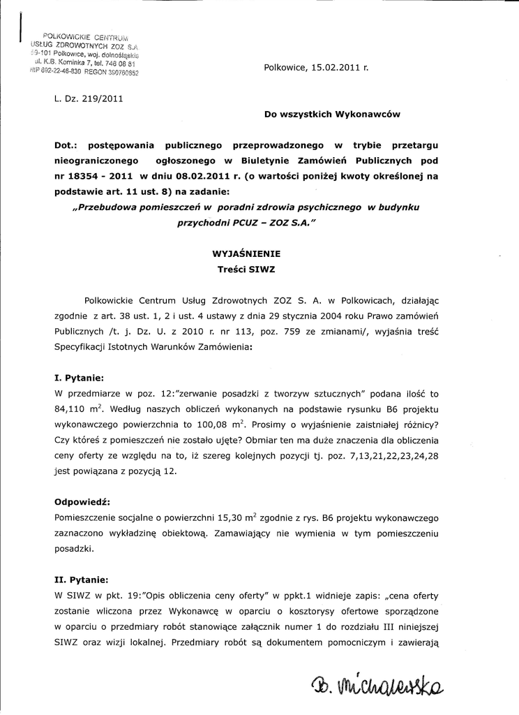 POLKOWiCKiE CEi\jTFłUiV, USŁUG lDRO\NOTNYCH ZOZ S.A 5')-101 Połkowice woj dOlmy1;!'"d,·i.: ul. K.8, Kominka' 7, t~1. 746J~;,~;"o ,'HP 6~12·22-46··830 Polkowice, 15.02.2011 r. REGON 380760852 L. Dz. 219/2011 Do wszystkich Wykonawców Dot.: postępowania nieograniczonego nr 18354 - 2011 publicznego ogłoszonego w w dniu 08.02.2011 przeprowadzonego Biuletynie w Zamówień trybie przetargu Publicznych pod r. (o wartości poniżej kwoty określonej na podstawie art. 11 ust. 8) na zadanie: "Przebudowa pomieszczeń w poradni zdrowia psychicznego w budynku przychodni PCUZ - ZOZ S.A. " WYJAŚNIENIE Treści SIWZ Polkowickie Centrum Usług Zdrowotnych ZOZ S. A. w Polkowicach, działając zgodnie z art. 38 ust. 1, 2 i ust. 4 ustawy z dnia 29 stycznia 2004 roku Prawo zamówień Publicznych /t. j. Dz. U. z 2010 r. nr 113, poz. 759 ze zrnianami/, wyjaśnia treść Specyfikacji Istotnych Warunków Zamówienia: I. Pytanie: W przedmiarze w poz. 12:"zerwanie posadzki z tworzyw sztucznych" podana ilość to 84,110 rrr', Według naszych obliczeń wykonanych na podstawie rysunku 86 projektu wykonawczego powierzchnia to 100,08 rrr'. Prosimy o wyjaśnienie zaistniałej różnicy? Czy któreś z pomieszczeń nie zostało ujęte? Obmiar ten ma duże znaczenia dla obliczenia ceny oferty ze względu na to, iż szereg kolejnych pozycji tj. poz. 7,13,21,22,23,24,28 jest powiązana z pozycją 12. Odpowiedź: Pomieszczenie socjalne o powierzchni 15,30 m2 zgodnie z rys. 86 projektu wykonawczego zaznaczono wykładzinę obiektową. Zamawiający nie wymienia w tym pomieszczeniu posadzki. II. Pytanie: W SIWZ w pkt. 19:"Opis obliczenia ceny oferty" w ppkt.1 widnieje zapis: "cena oferty zostanie wliczona przez Wykonawcę w oparciu o kosztorysy ofertowe sporządzone w oparciu o przedmiary robót stanowiące załącznik numer 1 do rozdziału III niniejszej SIWZ oraz wizji lokalnej. Przedmiary robót są dokumentem pomocniczym i zawierają zakres podstawowy". Prosimy o wyjaśnienie, czy w przypadku wystąpienia robót dodatkowych będą one osobno rozliczane? Jeżeli tak to w jaki sposób? Odpowiedź: Jeżeli wystąpi konieczność wykonania dodatkowych robót, nie ujętych w przedmiarze robót, a wynikających z dokumentacji projektowej, Wykonawca będzie zobowiązany do ich wykonania a rozliczenie nastąpi po ich wykonaniu na podstawie przedstawionego kosztorysu powykonawczego, w ramach zamówienia uzupełniającego. Specyfikacja Istotnych Warunków Zamówienia pozostaje niezmieniona. Jednocześnie informujemy, że: 1. Termin składania ofert został wyznaczony na dzień: 23 luty 2011 r. na godz. 12:00. 2. Ofertę należy złożyć w Polkowickim Centrum Usług Zdrowotnych - ZOZ S.A., ul. K. B. Kominka 7, 59-101 Polkowice (Sekretariat). 3. Termin otwarcia ofert został wyznaczony w tym samym dniu o godz. 12:30 w miejscu: Polkowickie Centrum Usług Zdrowotnych - ZOZ S.A., przy ul. K. B. Kominka w Polkowicach w Sali konferencyjnej (I piętro). POU,OWICKIE CENTRUM USŁUG ZDROWOTNYCH-ZOZ S.A. 59-101 Potkowice, ·A/Oj. dolnośląskie ul. K.S. Kominka 7, tet. 746-08-00 NIP 692·22-46-BM R~9on 3907/>0252 W imieniu Zamawiającego PREZF(§rt~~~~~~ ~·Be~~~~~ (podpis kierownika Zamawiającego)
