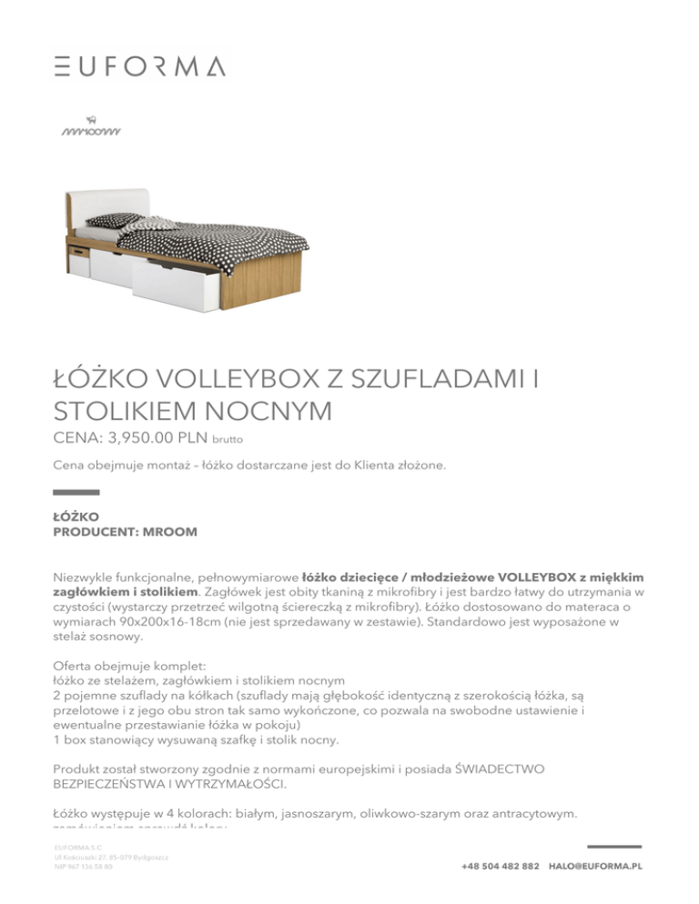 ŁÓŻKO VOLLEYBOX Z SZUFLADAMI I STOLIKIEM NOCNYM CENA: 3,950.00 PLN brutto Cena obejmuje montaż – łóżko dostarczane jest do Klienta złożone. ŁÓŻKO PRODUCENT: MROOM Niezwykle funkcjonalne, pełnowymiarowe łóżko dziecięce / młodzieżowe VOLLEYBOX z miękkim zagłówkiem i stolikiem. Zagłówek jest obity tkaniną z mikrofibry i jest bardzo łatwy do utrzymania w czystości (wystarczy przetrzeć wilgotną ściereczką z mikrofibry). Łóżko dostosowano do materaca o wymiarach 90x200x16-18cm (nie jest sprzedawany w zestawie). Standardowo jest wyposażone w stelaż sosnowy. Oferta obejmuje komplet: łóżko ze stelażem, zagłówkiem i stolikiem nocnym 2 pojemne szuflady na kółkach (szuflady mają głębokość identyczną z szerokością łóżka, są przelotowe i z jego obu stron tak samo wykończone, co pozwala na swobodne ustawienie i ewentualne przestawianie łóżka w pokoju) 1 box stanowiący wysuwaną szafkę i stolik nocny. Produkt został stworzony zgodnie z normami europejskimi i posiada ŚWIADECTWO BEZPIECZEŃSTWA I WYTRZYMAŁOŚCI. Łóżko występuje w 4 kolorach: białym, jasnoszarym, oliwkowo-szarym oraz antracytowym. zamówieniem sprawdź kolory. Materiał: 100% drewno. Wymiary (szer. x wys. x gł.): 96 x 206 x 44-86 cm Dostępne kolory: biały, jasnoszary, oliwkowo-szary, antracytowy Czas oczekiwania: 6-8 tygodni Powered by TCPDF (www.tcpdf.org)