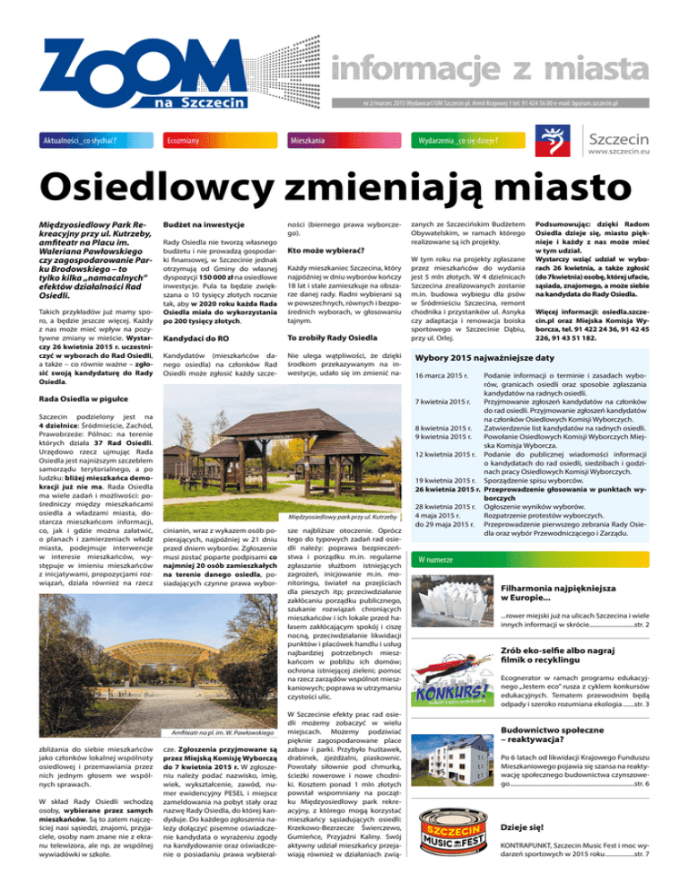 nr 2/marzec 2015 Wydawca©UM Szczecin pl. Armii Krajowej 1 tel. 91 424 56 00 e-mail: [email protected] Aktualności_co słychać? Ecozmiany Mieszkania Wydarzenia_co się dzieje? Osiedlowcy zmieniają miasto Międzyosiedlowy Park Rekreacyjny przy ul. Kutrzeby, amfiteatr na Placu im. Waleriana Pawłowskiego czy zagospodarowanie Parku Brodowskiego – to tylko kilka „namacalnych” efektów działalności Rad Osiedli. Takich przykładów już mamy sporo, a będzie jeszcze więcej. Każdy z nas może mieć wpływ na pozytywne zmiany w mieście. Wystarczy 26 kwietnia 2015 r. uczestniczyć w wyborach do Rad Osiedli, a także – co równie ważne – zgłosić swoją kandydaturę do Rady Osiedla. Budżet na inwestycje Rady Osiedla nie tworzą własnego budżetu i nie prowadzą gospodarki finansowej, w Szczecinie jednak otrzymują od Gminy do własnej dyspozycji 150 000 zł na osiedlowe inwestycje. Pula ta będzie zwiększana o 10 tysięcy złotych rocznie tak, aby w 2020 roku każda Rada Osiedla miała do wykorzystania po 200 tysięcy złotych. ności (biernego prawa wyborczego). Kto może wybierać? Każdy mieszkaniec Szczecina, który najpóźniej w dniu wyborów kończy 18 lat i stale zamieszkuje na obszarze danej rady. Radni wybierani są w powszechnych, równych i bezpośrednich wyborach, w głosowaniu tajnym. Kandydaci do RO To zrobiły Rady Osiedla Kandydatów (mieszkańców danego osiedla) na członków Rad Osiedli może zgłosić każdy szcze- Nie ulega wątpliwości, że dzięki środkom przekazywanym na inwestycje, udało się im zmienić na- Rada Osiedla w pigułce Szczecin podzielony jest na 4 dzielnice: Śródmieście, Zachód, Prawobrzeże: Pólnoc: na terenie których działa 37 Rad Osiedli. Urzędowo rzecz ujmując Rada Osiedla jest najniższym szczeblem samorządu terytorialnego, a po ludzku: bliżej mieszkańca demokracji już nie ma. Rada Osiedla ma wiele zadań i możliwości: pośredniczy między mieszkańcami osiedla a władzami miasta, dostarcza mieszkańcom informacji, co, jak i gdzie można załatwić, o planach i zamierzeniach władz miasta, podejmuje interwencje w interesie mieszkańców, występuje w imieniu mieszkańców z inicjatywami, propozycjami rozwiązań, działa również na rzecz Międzyosiedlowy park przy ul. Kutrzeby cinianin, wraz z wykazem osób popierających, najpóźniej w 21 dniu przed dniem wyborów. Zgłoszenie musi zostać poparte podpisami co najmniej 20 osób zamieszkałych na terenie danego osiedla, posiadających czynne prawa wybor- Amfiteatr na pl. im. W. Pawłowskiego zbliżania do siebie mieszkańców jako członków lokalnej wspólnoty osiedlowej i przemawiania przez nich jednym głosem we wspólnych sprawach. W skład Rady Osiedli wchodzą osoby, wybierane przez samych mieszkańców. Są to zatem najczęściej nasi sąsiedzi, znajomi, przyjaciele, osoby nam znane nie z ekranu telewizora, ale np. ze wspólnej wywiadówki w szkole. cze. Zgłoszenia przyjmowane są przez Miejską Komisję Wyborczą do 7 kwietnia 2015 r. W zgłoszeniu należy podać nazwisko, imię, wiek, wykształcenie, zawód, numer ewidencyjny PESEL i miejsce zameldowania na pobyt stały oraz nazwę Rady Osiedla, do której kandyduje. Do każdego zgłoszenia należy dołączyć pisemne oświadczenie kandydata o wyrażeniu zgody na kandydowanie oraz oświadczenie o posiadaniu prawa wybieral- sze najbliższe otoczenie. Oprócz tego do typowych zadań rad osiedli należy: poprawa bezpieczeństwa i porządku m.in. regularne zgłaszanie służbom istniejących zagrożeń, inicjowanie m.in. monitoringu, świateł na przejściach dla pieszych itp; przeciwdziałanie zakłócaniu porządku publicznego, szukanie rozwiązań chroniących mieszkańców i ich lokale przed hałasem zakłócającym spokój i ciszę nocną, przeciwdziałanie likwidacji punktów i placówek handlu i usług najbardziej potrzebnych mieszkańcom w pobliżu ich domów; ochrona istniejącej zieleni; pomoc na rzecz zarządów wspólnot mieszkaniowych; poprawa w utrzymaniu czystości ulic. W Szczecinie efekty prac rad osiedli możemy zobaczyć w wielu miejscach. Możemy podziwiać pięknie zagospodarowane place zabaw i parki. Przybyło huśtawek, drabinek, zjeżdżalni, piaskownic. Powstały siłownie pod chmurką, ścieżki rowerowe i nowe chodniki. Kosztem ponad 1 mln złotych powstał wspomniany na początku Międzyosiedlowy park rekreacyjny, z którego mogą korzystać mieszkańcy sąsiadujących osiedli: Krzekowo-Bezrzecze Świerczewo, Gumieńce, Przyjaźni Kaliny. Swój aktywny udział mieszkańcy przejawiają również w działaniach zwią- zanych ze Szczecińskim Budżetem Obywatelskim, w ramach którego realizowane są ich projekty. W tym roku na projekty zgłaszane przez mieszkańców do wydania jest 5 mln złotych. W 4 dzielnicach Szczecina zrealizowanych zostanie m.in. budowa wybiegu dla psów w Śródmieściu Szczecina, remont chodnika i przystanków ul. Asnyka czy adaptacja i renowacja boiska sportowego w Szczecinie Dąbiu, przy ul. Orlej. Podsumowując: dzięki Radom Osiedla dzieje się, miasto pięknieje i każdy z nas może mieć w tym udział. Wystarczy wziąć udział w wyborach 26 kwietnia, a także zgłosić (do 7kwietnia) osobę, której ufacie, sąsiada, znajomego, a może siebie na kandydata do Rady Osiedla. Więcej informacji: osiedla.szczecin.pl oraz Miejska Komisja Wyborcza, tel. 91 422 24 36, 91 42 45 226, 91 43 51 182. Wybory 2015 najważniejsze daty 16 marca 2015 r. Podanie informacji o terminie i zasadach wyborów, granicach osiedli oraz sposobie zgłaszania kandydatów na radnych osiedli. 7 kwietnia 2015 r. Przyjmowanie zgłoszeń kandydatów na członków do rad osiedli. Przyjmowanie zgłoszeń kandydatów na członków Osiedlowych Komisji Wyborczych. 8 kwietnia 2015 r. Zatwierdzenie list kandydatów na radnych osiedli. 9 kwietnia 2015 r. Powołanie Osiedlowych Komisji Wyborczych Miejska Komisja Wyborcza. 12 kwietnia 2015 r. Podanie do publicznej wiadomości informacji o kand