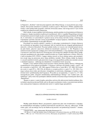 337 Pogłosy że Paprocki z „Korbuta” miał otrzymać papieski order Złotej Ostrogi, co raczej dziwne przy eksjezuitach. Sam jezuita natomiast to zasłużony wydawca gazet w Warszawie i Wilnie, popularyzator wiedzy i autor podręcznika geografii, człowiek oświecenia zatem, wart uwagi nawet w tym swoim cząstkowym zainteresowaniu Lipsjuszem. Otóż szkoda, że poza ogólną o nich informacją, autorka pomija owych pomniejszych tłumaczy z Lipsjusza i skupia się jedynie na głównych translatorach. Jeśli w wypadku Wargockiego (również zresztą byłym jezuicie) mogła się przy tym powołać na dość bogatą literaturę przedmiotu (B. Biliński, A. Litwornia), to o pozostałych w gruncie rzeczy od tej strony niewiele wiemy, a ilustrują oni wspomniane zjawisko znacznie szerzej od przekładów recepcji Lipsjusza. Zabrakło też tu choćby przywołania wspomnianego na początku Hernasa. Przychodzi się zarazem zgodzić z autorką, że cała grupa wymienionych w książce tłumaczy nie wyróżniała się specjalnie swymi talentami, nikt też spośród niej nie osiągnął spektakularnych sukcesów, zwłaszcza literackich. Przyznać jednak trzeba, że wszyscy oni wyrastali ponad otoczenie jako ludzie „aktywni i pracowici, skłonni do moralistyki i parenezy” (s. 20). Wyjaśnia to ich zainteresowanie Lipsjuszem i podjęty przez nich trud przekładania, a więc popularyzacji jego dzieł i zawartych w nich treści ideowych. Zwracają przy tym uwagę dwa odległe od siebie okresy podjętych prac przekładowych, jako pogłos zainteresowania się w ogóle Lipsjuszem w Polsce. Pierwszy z nich to przełom XVI i XVII w., mający miejsce jeszcze za życia samego autora, gdy przedmiotem uwagi stają się poruszone przez niego problemy moralne. Okres kolejny datuje się dopiero w czasach stanisławowskich, gdy ponownie uwagę zwracają problemy polityczno-moralne zawarte w dziełach Lipsjusza – nabierają one aktualności w kontekście losów ojczyzny. Książka z racji założeń tematycznych przynosi własną autorską analizę ideową i filologiczną wymienionych wyżej pełnych przekładów z Lipsjusza i poświęca im kolejne osobne „części”: od De constantia w części II (s. 145–196), poprzez Politicorum w części III (s. 197–308) i De Calumnia oratio w części IV (s. 309–354), do Monita et exempla politica w części V (s. 355–382). Z samego wykazu stron widać, jak obszerne i skrupulatne to omówienia, obejmujące w każdej z części również treść i problematykę dzieł Lipsjusza. Wszystkie je zaś poprzedza, w części I (s. 27–142), monograficzna próba „biografii intelektualnej niderlandzkiego filologa” oraz wykład stylu „lipsjańskiego”, który może zbyt pochopnie oddziela autorka od naznaczonego konotacjami ideowymi „lipsjanizmu”. Bogata to zatem w sumie książka, potrzebna zarówno dla odtworzenia bardziej pełnego obrazu kultury umysłowej dawnej Polski, jak też dla upowszechnienia wiedzy o neostoicyzmie polskim oraz samej postaci Lipsjusza, niekoniecznie nawet w wąskim kręgu specjalistów. OBLICZA OŚWIECENIOWEJ PRZYJEMNOŚCI KAMILA SOLON* Według opinii Roberta Mauzi, przyjemność, pojmowana jako stan świadomości o charakterze intelektualnym lub będąca wynikiem doświadczeń zmysłowych, stała się „odkryciem” XVIII wieku, gdyż „nie ma nikogo, kto by nie kładł na nią nacisku i nie podnosił jej ważności”1. Istotnie, * Kamila Solon – mgr, doktorantka Wydziału Polonistyki UJ. 1 R. M a u z i, L’idée du bonheur dans la littérature et la pensée francaise au XVIII siècle, Paris 1960, s. 386, cyt. za: T. K o s t k i e w i c z o w a, Koncepcje przyjemności w myśli estetycznej XVIII 338 Pogłosy niemalże wszyscy pisarze i filozofowie epoki Oświecenia poświęcali wiele uwagi fenomenowi przyjemności. Szukano jej pochodzenia, badano stopnie intensywności i sposoby jej osiągania. Przyjemność, a co za tym idzie – rozkosz, zadowolenie, szczęście i szeroko rozumiana rozrywka, stały się tematem przewodnim refleksji filozoficznej i estetycznej, pojawiały się także obficie w twórczości poetyckiej, prozatorskiej i pamiętnikarskiej. Ogromnym powodzeniem w Polsce i Zachodniej Europie cieszyły się czasopisma o charakterze rozrywkowym, nierzadko prezentujące niezbyt wyszukany humor i dyskusyjne poczucie smaku. Niezbitym dowodem na to, że publikacje tego rodzaju stanowiły swoistą plagę epoki, są słowa wypowiedziane przez Doktora Bartolo, jednego z bohaterów słynnej komedii Cyrulik sewilski z 1775 roku. Ów doktor wyliczając okropne wynalazki swojego czasu, wymienia rozrywki zaraz na drugim miejscu po wolnomyślicielstwie, a przed elektrycznością i szczepionkami2. Oczywiście, nie jest to jedyne oblicze „barbarzyńskiego” XVIII wieku – wielką przyjemność dla oświeceniowych elit stanowiła lektura dzieł literackich, a także konwersacja, która była właściwa towarzystwu „maksymalnie ucywilizowanemu”3. Tom studiów zatytułowany Przyjemność w kulturze epoki rozumu zredagowany przez Teresę Kostkiewiczową, jest bodajże pierwszą polską pozycją naukową, która w całości poświęcona jest problematyce przyjemności w osiemnastowiecznej kulturze i literaturze4. Zamieszczone w tym tomie artykuły analizują rozmaite przejawy życia mentalnego i kulturowego oświeceniowego społeczeństwa, ukazując tym samym, że poszukiwanie źródeł przyjemności stało się dla niego stałym elementem życia codziennego. Znajdowano ją w miłości – tak duchowej, jak i cielesnej, długich biesiadach i smakowaniu znakomitych potraw, podróżach, a także w czytaniu książek, prowadzeniu uczonej konwersacji czy długich przechadzkach w cieniu parkowych drzew. Praca Przyjemność w kulturze epoki rozumu nie jest podzielona na bloki tematyczne, jednak lektura artykułów pozwala podzielić tom na pewne kategorie problemowe. Pierwsza z nich dotyczy samej definicji oraz semantyki pojęcia 