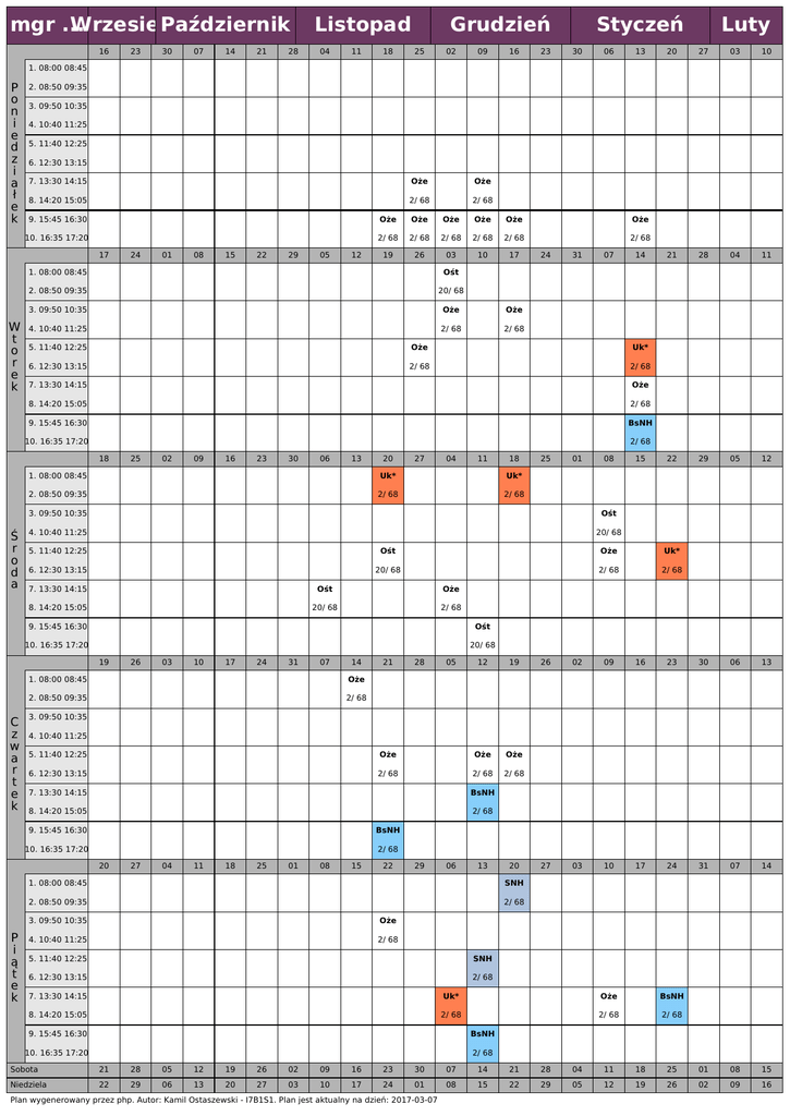 mgr ... Wrzesień Październik 16 23 30 07 14 21 28 Listopad 04 11 18 Grudzień 25 02 09 16 23 Styczeń 30 06 13 Luty 20 27 03 10 21 28 04 11 22 29 05 12 1. 08:00 08:45 P o n i e d z i a ł e k 2. 08:50 09:35 3. 09:50 10:35 4. 10:40 11:25 5. 11:40 12:25 6. 12:30 13:15 7. 13:30 14:15 Oże 8. 14:20 15:05 2/ 68 9. 15:45 16:30 10. 16:35 17:20 17 W t o r e k 24 01 08 15 22 29 05 12 2/ 68 Oże Oże Oże Oże Oże 2/ 68 2/ 68 2/ 68 2/ 68 2/ 68 19 26 03 10 17 1. 08:00 08:45 Ośt 2. 08:50 09:35 20/ 68 3. 09:50 10:35 Oże Oże 4. 10:40 11:25 2/ 68 2/ 68 31 07 14 Oże Uk* 2/ 68 2/ 68 7. 13:30 14:15 Oże 8. 14:20 15:05 2/ 68 9. 15:45 16:30 BsNH 10. 16:35 17:20 2/ 68 25 02 09 16 23 30 06 13 20 27 04 11 18 1. 08:00 08:45 Uk* Uk* 2. 08:50 09:35 2/ 68 2/ 68 25 01 08 3. 09:50 10:35 Ośt 4. 10:40 11:25 20/ 68 5. 11:40 12:25 Ośt 6. 12:30 13:15 20/ 68 7. 13:30 14:15 Ośt Oże 8. 14:20 15:05 20/ 68 2/ 68 15 Oże Uk* 2/ 68 2/ 68 Ośt 10. 16:35 17:20 20/ 68 19 26 03 10 17 24 31 07 14 1. 08:00 08:45 Oże 2. 08:50 09:35 2/ 68 21 28 05 12 19 26 02 09 16 23 30 06 13 27 03 10 17 24 31 07 14 3. 09:50 10:35 4. 10:40 11:25 5. 11:40 12:25 Oże Oże Oże 6. 12:30 13:15 2/ 68 2/ 68 2/ 68 7. 13:30 14:15 BsNH 8. 14:20 15:05 2/ 68 9. 15:45 16:30 BsNH 10. 16:35 17:20 2/ 68 20 P i ą t e k 2/ 68 24 6. 12:30 13:15 9. 15:45 16:30 C z w a r t e k Oże 5. 11:40 12:25 18 Ś r o d a Oże 27 04 11 18 25 01 08 15 22 29 06 13 20 1. 08:00 08:45 SNH 2. 08:50 09:35 2/ 68 3. 09:50 10:35 Oże 4. 10:40 11:25 2/ 68 5. 11:40 12:25 SNH 6. 12:30 13:15 2/ 68 7. 13:30 14:15 Uk* Oże BsNH 8. 14:20 15:05 2/ 68 2/ 68 2/ 68 9. 15:45 16:30 BsNH 10. 16:35 17:20 2/ 68 Sobota 21 28 05 12 19 26 02 09 16 23 30 07 14 21 28 04 11 18 25 01 08 15 Niedziela 22 29 06 13 20 27 03 10 17 24 01 08 15 22 29 05 12 19 26 02 09 16 Plan wygenerowany przez php. Autor: Kamil Ostaszewski - I7B1S1. Plan jest aktualny na dzień: 2017-03-07