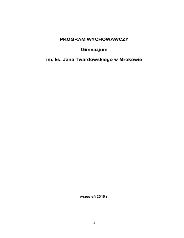 PROGRAM WYCHOWAWCZY Gimnazjum im. ks. Jana Twardowskiego w Mrokowie wrzesień 2016 r. 1 1. PODSTAWA PRAWNA Ustawa z dnia 7 września 1991r. o systemie oświaty (Dz. U. z 2004r. Nr 256, poz. 2572 z późniejszymi zmianami); Ustawa z dnia 26 stycznia 1982 r. Karta Nauczyciela (Dz. U. z 2014, poz.191); Konstytucja Rzeczpospolitej Polskiej z 2 kwietnia 1997 r. (art. 48 ust. 1; art. 53 ust. 3; art. 72 ust. 1); Konwencja O Prawach Dziecka z 20 listopada 1989 r.; Powszechna Deklaracja Praw Człowieka; Podstawa Programowa Kształcenia Ogólnego; Statut Zespołu Szkół Publicznych w Mrokowie; Koncepcja pracy szkoły. 2. ZAŁOŻENIA WYCHOWAWCZO - PROFILAKTYCZNE, NA KTÓRYCH OPARTY ZOSTAŁ SZKOLNY PROGRAM WYCHOWAWCZY idee obszaru wychowania Podstawy Programowej Kształcenia Ogólnego; założenia programów edukacyjnych nauczycieli gimnazjum; założenia koncepcji trójpodmiotowości oddziaływań wychowawczych i kształcących: uczeń, szkoła, dom rodzinny; tradycje narodowe i rodzinne; tradycje szkoły i społeczności lokalnej; zagrożenia współczesnego świata; w tym ze strony mediów; zapobieganie wszelkiej dyskryminacji; wymagania stawiane młodym ludziom przez życie w społeczeństwie informacyjnym; wymagania stawiane młodym ludziom przez życie w rozwijającej oraz integrującej się Europie; rosnące aspiracje i oczekiwania młodych ludzi; ciekawość poznawcza młodzieży; podejmowanie inicjatyw i umiejętność pracy zespołowej. 3. WARTOŚCI WYCHOWAWCZE autentyczność; poczucie własnej wartości; wytrwałość; prawda, uczciwość, szczerość; dobro; 2 odpowiedzialność za siebie i innych; sprawiedliwość; pozytywny stosunek do nauki i kształcenia; zaangażowanie w działalność szkolną i społeczną; niezależność w podejmowaniu decyzji; wrażliwość na potrzeby innych; wrażliwość na piękno przyrody; umiejętność życia w rodzinie i społeczeństwie; uczestnictwo w kulturze; szacunek do języka, historii, tradycji narodowej; szacunek do języka, historii, tradycji innych kultur i społeczeństw; poszanowanie wartości i godności ludzkiej; inicjatywa, kreatywność, przedsiębiorczość; zdrowie. 4. STRUKTURA ODDZIAŁYWAŃ WYCHOWAWCZYCH DYREKCJA dba o prawidłowy poziom pracy wychowawczej i opiekuńczej w szkole; dba o kształtowanie twórczej atmosfery w szkole; dba o motywację pracowników; stwarza warunki do prawidłowej realizacji wymogów zawartych w rozporządzeniach MEN; nadzoruje realizację obowiązku szkolnego przez uczniów; umożliwia i czuwa nad kształceniem nauczycieli i specjalistów szkolnych; współpracuje z Radą Rodziców; współpracuje z Samorządem Uczniowskim; dba o zapewnienie uczniom, nauczycielom i pracownikom szkoły bezpieczeństwa na terenie szkoły. SPECJALIŚCI SZKOLNI udzielają uczniom pomocy w eliminowaniu napięć psychicznych na tle niepowodzeń szkolnych; przeciwdziałają skrajnym formom niedostosowania społecznego młodzieży; udzielają porad rodzicom w rozwiązywaniu trudności wychowawczych; koordynują prace z zakresu profilaktyki wychowawczej i zdrowotnej; dokonują okresowych analiz sytuacji wychowawczej w szkole; współpracują w realizacji swoich zadań z instytucjami świadczącymi pomoc 3 terapeutyczną, psychologiczną i wychowawczą; wspierają wychowawców klas; wspierają nauczycieli; prowadzą zajęcia indywidualne i grupowe, których celem jest zdobycie lub rozwój określonych umiejętności psychospołecznych, wsparcie psychologiczno -pedagogiczne, profilaktyka zaburzeń, uzależnień i przemocy, w tym cyberprzemocy; diagnozują środowisko uczniów; kontrolują systematyczność uczęszczania uczniów do szkoły; organizują różne formy terapii dla uczniów z przejawami niedostosowania społecznego. NAUCZYCIELE wspierają rozwój psychofizyczny uczniów stosownie do ich potrzeb i możliwości, rozwijają ich zdolności oraz zainteresowania, w tym matematyczno-przyrodnicze; modelują swoją postawą i działaniami pedagogicznymi zachowania społecznie adekwatne; kształcą i wychowują młodzież w duchu patriotyzmu i demokracji oraz szacunku dla każdego człowieka, poszanowania dla innych kultur i tradycji; podejmują kroki w celu zapobiegania wszelkiej dyskryminacji; odpowiadają za bezpieczeństwo gimnazjalistów podczas pobytu w szkole i poza jej terenem (w czasie wycieczek, wyjść, itp.); reagują na przejawy niedostosowania społecznego u młodzieży; udzielają pomocy w przezwyciężaniu niepowodzeń szkolnych, w oparciu o rozpoznanie potrzeb uczniów; współpracują z instytucjami wspierającymi wychowawczą rolę szkoły; współpracują z rodzicami w sprawach kształcenia i wychowania uczniów; współpracują ze społecznymi organami szkoły; organizują konkursy oraz imprezy dla uczniów. WYCHOWAWCY sprawują opiekę nad uczniami; dbają o integrację zespołu klasowego; dbają o kształtowanie prawidłowych relacji interpersonalnych; tworzą warunki wspomagające wszechstronny rozwój uczniów dbają o przygotowanie uczniów do życia w rodzinie i społeczeństwie; motywują uczniów do aktywności społecznej; uczą tolerancji i poszanowania godności drugiego człowieka; zachęcają do czytelnictwa; 4 prowadzą działalność profilaktyczną dotyczącą bezpieczeństwa, uzależnień oraz przemocy, w tym cyberprzemocy; współpracują z nauczycielami uczącymi w danej klasie uzgadniając z nimi i koordynując działania wychowawcze, zwłaszcza wobec uczniów, którzy wymagają zapewnienia zindywidualizowanej opieki; współpracują z rodzicami w celu poznania i ustalenia potrzeb opiekuńczo – wychowawczych uczniów, udzielania pomocy w działaniach wychowawczych oraz otrzymywania pomocy od nich, włączania ich w sprawy klasy i szkoły; organizują pomoc psychologiczno – pedagogiczną dla swoich wychowanków; współpracują ze specjalistami szkolnymi. SAMORZĄD UCZNIOWSKI inspiruje i organizuje życie kulturalne oraz intelektualne na terenie szkoły; rozwija demokratyczne formy 