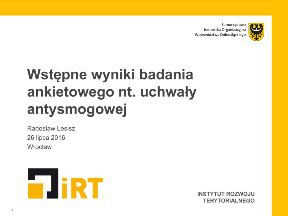 Samorządowa Jednostka Organizacyjna Województwa Dolnośląskiego Wstępne wyniki badania ankietowego nt. uchwały antysmogowej Radosław Lesisz 26 lipca 2016 Wrocław INSTYTUT ROZWOJU TERYTORIALNEGO 1 ANKIETA dotycząca wdrożenia przepisów zmienionego art. 96 ustawą z dnia 10 września 2015 roku o zmianie ustawy Prawo ochrony środowiska. 2 Wysłana do wszystkich 169 gmin w wersji papierowej; Uruchomiony formularz on-line, wspólnie z ankietą Uniwersytetu Wrocławskiego i WIOŚ; Uruchomiony punkt kontaktowy w IRT; Ankietyzacja wzorowana na woj. śląskim; Ankietę wypełniło 135 gmin (80%); Dalsza statystyka procentowa odnosi się tylko do liczby gmin, które odpowiedziały na ankietę. Radosław Lesisz www.irt.wroc.pl Gminy, które poprosiły Marszałka o uchwałę antysmogową przed powołaniem Zespołu roboczego ds. jakości powietrza: 1. Jelenia Góra 13. Świerzawa 2. Janowice Wielkie 14. Złotoryja 3. Jeżów Sudecki 15. Wojcieszów* 4. Karpacz 16. Wrocław 5. Kowary 17. Siechnice 6. Mysłakowice 18. Polanica-Zdrój 7. Piechowice 19. Duszniki-Zdrój 8. Podgórzyn 20. Legnica 9. Stara Kamienica 21. Pielgrzymka 10. Szklarska Poręba* 22. Wleń 11. Gryfów Śląski 23. Mirsk* 12. Lubomierz (Gminy, które deklarowały wolę, lecz w ankiecie wypełniły „NIE”) 3 Radosław Lesisz www.irt.wroc.pl Czy zamierzacie Państwo wystąpić do Marszałka Województwa z prośbą o wprowadzenie na terenie Państwa gminy „uchwały antysmogowej”, w której zostaną wprowadzone regulacje (ograniczenia lub zakazy) dotyczące instalacji, w których następuje spalanie paliw (kotły, piece, kominki)? TAK / TAK, ALE… - 42+3* NIE - 91 BRAK DECYZJI -2 (33%) (67%) (0,01%) * Szklarska Poręba, Wojcieszów i Mirsk nie odpowiedziały na ankietę, choć deklarowały „TAK” 4 Radosław Lesisz www.irt.wroc.pl 5 Radosław Lesisz www.irt.wroc.pl W ankiecie „TAK” (za objęciem terenu gminy uchwałą antysmogową), z pominięciem uprzednio zgłoszonych: 1. Brzeg Dolny 2. Góra 3. Jedlina-Zdrój 4. Kamienna Góra miasto 5. Kłodzko 6. Nowogrodziec 7. Radków 8. Sobótka 9. Strzegom 10. Szczawno-Zdrój 11. Świdnica miasto 12. Wąsosz 13. Żarów 6 Radosław Lesisz www.irt.wroc.pl W ankiecie „TAK, POD WARUNKIEM…” (za objęciem terenu gminy uchwałą antysmogową), z pominięciem uprzednio zgłoszonych: 1. Czarny Bór 14. Udanin 2. Dzierżoniów miasto 15. Wałbrzych 3. Kąty Wrocławskie 16. Zawidów 4. Kobierzyce 5. Lądek-Zdrój 6. Lubin miasto 7. Milicz 8. Nowa Ruda miasto 9. Oleśnica miasto 10. Pieńsk 11. Polkowice 12. Strzelin 13. Szczytna 7 Radosław Lesisz www.irt.wroc.pl Łącznie gminy, które deklarują wolę (również warunkowo) przystąpienia do uchwały antysmogowej: 52 Brzeg Dolny, Czarny Bór, Duszniki-Zdrój, Dzierżoniów miasto, Góra, Gryfów Śląski, Janowice Wielkie, JedlinaZdrój, Jelenia Góra, Jeżów Sudecki, Kamienna Góra miasto, Karpacz, Kąty Wrocławskie, Kłodzko, Kobierzyce, Kowary, Lądek-Zdrój, Legnica, Lubin miasto, Lubomierz, Milicz, Mirsk, Mysłakowice, Nowa Ruda miasto, Nowogrodziec, Oleśnica miasto, Piechowice, Pielgrzymka, Pieńsk, Podgórzyn, PolanicaZdrój, Polkowice, Radków, Siechnice, Sobótka, Stara Kamienica, Strzegom, Strzelin, Szczawno-Zdrój, Szczytna, Szklarska Poręba, Świdnica miasto, Świerzawa, Udanin, Wałbrzych, Wąsosz, Wleń, Wojcieszów, Wrocław, Zawidów, Złotoryja, Żarów 8 Radosław Lesisz www.irt.wroc.pl Na jakim obszarze powinny być wprowadzone zakazy lub ograniczenia, o których mowa w pytaniu pierwszym? CAŁA GMINA CAŁY DOLNY ŚLĄSK 9 Radosław Lesisz - 18 (43%) - 24 (57%) www.irt.wroc.pl 10 Radosław Lesisz www.irt.wroc.pl Czy wprowadzane „uchwałą antysmogową” zakazy i ograniczenia, dotyczyć powinny paliw, instalacji, w których następuje spalanie paliw, czy też paliw i instalacji łącznie? PALIWA INSTALACJE PALIWA + INSTALACJE 11 Radosław Lesisz -9 -7 - 25 (22%) (17%) (61%) www.irt.wroc.pl 12 Radosław Lesisz www.irt.wroc.pl Czy w gminie został przyjęty, lub będzie przyjęty w najbliższym czasie Program Ograniczania Niskiej Emisji (PONE)? TAK NIE W TRAKCIE B.D. 13 Radosław Lesisz -8 - 73 -2 - 52 (9%) (88%) (3%) www.irt.wroc.pl 14 Radosław Lesisz www.irt.wroc.pl Czy w gminie został przyjęty, lub będzie przyjęty w najbliższym czasie Program Gospodarki Niskoemisyjnej (PGN)? TAK NIE W TRAKCIE B.D. 15 Radosław Lesisz - 117 (88%) -4 (3%) - 12 (9%) -2 www.irt.wroc.pl 16 Radosław Lesisz www.irt.wroc.pl Czy gmina posiada aktualne informacje o stosowanych przez mieszkańców sposobach ogrzewania budynków i paliwach używanych do ogrzewania budynków? TAK NIE W TRAKCIE B.D. 17 Radosław Lesisz - 68 - 50 - 16 -1 (50%) (37%) (13%) www.irt.wroc.pl 18 Radosław Lesisz www.irt.wroc.pl Czy gmina posiada informacje na temat „powierzchni gminy” podłączonej do sieci cieplnej (C.O.)? TAK - 35 NIE - 21 BRAK C.O. - 78 19 Radosław Lesisz (26%) (16%) (58%) www.irt.wroc.pl 20 Radosław Lesisz www.irt.wroc.pl Czy jest dostępność gazu sieciowego na terenie gminy? TAK NIE 21 Radosław Lesisz - 95 - 40 (70%) (30%) www.irt.wroc.pl 22 Radosław Lesisz www.irt.wroc.pl Czy gmina posiada właściwe służby posiadające uprawnienia do prowadzenia stosownej kontroli przy ewentualnym wprowadzeniu przedmiotowej uchwały na terenie gminy? TAK NIE 23 Radosław Lesisz - 28 (21%) - 105 (79%) www.irt.wroc.pl 24 Radosław Lesisz www.irt.wroc.pl USTAWA (fragment) z dnia 27 kwietnia 2001 r. Prawo ochrony środowiska Art. 379. 1. Marszałek województwa, starosta oraz wójt, burmistrz lub prezydent miasta sprawują kontrolę przestrzegania i stosowania przepisów o ochronie środowiska w zakresie objętym właściwością tych organów. 2. Organy, o których mowa w ust. 1, mogą upoważnić do wykonywania funkcji kontrolnych pracowników podległych im urzędów marszałkowskich, powiatowych, miejskich lub gminnych lub funkcjonariuszy straży gminnych. 3. Kontrolujący, wykonując kontrolę, jest uprawniony do: 1) wstępu