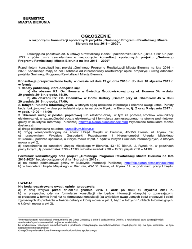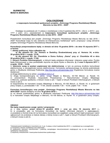 BURMISTRZ MIASTA BIERUNIA OGŁOSZENIE o rozpoczęciu konsultacji społecznych projektu „Gminnego Programu Rewitalizacji Miasta Bierunia na lata 2016 – 2020”. Działając na podstawie art. 5 ustawy o rewitalizacji z dnia 9 października 2015 r. (Dz.U. z 2015 r. poz. 1777 z późn. zm.), zawiadamiam o rozpoczęciu konsultacji społecznych projektu „Gminnego Programu Rewitalizacji Miasta Bierunia na lata 2016 – 2020” Przedmiotem konsultacji jest projekt „Gminnego Programu Rewitalizacji Miasta Bierunia na lata 2016 – 2020” Konsultacje mają na celu zebranie od interesariuszy rewitalizacji* opinii, propozycji i uwag odnośnie projektu Gminnego Programu Rewitalizacji Miasta Bierunia. Konsultacje przeprowadzone będą: w okresie od dnia 19 grudnia 2016 r. do dnia 10 stycznia 2017 r. w formie: 1. debaty publicznej, która odbędzie się: a) dla obszaru R1: Os. Homera w Świetlicy Środowiskowej przy ul. Homera 34, w dniu 20 grudnia 2016 r. o godz. 15:30, b) dla obszaru R2: Os. Chemików w Domu Kultury „Gama” przy ul. Chemików 45 w dniu 20 grudnia 2016 r. o godz. 17:00; 2. lotnych Punktów Informacyjnych, w których będą udzielane informacje i zbierane uwagi ustne. Punkty będą funkcjonować w dwa poniedziałki stycznia na płycie Rynku w Bieruniu, tj. 2 oraz 9 stycznia 2017 r. w godz. 10:00 – 14:00; 3. zbierania uwag w postaci papierowej lub elektronicznej, w tym za pomocą środków komunikacji elektronicznej, w szczególności poczty elektronicznej i formularza zamieszczonego na stronie podmiotowej gminy w Biuletynie Informacji Publicznej http://bip.bierun.pl/main/index.html Wypełnione formularze można dostarczyć: a) drogą elektroniczną na adres: [email protected] b) drogą korespondencyjną na adres: Urząd Miejski w Bieruniu, 43-150 Bieruń, ul. Rynek 14; c) pracownikom Wydziału Gospodarki Przestrzennej i Nieruchomości Urzędu Miejskiego w Bieruniu, podczas spotkania, o którym mowa w pkt. 1 bądź w lotnych Punktach Informacyjnych, o których mowa w pkt 2; d) bezpośrednio do kancelarii Urzędu Miejskiego w Bieruniu, 43-150 Bieruń, ul. Rynek 14, w godzinach pracy Urzędu, tj. poniedziałek 7:30 - 17:00, wtorek-czwartek 7:30 – 15:30, piątek 7:30 – 14:00. Formularz konsultacyjny oraz projekt „Gminnego Programu Rewitalizacji Miasta Bierunia na lata 2016-2020” będzie dostępny od dnia 19 grudnia 2016 r.: a) na stronie podmiotowej gminy w Biuletynie Informacji Publicznej http://bip.bierun.pl/main/index.html b) w kancelarii Urzędu Miejskiego w Bieruniu, 43-150 Bieruń, ul. Rynek 14, w godzinach pracy Urzędu. UWAGA! Nie będą rozpatrywane uwagi, opinie i propozycje: a) z datą wpływu przed dniem 19 grudnia 2016 r. oraz po dniu 10 stycznia 2017 r., b) w przypadku, gdy na formularzu konsultacji nie będzie informacji (danych) o zgłaszającym, c) przesłane w formie innej niż na formularzu konsultacji (za wyjątkiem uwag ustnych bądź propozycji i opinii zgłoszonych do protokołu w trakcie debaty o której mowa w pkt 1, bądź w lotnych Punktach Informacyjnych, o których mowa w pkt 2). *Interesariuszami rewitalizacji w rozumieniu art. 2 ust. 2 ustawy z dnia 9 października 2015 r. o rewitalizacji są w szczególności: a) mieszkańcy obszaru rewitalizacji oraz właściciele, b) użytkownicy wieczyści nieruchomości i podmioty zarządzające nieruchomościami znajdującymi się na tym obszarze, w tym spółdzielnie mieszkaniowe, c) wspólnoty mieszkaniowe i towarzystwa budownictwa społecznego; d) mieszkańcy gminy inni niż wymienieni w a); e) podmioty prowadzące lub zamierzające prowadzić na obszarze gminy działalność gospodarczą; f) podmioty prowadzące lub zamierzające prowadzić na obszarze gminy działalność społeczną, w tym organizacje pozarządowe i grupy nieformalne; g) jednostki samorządu terytorialnego i ich jednostki organizacyjne; h) organy władzy publicznej; i) podmioty, inne niż wymienione w pkt 6, realizujące na obszarze rewitalizacji uprawnienia Skarbu Państwa. BURMISTRZ MIASTA BIERUNIA Krystian GRZESICA