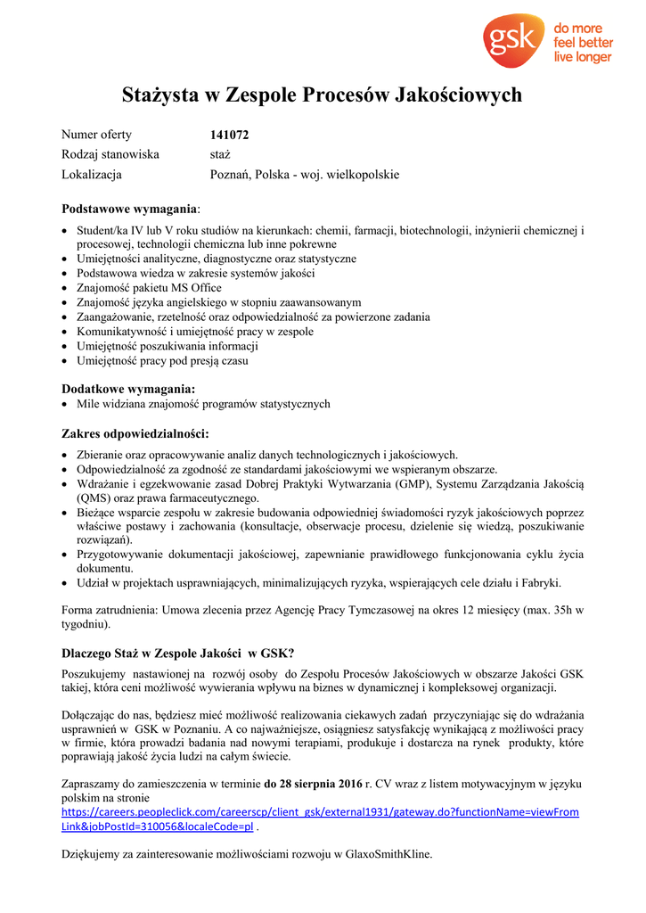 Stażysta w Zespole Procesów Jakościowych Numer oferty Rodzaj stanowiska 141072 staż Lokalizacja Poznań, Polska - woj. wielkopolskie Podstawowe wymagania: Student/ka IV lub V roku studiów na kierunkach: chemii, farmacji, biotechnologii, inżynierii chemicznej i procesowej, technologii chemiczna lub inne pokrewne Umiejętności analityczne, diagnostyczne oraz statystyczne Podstawowa wiedza w zakresie systemów jakości Znajomość pakietu MS Office Znajomość języka angielskiego w stopniu zaawansowanym Zaangażowanie, rzetelność oraz odpowiedzialność za powierzone zadania Komunikatywność i umiejętność pracy w zespole Umiejętność poszukiwania informacji Umiejętność pracy pod presją czasu Dodatkowe wymagania: Mile widziana znajomość programów statystycznych Zakres odpowiedzialności: Zbieranie oraz opracowywanie analiz danych technologicznych i jakościowych. Odpowiedzialność za zgodność ze standardami jakościowymi we wspieranym obszarze. Wdrażanie i egzekwowanie zasad Dobrej Praktyki Wytwarzania (GMP), Systemu Zarządzania Jakością (QMS) oraz prawa farmaceutycznego. Bieżące wsparcie zespołu w zakresie budowania odpowiedniej świadomości ryzyk jakościowych poprzez właściwe postawy i zachowania (konsultacje, obserwacje procesu, dzielenie się wiedzą, poszukiwanie rozwiązań). Przygotowywanie dokumentacji jakościowej, zapewnianie prawidłowego funkcjonowania cyklu życia dokumentu. Udział w projektach usprawniających, minimalizujących ryzyka, wspierających cele działu i Fabryki. Forma zatrudnienia: Umowa zlecenia przez Agencję Pracy Tymczasowej na okres 12 miesięcy (max. 35h w tygodniu). Dlaczego Staż w Zespole Jakości w GSK? Poszukujemy nastawionej na rozwój osoby do Zespołu Procesów Jakościowych w obszarze Jakości GSK takiej, która ceni możliwość wywierania wpływu na biznes w dynamicznej i kompleksowej organizacji. Dołączając do nas, będziesz mieć możliwość realizowania ciekawych zadań przyczyniając się do wdrażania usprawnień w GSK w Poznaniu. A co najważniejsze, osiągniesz satysfakcję wynikającą z możliwości pracy w firmie, która prowadzi badania nad nowymi terapiami, produkuje i dostarcza na rynek produkty, które poprawiają jakość życia ludzi na całym świecie. Zapraszamy do zamieszczenia w terminie do 28 sierpnia 2016 r. CV wraz z listem motywacyjnym w języku polskim na stronie https://careers.peopleclick.com/careerscp/client_gsk/external1931/gateway.do?functionName=viewFrom Link&jobPostId=310056&localeCode=pl . Dziękujemy za zainteresowanie możliwościami rozwoju w GlaxoSmithKline.
