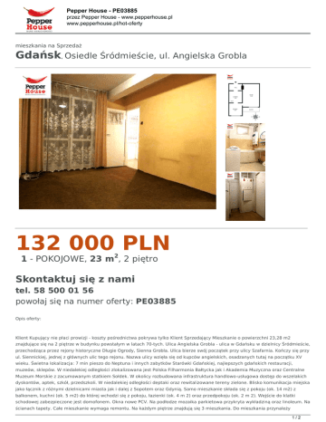 Pepper House - PE03885 przez Pepper House - www.pepperhouse.pl www.pepperhouse.pl/hot-oferty mieszkania na Sprzedaż Gdańsk, Osiedle Śródmieście, ul. Angielska Grobla 132 000 PLN 1 - POKOJOWE, 23 m2, 2 piętro Skontaktuj się z nami tel. 58 500 01 56 powołaj się na numer oferty: PE03885 Opis oferty: Klient Kupujący nie płaci prowizji - koszty pośrednictwa pokrywa tylko Klient Sprzedający Mieszkanie o powierzchni 23,28 m2 znajdujące się na 2 piętrze w budynku powstałym w latach 70-tych. Ulica Angielska Grobla - ulica w Gdańsku w dzielnicy Śródmieście, przechodząca przez rejony historyczne Długie Ogrody, Sienna Grobla. Ulica bierze swój początek przy ulicy Szafarnia. Kończy się przy ul. Siennickiej, jednej z głównych ulic tego rejonu. Nazwa ulicy wzięła się od kupców angielskich, osadzanych tutaj na początku XV wieku. Świetna lokalizacja: 7 min pieszo do Neptuna i innych zabytków Starówki Gdańskiej, najlepszych gdańskich restauracji, muzeów, sklepów. W niedalekiej odległości zlokalizowana jest Polska Filharmonia Bałtycka jak i Akademia Muzyczna oraz Centralne Muzeum Morskie z zacumowanym statkiem Sołdek. W okolicy rozbudowana infrastruktura handlowo-usługowa dostęp do wszelakich dyskontów, aptek, szkół, przedszkoli. W niedalekiej odległości deptaki oraz rewitalizowane tereny zielone. Blisko komunikacja miejska jako łącznik z różnymi dzielnicami miasta jak i dalej z Sopotem oraz Gdynią. Samo mieszkanie składa się z pokoju (ok. 14 m2) z balkonem, kuchni (ok. 5 m2) do której wchodzi się z pokoju, łazienki (ok. 4 m 2) oraz przedpokoju (ok. 2 m 2). Wejście do klatki schodowej zabezpieczone jest domofonem. Okna nowe PCV. Na podłodze mozaika parkietowa przykryta wykładziną oraz linoleum. Na ścianach tapety. Całe mieszkanie wymaga remontu. Na każdym piętrze znajdują się 3 mieszkania. Do mieszkania przynależy 1/2 Pepper House - PE03885 przez Pepper House - www.pepperhouse.pl www.pepperhouse.pl/hot-oferty komórka lokatorska. Ogrzewanie wody zapewnia jednofunkcyjny piec gazowy, mieszkanie ogrzewane jest z miasta. Mieszkanie bardzo słoneczne ( pd.-wsch.) i ustawne. Okna wychodzą na ulicę Seredyńskiego.Opłaty odpowiednio lato/zima 150/250 zł. Opiekun oferty - Roman Rajski tel. 535 439 100. Serdecznie zapraszam do obejrzenia nieruchomości! Współpracując z nami otrzymujesz gwarancje najniższej ceny na rynku! Jeśli znajdziesz korzystniejszą ofertę, zgłoś się do nas, a zaprezentujemy Ci jeszcze niższą cenę. Więcej podobnych ofert na www.pepperhouse.pl Zapraszam na naszego bloga: www.blog.pepperhouse.pl Tylko u nas GWARANCJA najniższej ceny dzięki: - okazyjnej cenie nieruchomości - usługom finansowym Pepper House - preferencyjnej stawce u Notariusza Tylko u nas GWARANCJA bezpieczeństwa dzięki: - obsłudze prawnej Kancelarii Koprowski Gąsior Gierzyńska Ludwichowska - nadzorowi licencjonowanego Pośrednika (nr licencji 6884) - polisie OC Pośrednika na kwotę 1 000 000 PLN w PZU SA - ubezpieczeniu kupowanej nieruchomości (szczegóły na naszej stronie). Więcej zdjęć, zdjęcia w dużym formacie, rzuty, filmy i dodatkowe informacje: www.pepperhouse.pl Wejdź już dziś i wyślij zapytanie bezpośrednio do opiekuna oferty. 2/2 Powered by TCPDF (www.tcpdf.org)