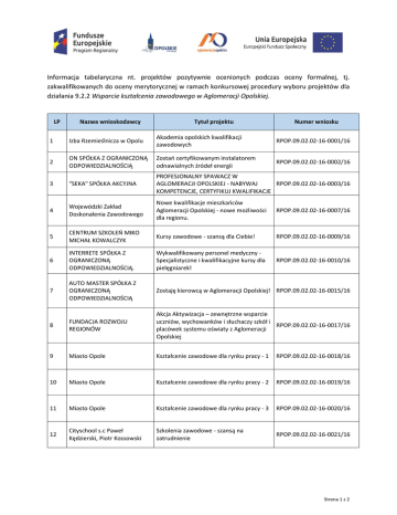 Informacja tabelaryczna nt. projektów pozytywnie ocenionych podczas oceny formalnej, tj. zakwalifikowanych do oceny merytorycznej w ramach konkursowej procedury wyboru projektów dla działania 9.2.2 Wsparcie kształcenia zawodowego w Aglomeracji Opolskiej. LP Nazwa wnioskodawcy Tytuł projektu Numer wniosku 1 Izba Rzemieślnicza w Opolu Akademia opolskich kwalifikacji zawodowych RPOP.09.02.02-16-0001/16 2 ON SPÓŁKA Z OGRANICZONĄ ODPOWIEDZIALNOŚCIĄ Zostań certyfikowanym instalatorem odnawialnych źródeł energii RPOP.09.02.02-16-0002/16 3 "SEKA" SPÓŁKA AKCYJNA PROFESJONALNY SPAWACZ W AGLOMERACJI OPOLSKIEJ - NABYWAJ RPOP.09.02.02-16-0003/16 KOMPETENCJE, CERTYFIKUJ KWALIFIKACJE 4 Wojewódzki Zakład Doskonalenia Zawodowego Nowe kwalifikacje mieszkańców Aglomeracji Opolskiej - nowe możliwości dla regionu. RPOP.09.02.02-16-0007/16 5 CENTRUM SZKOLEŃ MIKO MICHAŁ KOWALCZYK Kursy zawodowe - szansą dla Ciebie! RPOP.09.02.02-16-0009/16 6 INTERRETE SPÓŁKA Z OGRANICZONĄ ODPOWIEDZIALNOŚCIĄ. Wykwalifikowany personel medyczny Specjalistyczne i kwalifikacyjne kursy dla pielęgniarek! RPOP.09.02.02-16-0010/16 7 AUTO MASTER SPÓŁKA Z OGRANICZONĄ ODPOWIEDZIALNOŚCIĄ Zostaję kierowcą w Aglomeracji Opolskiej! RPOP.09.02.02-16-0015/16 8 FUNDACJA ROZWOJU REGIONÓW Akcja Aktywizacja – zewnętrzne wsparcie uczniów, wychowanków i słuchaczy szkół i RPOP.09.02.02-16-0017/16 placówek systemu oświaty z Aglomeracji Opolskiej 9 Miasto Opole Kształcenie zawodowe dla rynku pracy - 1 RPOP.09.02.02-16-0018/16 10 Miasto Opole Kształcenie zawodowe dla rynku pracy - 2 RPOP.09.02.02-16-0019/16 11 Miasto Opole Kształcenie zawodowe dla rynku pracy - 3 RPOP.09.02.02-16-0020/16 12 Cityschool s.c Paweł Kędzierski, Piotr Kossowski Szkolenia zawodowe - szansą na zatrudnienie RPOP.09.02.02-16-0021/16 Strona 1 z 2 13 SIS-CO Artur Dębiński Nowe kwalifikacje zawodowe pielęgniarek RPOP.09.02.02-16-0023/16 Aglomeracji Opolskiej 14 Ciurex-4 Łukasz Ciura Profesjonalizacja i Certyfikacja dekarzy gwarancja trwałości dachu na minimum 25 lat W Aglomeracji Opolskiej. RPOP.09.02.02-16-0031/16 15 Europejskie Centrum Edukacyjne - Europäisches Bildungszentrum sp. z o.o. Opolska Szkoła Opieki RPOP.09.02.02-16-0032/16 16 D-H DAWID HARYNEK Kierowcy pilnie poszukiwani! RPOP.09.02.02-16-0036/16 Źródło: opracowanie własne Strona 2 z 2