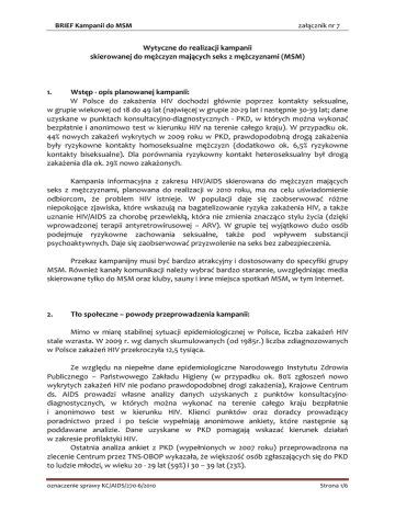 BRIEF Kampanii do MSM załącznik nr 7 Wytyczne do realizacji kampanii skierowanej do mężczyzn mających seks z mężczyznami (MSM) Wstęp - opis planowanej kampanii: W Polsce do zakażenia HIV dochodzi głównie poprzez kontakty seksualne, w grupie wiekowej od 18 do 49 lat (najwięcej w grupie 20-29 lat i następnie 30-39 lat; dane uzyskane w punktach konsultacyjno-diagnostycznych - PKD, w których można wykonać bezpłatnie i anonimowo test w kierunku HIV na terenie całego kraju). W przypadku ok. 44% nowych zakażeń wykrytych w 2009 roku w PKD, prawdopodobną drogą zakażenia były ryzykowne kontakty homoseksualne mężczyzn (dodatkowo ok. 6,5% ryzykowne kontakty biseksualne). Dla porównania ryzykowny kontakt heteroseksualny był drogą zakażenia dla ok. 29% nowo zakażonych. 1. Kampania informacyjna z zakresu HIV/AIDS skierowana do mężczyzn mających seks z mężczyznami, planowana do realizacji w 2010 roku, ma na celu uświadomienie odbiorcom, że problem HIV istnieje. W populacji daje się zaobserwować różne niepokojące zjawiska, które wskazują na bagatelizowanie ryzyka zakażenia HIV, a także uznanie HIV/AIDS za chorobę przewlekłą, która nie zmienia znacząco stylu życia (dzięki wprowadzonej terapii antyretrowirusowej – ARV). W grupie tej wyjątkowo dużo osób podejmuje ryzykowne zachowania seksualne, także pod wpływem substancji psychoaktywnych. Daje się zaobserwować przyzwolenie na seks bez zabezpieczenia. Przekaz kampanijny musi być bardzo atrakcyjny i dostosowany do specyfiki grupy MSM. Również kanały komunikacji należy wybrać bardzo starannie, uwzględniając media skierowane tylko do MSM oraz kluby, sauny i inne miejsca spotkań MSM, w tym Internet. 2. Tło społeczne – powody przeprowadzenia kampanii: Mimo w miarę stabilnej sytuacji epidemiologicznej w Polsce, liczba zakażeń HIV stale wzrasta. W 2009 r. wg danych skumulowanych (od 1985r.) liczba zdiagnozowanych w Polsce zakażeń HIV przekroczyła 12,5 tysiąca. Ze względu na niepełne dane epidemiologiczne Narodowego Instytutu Zdrowia Publicznego – Państwowego Zakładu Higieny (w przypadku ok. 80% zgłoszeń nowo wykrytych zakażeń HIV nie podano prawdopodobnej drogi zakażenia), Krajowe Centrum ds. AIDS prowadzi własne analizy danych uzyskanych z punktów konsultacyjnodiagnostycznych, w których można wykonać na terenie całego kraju bezpłatnie i anonimowo test w kierunku HIV. Klienci punktów oraz doradcy prowadzący poradnictwo przed i po teście wypełniają anonimowe ankiety, które następnie są poddawane analizie. Dane uzyskane w PKD pomagają wskazać kierunek działań w zakresie profilaktyki HIV. Ostatnia analiza ankiet z PKD (wypełnionych w 2007 roku) przeprowadzona na zlecenie Centrum przez TNS-OBOP wykazała, że większość osób zgłaszających się do PKD to ludzie młodzi, w wieku 20 - 29 lat (59%) i 30 – 39 lat (23%). oznaczenie sprawy KC/AIDS/270-6/2010 Strona 1/6 BRIEF Kampanii do MSM załącznik nr 7 Prawie połowa spośród wszystkich osób zgłaszających się na test do PKD przyznała, że miała kontakty z partnerem seksualnym innym niż stały (41%), a co trzecia osoba nie podała czy miała kontakty seksualne z partnerem seksualnym innym niż stały (37%), co może oznaczać, że takie kontakty miała, ale nie chce o nich mówić nawet anonimowo. Niemal co trzecia z tych osób nigdy nie stosowała prezerwatyw w kontaktach seksualnych ze stałym partnerem (31%), 38% badanych twierdzi, że czasami używa prezerwatyw podczas kontaktów ze stałymi partnerami. Odpowiedzi klientów PKD pytanych o kontakty seksualne z partnerami innymi niż stali partnerzy, są jeszcze bardziej niepokojące. Co szósta osoba nigdy nie stosowała prezerwatyw w kontaktach seksualnych z partnerami innymi niż stali (16%), a co trzecia osoba używała prezerwatyw w podejmowanych przez siebie kontaktach seksualnych jedynie czasami (32%). Jedynie 23% zawsze stosuje prezerwatywy w kontaktach z partnerami innymi niż stali. Zastanawiający jest brak odpowiedzi na to pytanie ponad 28% badanych. Spośród osób seropozytywnych na pytanie czy używają prezerwatyw z partnerami stałymi, prawie 70% odpowiedziało, że nigdy lub czasami, a prawie 60% nigdy nie używa lub używa czasami prezerwatywy w kontaktach z partnerami innymi niż stali. Sygnały, które na bieżąco docierają do Krajowego Centrum ds. AIDS z punktów konsultacyjno-diagnostycznych wskazują na utrzymywanie się ww. tendencji w 2008 i 2009 roku. Niepokojące są też informacje uzyskiwane od lekarzy, zwłaszcza lekarzy wenerologów, do których trafia coraz więcej pacjentów z kiłą lub innymi chorobami przenoszonymi drogą płciową, często w stadium bardzo zaawansowanym. Należy także zwrócić uwagę na fakt, że w populacji MSM w dalszym ciągu zbyt mało osób decyduje się na wykonanie testu w kierunku HIV. W roku 2009 test anonimowo i bezpłatnie wykonało w PKD ok. 26 tysięcy osób. Odnotowano wzrost zainteresowania w stosunku do lat poprzednich (2008 r.: ok. 21 tys., 2007 r.: ok. 19 tys.), lecz ciągle obserwowany jest brak świadomości, że problem HIV/AIDS może być problemem każdego. Wg szacunków Komisji Europejskiej nawet 70% osób zakażonych w Polsce nie zna swojego statusu serologicznego. Problemem jest także nietestowanie się w kierunku innych chorób przenoszonych drogą płciową. W populacji mężczyzn mających seks z mężczyznami obserwuje się także inne zjawisko: ci mężczyźni, którzy już się testują, zaczynają traktować badanie w kierunku HIV jak formę profilaktyki, nie zmieniając przy tym swoich zachowań na bardziej bezpieczne. 3. Odbiorcy kampanii: Grupa mężczyzn mających seks z mężczyznami jest bardzo zróżnicowana. Można ją podzielić używając różnych kryteriów, np.: życie otwarte lub ukrywanie homo- czy biseksualizmu, styl życia seksualnego przekładający się na liczbę partnerów. Elementem, który łączy wszystkie osoby zaliczane do te