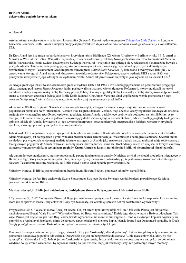 Dr Kurt Aland, doktrynalne poglądy krytyka tekstu A. Hembd Artykuł ukazał się pierwotnie w na łamach kwartalnika Quarterly Record wydawanym przez Trinitarian Bible Society w Londynie. Kwiecień - czerwiec, 2007. Autor niniejszej pracy jest pracownikiem Reformation International Theological Seminary i konsultantem TBS. Dr Kurt Aland jest być może najbardziej znanym krytykiem tekstu Biblijnego XX wieku. Urodzony w Berlinie w roku 1915, zmarł w Münster w Westfalii w 1994 r. Wszystkie najbardziej znane współczesne przekłady Nowego Testamentu: New International Version, Biblia Warszawska, Pismo Święte Towarzystwa Świętego Pawła, itd - wszystkie one opierają się w większości, i tłumaczone bywają z pracy dr Alanda. Tłumaczenia te posługują się jako podstawowym tekstem, wraz z jego aparatem krytycznym i alternatywnym brzmieniem, Nowym Testamentem Greckim promowanym przez United Bible Societies (Zjednoczone Towarzystwa Biblijne), w opracowaniu którego dr Aland zajmował kluczowe stanowisko redaktorskie. Faktycznie, trzecie wydanie UBS z roku 1983 jest praktycznie identyczne z jego własnym 26 wydaniem Nestle-Aland: tak przedstawia się wpływ, jaki wywarł on na tekście UBS.1 26 edycja greckiego tekstu Nestle-Aland oraz greckie wydania UBS z lat 1966 i 1983 odbiegają znacznie od powszechnie przyjętego tekstu znanego pod nazwą Textus Receptus, jakim posługiwali się wszyscy wielcy tłumacze Reformacji, którzy przełożyli na języki narodowe między innymi czeską Biblię Karlicką, polską Biblię Brzeską, angielską Biblię Genewską i Biblię Autoryzowaną (przez króla) znaną w niektórych częściach świata jako Biblię Króla Jakuba (King James Version). Stąd współczesne wersje pochodzące z tego nowego, 'krytycznego' tekstu różnią się znacznie od tych wyżej wymienionych przekładów. Aktualnie w Wielkiej Brytanii i Stanach Zjednoczonych Ameryki, w kręgach ewangelicznych daje się zaobserwować wzrost popularności przekładu New International Version oraz English Standard Version. Stąd obecnie, osoby regularnie chodzące do kościoła, znajdują się w szczególny sposób pod wpływem greckiego tekstu Alanda, a także jego osobliwych poglądów na tekst Biblijny. A to dlatego, że te same wersety, jakie regularnie uczęszczający do kościoła czytają w swoich Bibliach, odzwierciedlają poglądy teologiczne i opinie o tekście dr Alanda, jawiące się w jego wyborze interpretacji oraz odmiennych interpretacjach każdego wersetu w oryginale greckim, z którego pochodzą wszystkie te nowe przekłady. Jednak mało kto z regularnie uczęszczających do kościoła zna nazwisko dr Kurta Alanda. Wielu duchownych owszem - tekst NestleAland wymagany jest na zajęciach z greki w takich protestanckich seminariach jak Westminster Theological Seminary. Słyszeli oni na wykładach poświęconych krytycznej analizie tekstu o zasługach dr Alanda jako naukowca. Jednak bardzo nieliczni zdają sobie sprawę z teologicznych poglądów dr Alanda w kwestii nieomylności i bezbłędności Pisma św. Dochodzimy zatem do miejsca, w którym ukażemy zainteresowanym czytelnikom teologiczne poglądy Kurta Alanda w kwestii natchnienia Biblii, jej nieomylności i bezbłędności. Ale zanim do tego przejdziemy, musimy przedstawić pewne fundamentalne zasady. Niniejszy artykuł wychodzi spod pióra wierzącego w Biblię, i to tego, który się tego nie wstydzi. I tak, nie czujemy się niezręcznie potwierdzając, że jeśli mamy zrozumieć tekst Starego i Nowego Testamentu, musimy wiedzieć, co Biblia mówi o sobie. Stąd zgodnie potwierdzamy, że: *Musimy wierzyć, iż Biblia jest natchnionym, bezbłędnym Słowem Bożym, ponieważ tak mówi sama Biblia. *Musimy wierzyć, że Pan Bóg zachowuje Swoje Słowo przez Swojego Ducha Świętego wśród Swojego prawdziwego Kościoła, ponieważ to także mówi Biblia. Musimy wierzyć, iż Biblia jest natchnionym, bezbłędnym Słowem Bożym, ponieważ tak mówi sama Biblia. 2 Tymoteusza 3, 16-17: "Wszystkie Pismo od Boga jest natchnione i pożyteczne ku nauce, ku strofowaniu, ku naprawie, ku ćwiczeniu, które jest w sprawiedliwości, aby człowiek Boży był doskonały, ku wszelkiej sprawie dobrej dostatecznie wyćwiczony." Przypowieści 30, 5: "Wszelka mowa Boża jest czysta, On jest tarczą tym, którzy ufają w Nim." Jak wiele Pisma jest faktycznie natchnionego od Boga? "Całe Pismo." "Wszystkie Pismo od Boga jest natchnione." Każde jego słowo wyszło z Bożym oddechem. Tak więc, Pismo jest czyste tak jak Sam Bóg. Żadne trwałe wypaczenie nie może w nim zagościć. Choć w niektórych kopiach pojawiały się pomyłki w oryginalnych językach, mimo że heretycy nawet okaleczyli niektóre kopie, jednak dobra Boża Opatrzność sprawiła, że Duch Święty pomógł prawdziwemu Kościołowi odzyskać poprawne brzmienie z tych kopii. Ponieważ Pismo jest natchnione przez Boga, człowiek Boży jest 'doskonały', albo 'dopełniony'. Jest on kompletny w tym sensie, że nie potrzebuje dodatkowego punktu odniesienia. Oczywiście nie jest on bezgrzesznie doskonały: "...nie masz człowieka, który by nie grzeszył" (1 Królewska 8, 46). Jednak jest on 'doskonały' w tym sensie, że został doskonale wyposażony we wszystko, co potrzebuje wiedzieć po tej stronie wieczności, by wykonać służbę na tym świecie, stąd, jak zaznaczyliśmy, nie potrzebuje innych 'pomocy'. Faktycznie, jedyne pomoce, jakie może brać pod uwagę to dobre komentarze Biblijne, które pozwalają lepiej rozumieć Pismo. Ale i te komentarze człowiek Boży czyta jako podrzędne natchniętemu Pismu. Jakże doskonale został Boży człowiek wyposażony w pełni natchnione słowa Boże! Dzięki pełnemu, werbalnemu natchnieniu Pisma, Boży człowiek może powiedzieć, że został doskonale przygotowany do wszelkiego dobrego uczynku. Jeśli Pismo przestanie być natchnione, i to w pełni, w każdym Słowie, wówczas już więcej nie jest ono niezawodne i poży