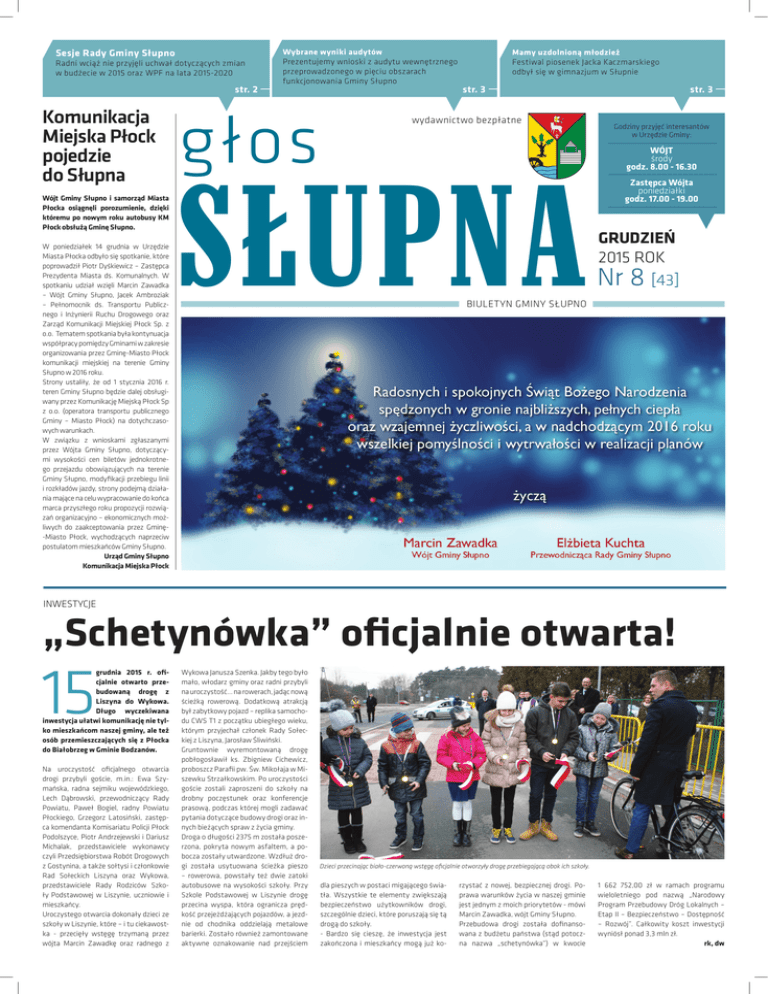 Sesje Rady Gminy Słupno Radni wciąż nie przyjęli uchwał dotyczących zmian w budżecie w 2015 oraz WPF na lata 2015-2020 str. 2 Komunikacja Miejska Płock pojedzie do Słupna Wójt Gminy Słupno i samorząd Miasta Płocka osiągnęli porozumienie, dzięki któremu po nowym roku autobusy KM Płock obsłużą Gminę Słupno. W poniedziałek 14 grudnia w Urzędzie Miasta Płocka odbyło się spotkanie, które poprowadził Piotr Dyśkiewicz – Zastępca Prezydenta Miasta ds. Komunalnych. W spotkaniu udział wzięli Marcin Zawadka – Wójt Gminy Słupno, Jacek Ambroziak – Pełnomocnik ds. Transportu Publicznego i Inżynierii Ruchu Drogowego oraz Zarząd Komunikacji Miejskiej Płock Sp. z o.o. Tematem spotkania była kontynuacja współpracy pomiędzy Gminami w zakresie organizowania przez Gminę-Miasto Płock komunikacji miejskiej na terenie Gminy Słupno w 2016 roku. Strony ustaliły, że od 1 stycznia 2016 r. teren Gminy Słupno będzie dalej obsługiwany przez Komunikację Miejską Płock Sp z o.o. (operatora transportu publicznego Gminy – Miasto Płock) na dotychczasowych warunkach. W związku z wnioskami zgłaszanymi przez Wójta Gminy Słupno, dotyczącymi wysokości cen biletów jednokrotnego przejazdu obowiązujących na terenie Gminy Słupno, modyfikacji przebiegu linii i rozkładów jazdy, strony podejmą działania mające na celu wypracowanie do końca marca przyszłego roku propozycji rozwiązań organizacyjno – ekonomicznych możliwych do zaakceptowania przez Gminę-Miasto Płock, wychodzących naprzeciw postulatom mieszkańców Gminy Słupno. Urząd Gminy Słupno Komunikacja Miejska Płock Wybrane wyniki audytów Prezentujemy wnioski z audytu wewnętrznego przeprowadzonego w pięciu obszarach funkcjonowania Gminy Słupno głos Mamy uzdolnioną młodzież Festiwal piosenek Jacka Kaczmarskiego odbył się w gimnazjum w Słupnie str. 3 wydawnictwo bezpłatne SŁUPNA str. 3 Godziny przyjęć interesantów w Urzędzie Gminy: WÓJT środy godz. 8.00 - 16.30 Zastępca Wójta poniedziałki godz. 17.00 - 19.00 GRUDZIEŃ 2015 ROK [43] Nr 8 BIULETYN GMINY SŁUPNO INWESTYCJE „Schetynówka” oficjalnie otwarta! 15 grudnia 2015 r. oficjalnie otwarto przebudowaną drogę z Liszyna do Wykowa. Długo wyczekiwana inwestycja ułatwi komunikację nie tylko mieszkańcom naszej gminy, ale też osób przemieszczających się z Płocka do Białobrzeg w Gminie Bodzanów. Na uroczystość oficjalnego otwarcia drogi przybyli goście, m.in.: Ewa Szymańska, radna sejmiku wojewódzkiego, Lech Dąbrowski, przewodniczący Rady Powiatu, Paweł Bogiel, radny Powiatu Płockiego, Grzegorz Latosiński, zastępca komendanta Komisariatu Policji Płock Podolszyce, Piotr Andrzejewski i Dariusz Michalak, przedstawiciele wykonawcy czyli Przedsiębiorstwa Robót Drogowych z Gostynina, a także sołtysi i członkowie Rad Sołeckich Liszyna oraz Wykowa, przedstawiciele Rady Rodziców Szkoły Podstawowej w Liszynie, uczniowie i mieszkańcy. Uroczystego otwarcia dokonały dzieci ze szkoły w Liszynie, które – i tu ciekawostka - przecięły wstęgę trzymaną przez wójta Marcin Zawadkę oraz radnego z Wykowa Janusza Szenka. Jakby tego było mało, włodarz gminy oraz radni przybyli na uroczystość… na rowerach, jadąc nową ścieżką rowerową. Dodatkową atrakcją był zabytkowy pojazd – replika samochodu CWS T1 z początku ubiegłego wieku, którym przyjechał członek Rady Sołeckiej z Liszyna, Jarosław Śliwiński. Gruntownie wyremontowaną drogę pobłogosławił ks. Zbigniew Cichewicz, proboszcz Parafii pw. Św. Mikołaja w Miszewku Strzałkowskim. Po uroczystości goście zostali zaproszeni do szkoły na drobny poczęstunek oraz konferencje prasową, podczas której mogli zadawać pytania dotyczące budowy drogi oraz innych bieżących spraw z życia gminy. Droga o długości 2375 m została poszerzona, pokryta nowym asfaltem, a pobocza zostały utwardzone. Wzdłuż drogi została usytuowana ścieżka pieszo – rowerowa, powstały też dwie zatoki autobusowe na wysokości szkoły. Przy Szkole Podstawowej w Liszynie drogę przecina wyspa, która ogranicza prędkość przejeżdżających pojazdów, a jezdnie od chodnika oddzielają metalowe barierki. Zostało również zamontowane aktywne oznakowanie nad przejściem Dzieci przecinając biało-czerwoną wstęgę oficjalnie otworzyły drogę przebiegającą obok ich szkoły. dla pieszych w postaci migającego światła. Wszystkie te elementy zwiększają bezpieczeństwo użytkowników drogi, szczególnie dzieci, które poruszają się tą drogą do szkoły. - Bardzo się cieszę, że inwestycja jest zakończona i mieszkańcy mogą już ko- rzystać z nowej, bezpiecznej drogi. Poprawa warunków życia w naszej gminie jest jednym z moich priorytetów - mówi Marcin Zawadka, wójt Gminy Słupno. Przebudowa drogi została dofinansowana z budżetu państwa (stąd potoczna nazwa „schetynówka”) w kwocie 1 662 752,00 zł w ramach programu wieloletniego pod nazwą „Narodowy Program Przebudowy Dróg Lokalnych – Etap II – Bezpieczeństwo – Dostępność – Rozwój”. Całkowity koszt inwestycji wyniósł ponad 3,3 mln zł. rk, dw 2 aktualności BIULETYN GMINY SŁUPNO | grudzień 2015 ROK SESJE RADY GMINY SŁUPNO W SKRÓCIE Bez rozstrzygnięć w sprawie budżetu Pełny koszyk świadectwem udanej akcji charytatywnej. Przedświąteczna zbiórka żywności. Warto się dzielić! Ostatni tydzień dla naszego wolontariatu był bardzo ważny. Została zorganizowana akcja pt. ,,Świąteczna paczka”. Polegała na tym, że my – wolontariusze ze Słupna - zbieraliśmy żywność i inne artykuły dla rodzin z naszej gminy. Pomogli nam członkowie klubu sportowego „Delta Słupno”. Akcja odbyła się tylko w jednym sklepie spożywczym w Słupnie, ale mimo to jesteśmy zadowoleni z ilości uzbieranych darów. W paczce obdarowany znajdzie m.in. mąkę, cukier, makaron, konserwy czy olej. Dziękujemy mieszkańcom gminy i wszystkim, którzy dołożyli