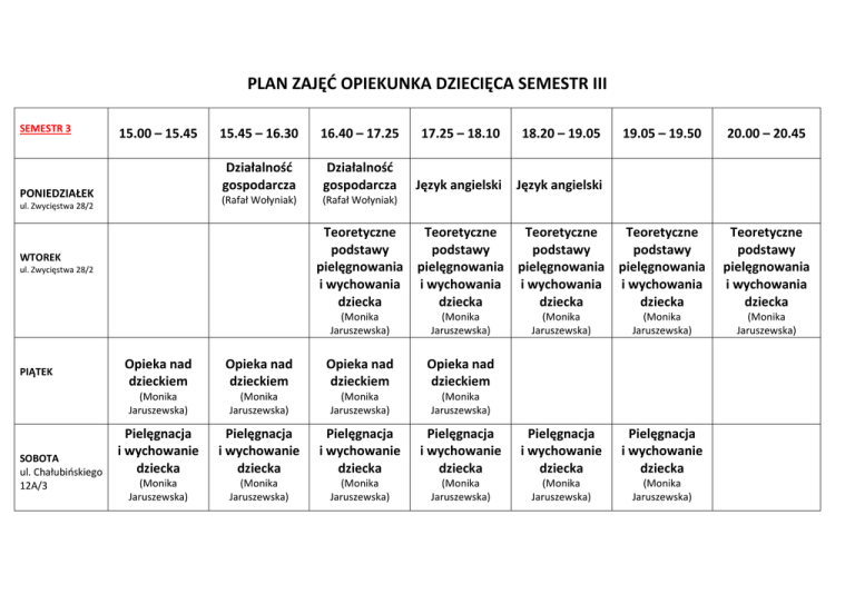 PLAN ZAJĘĆ OPIEKUNKA DZIECIĘCA SEMESTR III SEMESTR 3 15.00 – 15.45 PONIEDZIAŁEK ul. Zwycięstwa 28/2 15.45 – 16.30 16.40 – 17.25 17.25 – 18.10 18.20 – 19.05 Działalność gospodarcza Działalność gospodarcza Język angielski Język angielski (Rafał Wołyniak) (Rafał Wołyniak) WTOREK ul. Zwycięstwa 28/2 PIĄTEK SOBOTA ul. Chałubińskiego 12A/3 19.05 – 19.50 20.00 – 20.45 Teoretyczne Teoretyczne Teoretyczne Teoretyczne podstawy podstawy podstawy podstawy pielęgnowania pielęgnowania pielęgnowania pielęgnowania i wychowania i wychowania i wychowania i wychowania dziecka dziecka dziecka dziecka Teoretyczne podstawy pielęgnowania i wychowania dziecka (Monika Jaruszewska) (Monika Jaruszewska) (Monika Jaruszewska) (Monika Jaruszewska) Opieka nad dzieckiem Opieka nad dzieckiem Opieka nad dzieckiem Opieka nad dzieckiem (Monika Jaruszewska) (Monika Jaruszewska) (Monika Jaruszewska) (Monika Jaruszewska) Pielęgnacja i wychowanie dziecka Pielęgnacja i wychowanie dziecka Pielęgnacja i wychowanie dziecka Pielęgnacja i wychowanie dziecka Pielęgnacja i wychowanie dziecka Pielęgnacja i wychowanie dziecka (Monika Jaruszewska) (Monika Jaruszewska) (Monika Jaruszewska) (Monika Jaruszewska) (Monika Jaruszewska) (Monika Jaruszewska) (Monika Jaruszewska)