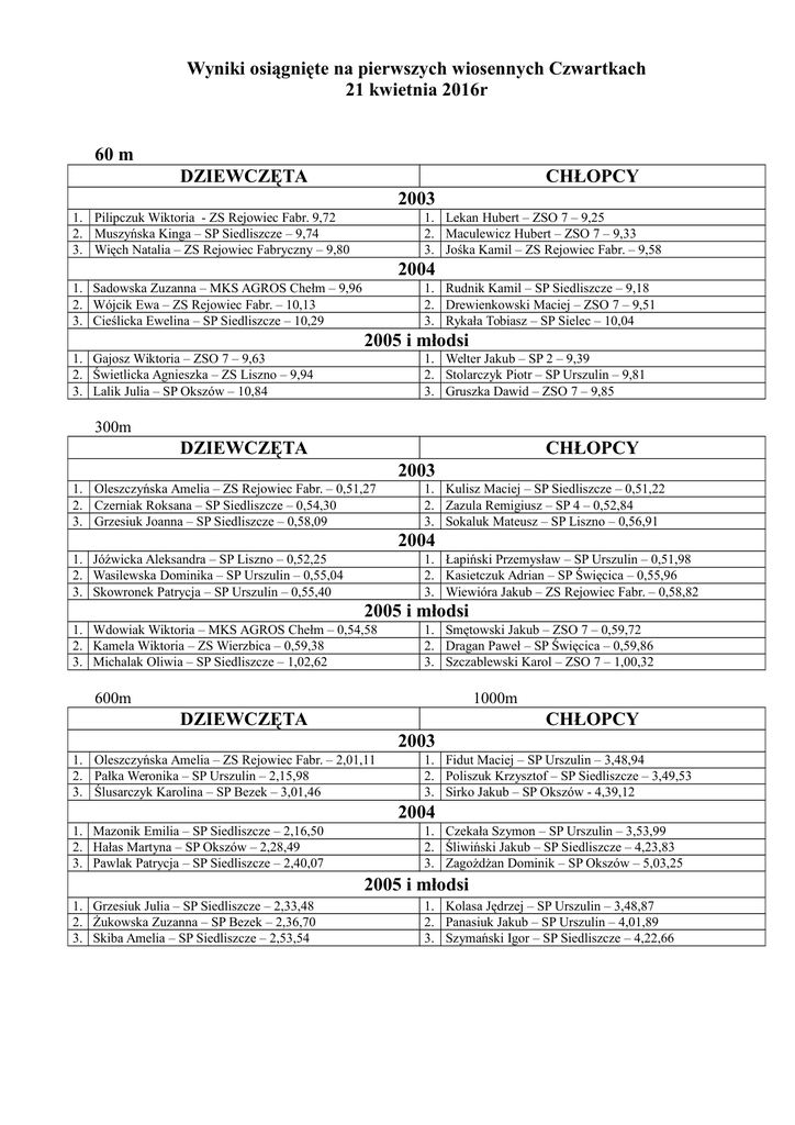 Wyniki osiągnięte na pierwszych wiosennych Czwartkach 21 kwietnia 2016r 60 m DZIEWCZĘTA CHŁOPCY 2003 1. Pilipczuk Wiktoria - ZS Rejowiec Fabr. 9,72 2. Muszyńska Kinga – SP Siedliszcze – 9,74 3. Więch Natalia – ZS Rejowiec Fabryczny – 9,80 1. Lekan Hubert – ZSO 7 – 9,25 2. Maculewicz Hubert – ZSO 7 – 9,33 3. Jośka Kamil – ZS Rejowiec Fabr. – 9,58 2004 1. Sadowska Zuzanna – MKS AGROS Chełm – 9,96 2. Wójcik Ewa – ZS Rejowiec Fabr. – 10,13 3. Cieślicka Ewelina – SP Siedliszcze – 10,29 1. Rudnik Kamil – SP Siedliszcze – 9,18 2. Drewienkowski Maciej – ZSO 7 – 9,51 3. Rykała Tobiasz – SP Sielec – 10,04 2005 i młodsi 1. Gajosz Wiktoria – ZSO 7 – 9,63 2. Świetlicka Agnieszka – ZS Liszno – 9,94 3. Lalik Julia – SP Okszów – 10,84 1. Welter Jakub – SP 2 – 9,39 2. Stolarczyk Piotr – SP Urszulin – 9,81 3. Gruszka Dawid – ZSO 7 – 9,85 300m DZIEWCZĘTA CHŁOPCY 2003 1. Oleszczyńska Amelia – ZS Rejowiec Fabr. – 0,51,27 2. Czerniak Roksana – SP Siedliszcze – 0,54,30 3. Grzesiuk Joanna – SP Siedliszcze – 0,58,09 1. Kulisz Maciej – SP Siedliszcze – 0,51,22 2. Zazula Remigiusz – SP 4 – 0,52,84 3. Sokaluk Mateusz – SP Liszno – 0,56,91 2004 1. Jóźwicka Aleksandra – SP Liszno – 0,52,25 2. Wasilewska Dominika – SP Urszulin – 0,55,04 3. Skowronek Patrycja – SP Urszulin – 0,55,40 1. Łapiński Przemysław – SP Urszulin – 0,51,98 2. Kasietczuk Adrian – SP Święcica – 0,55,96 3. Wiewióra Jakub – ZS Rejowiec Fabr. – 0,58,82 2005 i młodsi 1. Wdowiak Wiktoria – MKS AGROS Chełm – 0,54,58 2. Kamela Wiktoria – ZS Wierzbica – 0,59,38 3. Michalak Oliwia – SP Siedliszcze – 1,02,62 1. Smętowski Jakub – ZSO 7 – 0,59,72 2. Dragan Paweł – SP Święcica – 0,59,86 3. Szczablewski Karol – ZSO 7 – 1,00,32 600m 1000m DZIEWCZĘTA CHŁOPCY 2003 1. Oleszczyńska Amelia – ZS Rejowiec Fabr. – 2,01,11 2. Pałka Weronika – SP Urszulin – 2,15,98 3. Ślusarczyk Karolina – SP Bezek – 3,01,46 1. Fidut Maciej – SP Urszulin – 3,48,94 2. Poliszuk Krzysztof – SP Siedliszcze – 3,49,53 3. Sirko Jakub – SP Okszów - 4,39,12 2004 1. Mazonik Emilia – SP Siedliszcze – 2,16,50 2. Hałas Martyna – SP Okszów – 2,28,49 3. Pawlak Patrycja – SP Siedliszcze – 2,40,07 1. Czekała Szymon – SP Urszulin – 3,53,99 2. Śliwiński Jakub – SP Siedliszcze – 4,23,83 3. Zagożdżan Dominik – SP Okszów – 5,03,25 2005 i młodsi 1. Grzesiuk Julia – SP Siedliszcze – 2,33,48 2. Żukowska Zuzanna – SP Bezek – 2,36,70 3. Skiba Amelia – SP Siedliszcze – 2,53,54 1. Kolasa Jędrzej – SP Urszulin – 3,48,87 2. Panasiuk Jakub – SP Urszulin – 4,01,89 3. Szymański Igor – SP Siedliszcze – 4,22,66 Skok w dal DZIEWCZĘTA CHŁOPCY 2003 1. Pilipczuk Wiktoria – ZS Rejowiec Fabr. – 4,10 Więch Natalia – ZS Rejowiec Fabr. – 4,00 Stankiewicz Martyna – ZS Rejowiec Fabr. – 4,00 2. Muszyńska Kinga – SP Siedliszcze – 4,00 Czerniak Roksana – SP Siedliszcze – 4,00 1. Zazula Remigiusz – SP 4 – 4,30 2. Jośka Kamil – ZS Rejowiec Fabr. – 4,10 Sokaluk Mateusz – SP Liszno – 4,10 3. Biczak Weronika – ZS Rejowiec Fabr. – 3,90 3. Słaby Witold – SP Liszno – 3,80 Maculewicz Hubert – ZSO 7 – 3,80 2004 1. Kupracz Natalia – SP 4 – 3,90 1. Kasietczuk Adrian – SP Święcica – 4,40 Rudnik Kamil – SP Siedliszcze – 4,30 2. Poleszak Przemysław – SP Siedliszcze – 4,30 2. Cieślicka Ewelina – SP Siedliszcze – 3,60 Pawlak Patrycja – SP Siedliszcze – 3,50 Wójcik Ewa – ZS Rejowiec Fabr. – 3,50 3. Mocarska Aleksandra – SP Okszów – 3,50 Ambroży Natalia – SP Okszów – 3,50 3. Mazurek Bartłomiej – SP Siedliszcze – 3,80 2005 i młodsi 1. Gajosz Wiktoria – ZSO 7 – 3,70 2. Grzesiuk Julia – SP Siedliszcze – 3,50 Żukowska Zuzanna – SP Bezek – 3,40 3. Skiba Amelia – SP Siedliszcze – 3,40 1. Dragan Paweł – SP Święcica – 4,00 2. Smętowski Jakub – ZSO 7 – 3,50 3. Tarasiuk Bartłomiej – SP Sielec – 3,30 Piłeczka palantowa DZIEWCZĘTA CHŁOPCY 2003 Grzesiuk Joanna – SP Siedliszcze – 36m Żugaj Sandra – ZS Ruda-Huta – 36m 2. Pałka Weronika – SP Urszulin – 32m 3. Oleszczuk Matryna – SP 4 – 24m 1. 1. Dyszewski Kacper – SP 2 – 49m 2. Tywonik Jakub – ZSO 7 – 45m 3. Gilowski Karol – SP Ruda-Huta – 43m 2004 1. Jóźwicka Aleksandra – SP Liszno – 35m 2. Mazurek Natalia – SP Ruda-Huta – 31m 3. Branicka Dagmara – SP 4 – 29m 1. Karwat Kacper – SP Sielec – 50m 2. Łapiński Przemysław – SP Urszulin – 47m 3. Czekała Szymon – SP Urszulin – 36m 2005 i młodsi 1. Świetlicka Agnieszka – SP Liszno – 27m 2. Kamela Wiktoria – ZS Wierzbica – 26m Bolibok Wiktoria – SP Liszno – 20m 3. Brodaczewska Dominika – UKS START Pawłów – 20m 1. Stolarczyk Piotr – SP Urszulin – 36,5m 2. Welter Jakub – SP 2 – 34,5m Kozaczuk Kacper – SP Bezek – 34m 3. Dyszewski Oskar – SP 2 – 34m Skok wzwyż DZIEWCZĘTA CHŁOPCY 2003 1. Mękal Aleksandra – SP Okszów – 1,35 Mazur Kamila – SP Święcica – 1,35 2. Raszyński Szymon – UKS START Pawłów – 1,15 1. Karpiński Jakub – ZSO 7 – 1,15 Lekan Hubert – ZSO 7 – 1,15 2. - 2004 1. Daniec Julia – SP Okszów – 1,15 2. Frania Patrycja – SP Liszno – 1,05 Kostkowski Piotr – SP Okszów – 1,10 Zagożdżan Dominik – SP Okszów – 1,10 2. Karpiuk Igor – SP Bezek – 1,05 1. 2005 i młodsi 1. 2. 3. - 1. Sieńko Patryk – ZSO 7 – 1,15 2. Socha Patryk – UKS START Pawłów – 1,05 3. Raszyński Kacper – UKS START Pawłów – 1,00