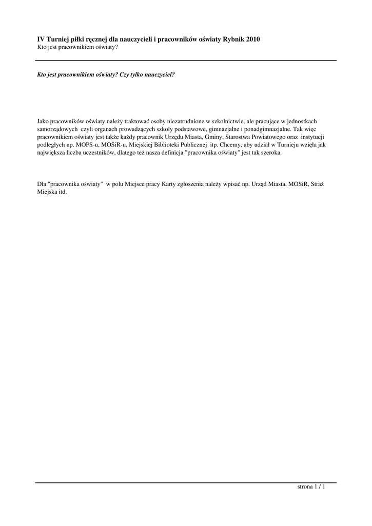 IV Turniej piłki ręcznej dla nauczycieli i pracowników oświaty Rybnik 2010 Kto jest pracownikiem oświaty? Kto jest pracownikiem oświaty? Czy tylko nauczyciel? Jako pracowników oświaty należy traktować osoby niezatrudnione w szkolnictwie, ale pracujące w jednostkach samorządowych czyli organach prowadzących szkoły podstawowe, gimnazjalne i ponadgimnazjalne. Tak więc pracownikiem oświaty jest także każdy pracownik Urzędu Miasta, Gminy, Starostwa Powiatowego oraz instytucji podległych np. MOPS-u, MOSiR-u, Miejskiej Biblioteki Publicznej itp. Chcemy, aby udział w Turnieju wzięła jak największa liczba uczestników, dlatego też nasza definicja "pracownika oświaty" jest tak szeroka. Dla "pracownika oświaty" w polu Miejsce pracy Karty zgłoszenia należy wpisać np. Urząd Miasta, MOSiR, Straż Miejska itd. strona 1 / 1