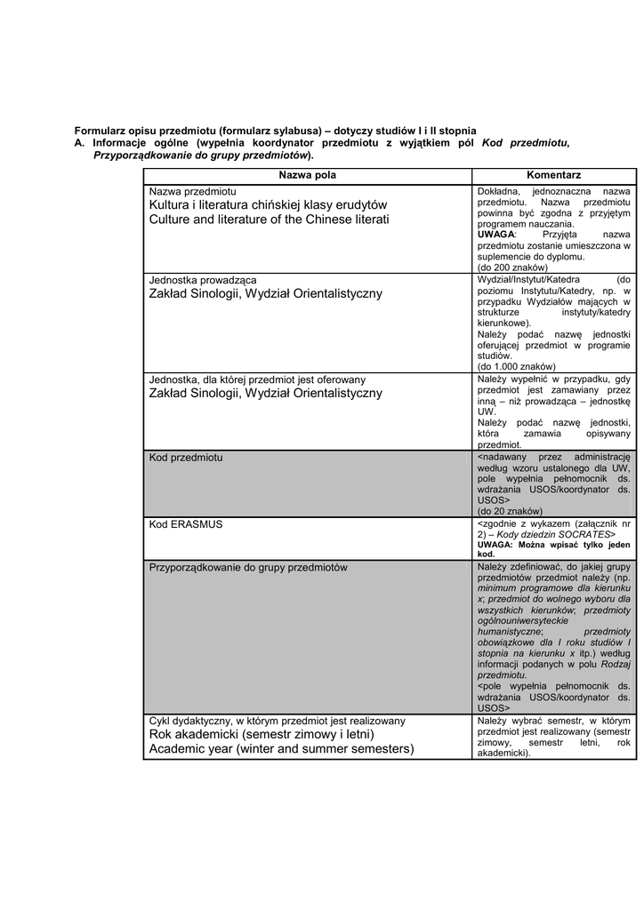 Formularz opisu przedmiotu (formularz sylabusa) – dotyczy studiów I i II stopnia A. Informacje ogólne (wypełnia koordynator przedmiotu z wyjątkiem pól Kod przedmiotu, Przyporządkowanie do grupy przedmiotów). Nazwa pola Nazwa przedmiotu Kultura i literatura chińskiej klasy erudytów Culture and literature of the Chinese literati Jednostka prowadząca Zakład Sinologii, Wydział Orientalistyczny Jednostka, dla której przedmiot jest oferowany Zakład Sinologii, Wydział Orientalistyczny Kod przedmiotu Kod ERASMUS Komentarz Dokładna, jednoznaczna nazwa przedmiotu. Nazwa przedmiotu powinna być zgodna z przyjętym programem nauczania. UWAGA: Przyjęta nazwa przedmiotu zostanie umieszczona w suplemencie do dyplomu. (do 200 znaków) Wydział/Instytut/Katedra (do poziomu Instytutu/Katedry, np. w przypadku Wydziałów mających w strukturze instytuty/katedry kierunkowe). Należy podać nazwę jednostki oferującej przedmiot w programie studiów. (do 1.000 znaków) Należy wypełnić w przypadku, gdy przedmiot jest zamawiany przez inną – niż prowadząca – jednostkę UW. Należy podać nazwę jednostki, która zamawia opisywany przedmiot. <nadawany przez administrację według wzoru ustalonego dla UW, pole wypełnia pełnomocnik ds. wdrażania USOS/koordynator ds. USOS> (do 20 znaków) <zgodnie z wykazem (załącznik nr 2) – Kody dziedzin SOCRATES> UWAGA: Można wpisać tylko jeden kod. Przyporządkowanie do grupy przedmiotów Cykl dydaktyczny, w którym przedmiot jest realizowany Rok akademicki (semestr zimowy i letni) Academic year (winter and summer semesters) Należy zdefiniować, do jakiej grupy przedmiotów przedmiot należy (np. minimum programowe dla kierunku x; przedmiot do wolnego wyboru dla wszystkich kierunków; przedmioty ogólnouniwersyteckie humanistyczne; przedmioty obowiązkowe dla I roku studiów I stopnia na kierunku x itp.) według informacji podanych w polu Rodzaj przedmiotu. <pole wypełnia pełnomocnik ds. wdrażania USOS/koordynator ds. USOS> Należy wybrać semestr, w którym przedmiot jest realizowany (semestr zimowy, semestr letni, rok akademicki). Skrócony opis przedmiotu Analiza wybranych postaci chińskich erudytów i ich dokonań, oraz wpływu na kształtowanie się kultury chińskiej i tożsamości elit intelektualnych Analysis of chosen Chinese literati, their input and influence on the shaping of Chinese culture and identity of the educated elites Forma(y)/typ(y) zajęć Konwersatorium Zajęcia obejmują następujące zagadnienia: 1. Tao Qian (Tao Yuanming) – pierwszy chiński poetaurzędnik na dobrowolnym wygnaniu? 2. Li Bai – niepokorny i niezależny taoistyczny wieszcz czy dworski poeta w niełasce? 3. Ouyang Xiu – miłość erudytów do wzorów starożytności 4. Su Shi i Mi Fu – pierwsi artyści tradycji wenren? 5. Ortodoksja i innowacja: 14 literatów mingowskich a szkoła Gong’an rodziny Yuan 6. Czy kupiec może być erudytą? Sylwetki słynnych bogaczy epok Ming i Qing 7. Najwięksi erudyci wśród cesarzy: Kangzi, Yongzheng i Qianlong 8. Wu Jingzi i charakterystyka klasy urzędników qingowskich 9. Cao Xueqin i obraz wykształconych elit 10. Klasa erudytów (wenren) a klasa urzędników (shidafu) The course includes the following topics: 1. Tao Qian (Tao Yuanming) – the first Chinese poet-official in voluntary exile? 2. Li Bai – untamed and uncouth Daoist bard or a disfavoured court poet? 3. Ouyang Xiu – literati love for antiquity 4. Su Shi i Mi Fu – first artists of the wenren tradition? 5. Orthodoxy and innovation: 14 Ming poets and the Gong’an school of the Yuan family 6. Can a merchant be a literati? Famous rich of the Ming and Qing 7. The greatest literati among Emperors: Kangzi, Yongzheng Krótki opis treści zajęć, rozszerzający sformułowania zawarte w tytule i wskazujący, „o czym to jest”, na ogólnym poziomie i w sposób możliwie przystępny. Ma ułatwić dokonanie wyboru zajęć. Mile widziane wskazanie powiązań z innymi przedmiotami lub dziedzinami. (do 1.000 znaków) Należy wskazać, czy przedmiot realizowany jest w formie: – wykładu; – ćwiczeń; – seminarium; – konwersatorium; – laboratorium; – zajęć terenowych itp. UWAGA: Jeżeli przedmiot jest realizowany w kilku formach dydaktycznych (składa się np. z wykładu i ćwiczeń, wykładu i laboratorium itp.), należy wskazać wszystkie formy realizacji przedmiotu. Należy podać liczbę godzin zorganizowanych dla danej formy zajęć. (do 1.000 znaków) Jasny i zwięzły opis treści zajęć pozwalający określić ich zakres tematyczny. Jeżeli przedmiot realizowany jest w kilku formach (np. wykład i ćwiczenia), należy opisać wykład i ćwiczenia oddzielnie. Np. „Wykład ma za zadanie...”, „Ćwiczenia poświęcone są...” (zgodnie z informacją zamieszczoną w polu wyżej, dotyczącą form(y) zajęć). Korzystne byłoby określenie szacunkowej, całkowitej liczby godzin, które student musi przeznaczyć na osiągnięcie zdefiniowanych dla przedmiotu efektów uczenia się (biorąc pod uwagę godziny zorganizowane, sposób zaliczenia, pracę samodzielną studenta). (do 65 tys. znaków) and Qianlong 8. Wu Jingzi and the picture of Qing officials 9. Cao Xueqin and the well-educated elites 10. Two social classes: the literati (wenren) and the officials (shidafu) Wymagania wstępne Zaliczone wykłady z historii Chin, wiedzy o literaturze i kulturze Chin, wiedzy o filozofii/religii Chin, wiedzy o sztuce Chin, zagadnień społeczno-kulturowych Chin. Znajomość chińskiego języka klasycznego w stopniu zadowalającym, płynna znajomość chińskiego języka współczesnego Wymagania formalne Należy podać nazwy przedmiotów, których wcześniejsze formalne zaliczenie jest niezbędne do realizacji opisywanego przedmiotu. Credits in the following subjects: History of China, Knowledge of Chinese literature and culture, Knowledge of Chinese philosophy/religion, Knowledge of Chinese art, Social and cultural aspects of China.