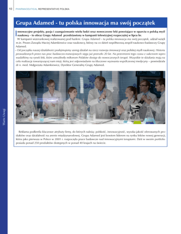 10 PHARMACEUTICAL REPRESENTATIVE POLSKA Grupa Adamed - tu polska innowacja ma swój początek I Warte Uwagi nnowacyjne projekty, pasja i zaangażowanie wielu ludzi oraz nowoczesne leki powstające w oparciu o polską myśl naukową – to obraz Grupy Adamed przedstawiony w kampanii telewizyjnej rozpoczętej w lipcu br. W kampanii wizerunkowej realizowanej pod hasłem: Grupa Adamed – tu polska innowacja ma swój początek, udział wzięli m.in. Prezes Zarządu Maciej Adamkiewicz oraz naukowcy, którzy na co dzień współtworzą zespół naukowo-badawczy Grupy Adamed. – Od początku naszej działalności podejmujemy szereg działań na rzecz rozwoju innowacji oraz polskiej myśli naukowej. Historia prowadzonych przez nas prac badawczo-rozwojowych sięga już przeszło 20 lat. Na przestrzeni tego czasu z sukcesem wprowadziliśmy na rynek leki, które umożliwiły milionom Polaków dostęp do nowoczesnych terapii. Wszystkie te działania mają na celu realizację towarzyszącej nam misji, którą jest odpowiadanie na kluczowe wyzwania współczesnej medycyny – powiedziała dr n. med. Małgorzata Adamkiewicz, Dyrektor Generalny Grupy Adamed. Reklama podkreśla kluczowe atrybuty firmy, do których należą: polskość, innowacyjność, wysoka jakość oferowanych produktów oraz działalność na arenie międzynarodowej. Grupa Adamed jest bowiem liderem na rynku leków nowej generacji, która jako pierwsza w Polsce w 2001 r. rozpoczęła prace badawcze nad innowacyjnymi terapiami. Dziś w swoim portfolio posiada ponad 250 produktów dostępnych w ponad 40 krajach na świecie.