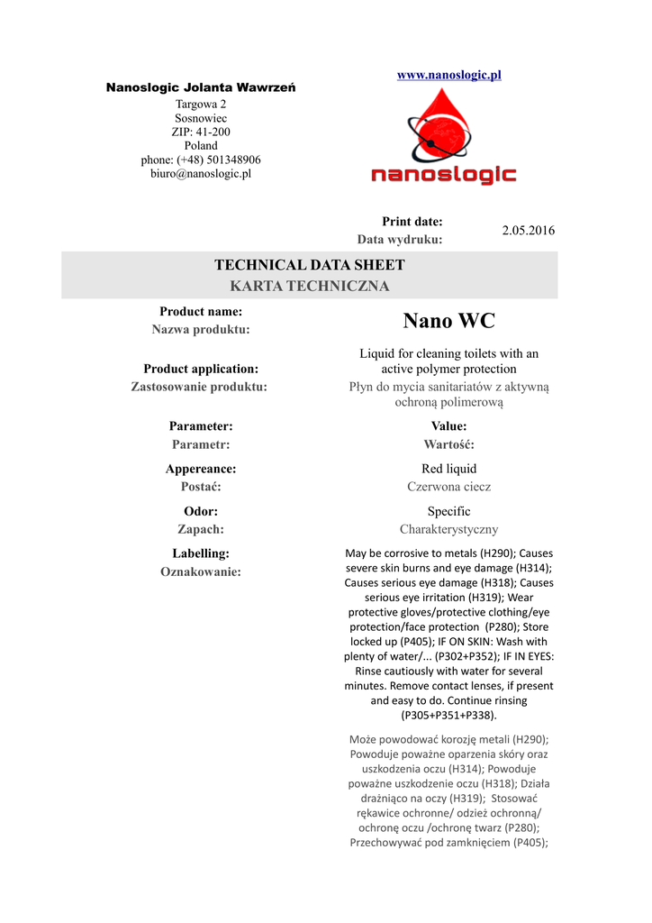 Nanoslogic Jolanta Wawrzeń Targowa 2 Sosnowiec ZIP: 41-200 Poland phone: (+48) 501348906 [email protected] www.nanoslogic.pl Print date: Data wydruku: 2.05.2016 TECHNICAL DATA SHEET KARTA TECHNICZNA Product name: Nazwa produktu: Nano WC Product application: Zastosowanie produktu: Liquid for cleaning toilets with an active polymer protection Płyn do mycia sanitariatów z aktywną ochroną polimerową Parameter: Parametr: Value: Wartość: Appereance: Postać: Red liquid Czerwona ciecz Odor: Zapach: Specific Charakterystyczny Labelling: Oznakowanie: May be corrosive to metals (H290); Causes severe skin burns and eye damage (H314); Causes serious eye damage (H318); Causes serious eye irritation (H319); Wear protective gloves/protective clothing/eye protection/face protection (P280); Store locked up (P405); IF ON SKIN: Wash with plenty of water/... (P302+P352); IF IN EYES: Rinse cautiously with water for several minutes. Remove contact lenses, if present and easy to do. Continue rinsing (P305+P351+P338). Może powodować korozję metali (H290); Powoduje poważne oparzenia skóry oraz uszkodzenia oczu (H314); Powoduje poważne uszkodzenie oczu (H318); Działa drażniąco na oczy (H319); Stosować rękawice ochronne/ odzież ochronną/ ochronę oczu /ochronę twarz (P280); Przechowywać pod zamknięciem (P405); W PRZYPADKU KONTAKTU ZE SKÓRĄ: Umyć dużą ilością wody z mydłem (P302+P352); W PRZYPADKU DOSTANIA SIĘ DO OCZU: Ostrożnie płukać wodą przez kilka minut. Wyjąć soczewki kontaktowe, jeżeli są i można je łatwo usunąć. Nadal płukać (P305+P351+P338). Pictograms: Piktogramy: Package: Opakowanie: 1L bottle; 5L, 10L, 20L canisters; 200L barrel; 1000L Mauser container Butelka 1L; kanister 5L, 10L, 20L; beczka 200L; paletopojemnik 1000L RID/ADR: none / brak Transportation: Transportowanie: ADR code: none / brak UN number: none / brak Safety of handling and storage: Bezpieczeństwo przechowywania i stosowania: Wear goggles and nitryle/latex gloves. Wash hands thoroughly after handling. Store in a cool dry place in original containers, keep tighty closed. W trakcie pracy z preparatem należy założyć gogle oraz rękawiczki nitrylowe/lateksowe. Dokładnie umyć ręce po pracy z preparatem. Przechowywać w suchym, chłodnym miejscu w oryginalnym opakowaniu. Expiration date: Data ważności: 2 years 2 lata Other information: Inne informacje: None Brak Purpose: Przeznaczenie: Innovative product for daily cleaning of toilets with active polymeric protection. Innowacyjny produkt do codziennego mycia sanitariatów z aktywną ochroną polimerową. Properties: Właściwości: The polymeric formulation designed to clean and protect the acid-resistant surfaces. Active ingrediends of product are excellent at removing dirt from the cleaned surface. Effectively removes rust and stone formations, greasy grime, limescale and soap. The product leaves a fresh scent and gives a delicate shine. The polymers used in the preparation delay the effect of the re-deposition of dirt and simplify the process of creating on the washed surface protective film. Polimerowy preparat przeznaczony do czyszczenia i zabezpieczenia powierzchni kwasoodpornych. Zawarte w preparacie substancje aktywne doskonale usuwają zabrudzenia z czyszczonych powierzchni. Skutecznie usuwa rdzawe i kamienne nacieki, tłusty brud, osady wapienne i mydlane. Produkt pozostawia świeży zapach i nadaje delikatny połysk. Polimery zastosowane w preparacie opóźniają efekt ponownego osadzania się brudu oraz ułatwiają proces kolejnego mycia tworząc na mytych powierzchniach film ochronny. Application method: Sposób użycia: Spray the dirty surface with the produc, and then remove the dirt, sediments, and strokes. Then rinse it with tap water. The product is prepared for direct using. Spryskać zabrudzoną powierzchnię preparatem, a następnie usunąć brud, osady oraz nacieki. Następnie należy spłukać powierzchnię bieżącą wodą. Produkt przeznaczony do bezpośredniego użycia.