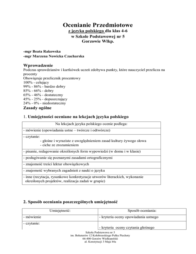 Ocenianie Przedmiotowe z języka polskiego dla klas 4-6 w Szkole Podstawowej nr 5 Gorzowie Wlkp. -mgr Beata Rakowska -mgr Marzena Nowicka Czacharska Wprowadzenie Podczas sprawdzianów i kartkówek uczeń zdobywa punkty, które nauczyciel przelicza na procenty Obowiązuje przelicznik procentowy 100% - celujący 99% - 86% - bardzo dobry 85% - 66% - dobry 65% - 46% - dostateczny 45% - 25% - dopuszczający 24% - 0% - niedostateczny Zasady ogólne 1. Umiejętności oceniane na lekcjach języka polskiego Na lekcjach języka polskiego ocenie podlega: - mówienie (opowiadania ustne – twórcze i odtwórcze) - czytanie: - głośne i wyraziste z uwzględnieniem zasad kultury żywego słowa - ciche ze zrozumieniem - pisanie, redagowanie określonych form wypowiedzi (w domu i w klasie) - posługiwanie się poznanymi zasadami ortograficznymi - znajomość treści lektur obowiązkowych - znajomość wybranych zagadnień z nauki o języku - inne (recytacja, rysunkowe konkretyzacje utworów literackich, wykonanie określonych projektów, realizacja zadań w grupie) 2. Sposób oceniania poszczególnych umiejętność Umiejętność: - mówienie Sposób oceniania: - kryteria oceny opowiadania ustnego - czytanie: - kryteria oceny czytania głośnego Szkoła Podstawowa nr 5 im. Bohaterów 12 Kołobrzeskiego Pułku Piechoty 66-400 Gorzów Wielkopolski al. Konstytucji 3 Maja 44a - głośne i wyraziste z uwzględnieniem zasad kultury żywego słowa - według liczby uzyskanych punktów przeliczanych na oceny - ciche ze zrozumieniem [podawane po każdym sprawdzianie] - pisanie, redagowanie określonych form wypowiedzi (w domu i w klasie) - kryteria oceny pisemnych prac klasowych i domowych (ćwiczenia redakcyjne) - posługiwanie się poznanymi zasadami ortograficznymi - zasady oceniania dyktand - znajomość treści lektur obowiązkowych - według liczby uzyskanych punktów przeliczanych na oceny [podawane po każdym sprawdzianie] - znajomość wybranych zagadnień z nauki o języku - według liczby uzyskanych punktów przeliczanych na oceny - recytacja - kryteria oceny recytacji - rysunkowe konkretyzacje utworów literackich - kryteria oceny rysunkowych konkretyzacji utworów - realizacja określonych projektów - kryteria podawane po realizacji projektu, uwzględniające zasady ustalone przed jego realizacją - ocena realizacji zadań w grupie - kryteria oceny współpracy w grupie [podawane po każdym sprawdzianie] 3. Skala ocen - celujący (6) celujący minus (6-) bardzo dobry + (5+) bardzo dobry (5) dobry plus (4+) dobry (4) dostateczny plus (3+) dostateczny (3) dopuszczający plus (2+) dopuszczający (2) niedostateczny (1) ------------------------------------------------------------------------------------------------------------ 4. „Plusy” (+) i „minusy” (–) Uczniowie otrzymują także „plusy” i „minusy”. „Minus” uczeń może otrzymać za: - brak zadania domowego brak podręczników, zeszytu Szkoła Podstawowa nr 5 im. Bohaterów 12 Kołobrzeskiego Pułku Piechoty 66-400 Gorzów Wielkopolski al. Konstytucji 3 Maja 44a - brak potrzebnych materiałów - słabe, złe wywiązanie się z zadań wykonywanych w grupie - braki, niekompletność (tematów, notatek, zadań domowych) zeszytu przedmiotowego. Trzy „minusy” równe są ocenie niedostatecznej. „Minusy” nauczyciel odnotowuje w swoim notatniku. „Plus” uczeń może otrzymać za: - nieskomplikowane, krótkie zadania domowe przyniesienie dodatkowych materiałów wykorzystanych podczas lekcji dobre wywiązanie się z zadań realizowanych w grupie kompletność zeszytu przedmiotowego. „Plusy” nauczyciel odnotowuje w swoim notatniku. Trzy minusy = ocena niedostateczna Trzy plusy – ocena bardzo dobra Testy diagnozujące są sprawdzane wg kryteriów OKE. Dopuszczalne są dwa nieprzygotowania na semestr, ale uczeń powinien zgłosić przed rozpoczęciem lekcji swoje nieprzygotowanie. Honorowane są w wyjątkowych sytuacjach usprawiedliwienia od rodzica. Prace klasowe powinny być zapowiadane z tygodniowym wyprzedzeniem. Sprawdzian z trzydniowym wyprzedzeniem. Ilość dopuszczanych błędów w pracach pisemnych: O błędów – celujący 1 błąd –bardzo dobry 2 błędy – dobry 3-4 błędy – dostateczny 5 błędów – dopuszczający 6 błędów- niedostateczny Ilość dopuszczalnych błędów dla uczniów z obniżonymi wymaganiami - dysortografia 0-1 błąd – celujący 2 błędy – bardzo dobry 3 błędy – dobry 4-5 błędów – dostateczny 6-7 błędów – dopuszczający 8 błędów - niedostateczny 5. Ilość uzyskiwanych ocen w semestrze za poszczególne umiejętności Przyjmuje się minimalną ilość ocen - 8 ocen- uzyskanych przez ucznia w ciągu jednego semestru ocen za poniższe umiejętności: - mówienie – - czytanie głośne – - czytanie ciche ze zrozumieniem – - pisanie, redagowanie określonych form wypowiedzi (w domu i w klasie) – - posługiwanie się poznanymi zasadami ortograficznymi (dyktanda) – Sprawdzian - do 30 minut Kartkówka – do 10 minut Praca klasowa – 45 minut lub 2 x 45 minut Szkoła Podstawowa nr 5 im. Bohaterów 12 Kołobrzeskiego Pułku Piechoty 66-400 Gorzów Wielkopolski al. Konstytucji 3 Maja 44a Diagnoza – wg wymagań 6. Informowanie uczniów i rodziców (prawnych opiekunów) o osiągnięciach, postępach w nauce Rodzic powiadomiony jest o ocenach przez logowanie się na stronach Librusa, przez systematyczne obecności podczas zebrań z rodzicami, analizę prac pisemnych, notatek i sprawdzianów napisanych przez ucznia, wpisy w zeszyt przedmiotowy. Rodzic jest zobowiązany podpisać ocenę z pracy klasowej, diagnozy,, a uczeń powinien następnego dnia zwrócić swą pracę opatrzoną podpisem rodzica nauczycielowi. Omówione i poprawione prace, np.: kartkówki, sprawdziany, pisane przez uczniów w klasie pozostają w pracowni polonistycznej. Uczniowie i rodzice po wcześniejszym umówieniu się z nauczycielem mają prawo wglądu do prac i dodatkowych uzasadnień