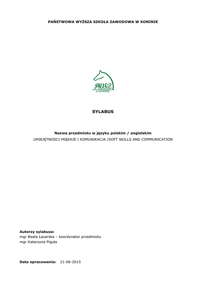 PAŃSTWOWA WYŻSZA SZKOŁA ZAWODOWA W KONINIE SYLABUS Nazwa przedmiotu w języku polskim / angielskim UMIEJĘTNOSCI MIĘKKIE I KOMUNIKACJA /SOFT SKILLS AND COMMUNICATION Autorzy sylabusa: mgr Beata Łazarska – koordynator przedmiotu mgr Katarzyna Piguła Data opracowania: 21-06-2015 1. Podstawowe informacje Moduł kształcenia fakultatywny Forma zajęć zajęcia praktyczne (warsztaty i projekty) Wymiar godzinowy 50 godz., w tym: warsztaty i projekty – 30 godz. w języku polskim warsztaty i projekty – 20 godz. w języku angielskim Język wykładowy polski (JP), angielski (JA) Forma zaliczenia Symulacja rozmowy kwalifikacyjnej Rok akademicki 2015/2016 2. Cele kształcenia C01 Nabycie umiejętności i świadomości samopoznania i procesów komunikacji z innym człowiekiem C02 Nabycie kompetencji samopoznania, komunikacji z partnerem biznesowym, oraz umiejętności ułatwiających wejścia i utrzymania się na rynku pracy, także jako podmiotu prowadzącego jednoosobową działalność gospodarczą C03 Ukształtowanie u studentów umiejętności radzenia sobie w stresie zawodowym, np. podczas rozmowy kwalifikacyjnej 3. Wymagania wstępne Student, który rozpoczyna zajęcia z przedmiotu: • wiedza – zna podstawowe zasady komunikacji • umiejętności – potrafi posługiwać się językiem angielskim w stopniu komunikatywnym • kompetencje społeczne – docenia znaczenie współdziałania i pracy w grupie 4. Efekty kształcenia Symbol Efekty kształcenia dla przedmiotu „Umiejętności miękkie i komunikacja” Student, który zaliczył przedmiot: EP_W02 Zna podstawowe wiadomości o komunikacji, komunikacji werbalnej i niewerbalnej, stylach komunikacji posiada wiedzę z zakresu typów osobowości, radzenia sobie ze stresem EP_W03 posiada wiedzę na temat motywacji i wyznaczania celów EP_W04 posiada wiedzę na temat zasad prowadzenia rozmowy kwalifikacyjnej EP_U01 potrafi zidentyfikować zachowania niewerbalne w komunikacji EP_U02 posiada umiejętność planowania i wyznaczania celów EP_U03 potrafi ocenić swoją motywację, umiejętności i kompetencje EP_U04 potrafi przeprowadzić analizę SWOT swojej osoby EP_W01 EP_U05 posiada umiejętność używania języka korzyści EP_U06 posiada umiejętność wywierania wrażenia na innych i prezentacji swojej osoby w czasie rozmowy kwalifikacyjnej zarówno w języku polski jak i w angielskim EP_K01 docenia rolę i znaczenie autoprezentacji EP_K02 współdziała i pracuje w zespole w celu poznania siebie i innych EP_K03 dba o tworzenie odpowiedniej kultury języka w komunikacji z innymi 2 5. Treści kształcenia ZAJĘCIA PRAKTYCZNE (WARSZTATY I PROJEKTY) ZP01 liczba godzin JP/JA Podstawowe wiadomości o komunikacji 1/1 ZP02 Komunikacja werbalna, niewerbalna, rola pierwszego wrażenia ZP03 Style komunikacji 2/2 ZP04 Typy osobowości 3/2 Istota i pojęcie motywacji 3/2 ZP06 Planowanie ,wyznaczanie celów, metoda SMART(ER) 4/2 ZP07 Określanie swoich umiejętności i kompetencji, analiza SWOT 2/2 ZP08 Techniki wywierania wrażenia na innych 3/1 ZP09 Używanie języka korzyści 3/2 ZP10 Metody radzenia sobie ze stresem 3/1 ZP11 Rozmowa kwalifikacyjna 4/3 ZP05 Ogółem 2/2 30/20 6. Metody kształcenia MK01 wykład z elementami dyskusji MK02 studium przypadku (case study) MK03 praca w zespołach,ćwiczenia MK04 prezentacja i dyskusja 7. Metody oceny MO01 Przygotowanie rozmowy kwalifikacyjnej w języku polskim/ angielskim MO02 prezentacja rozmowy kwalifikacyjnej MO03 grupowa ocena mocnych i słabych stron studenta w trakcie rozmowy kwalifikacyjnej 8. Literatura • • • • • • • • • • • • • • • • Alberti R., Emmons M., 2004. Asertywność. Sięgaj po to, czego chcesz, nie raniąc innych. GWP, Gdańsk. Augustynek A., 2008. Psychologia. Jak ślimak piął się pod górę. Diffin, Warszawa. Aronson. E., 2005. Człowiek istota społeczna. PWN, Warszawa. Barlow J., Maul D., 2000. Emotional Value. Berrett-Koehler Publisher, Berkeley. Davis M., 2003. Empatia. O umiejętności współodczuwania. GWP, Gdańsk. Gut J., Haman W., 1993. Docenić konflikt. PWE, Warszawa. Gut J., Haman W., 1999. Handlowanie to gra. Helion, Gliwice. Hartley P., 2006. Komunikowanie Interpersonalne. Wydawnictwo Astrum, Wrocław. Nęcki Z.,1996. Komunikacja międzyludzka. Wyd. Profesjonalne Szkoły Biznesu, Kraków. Pankiewicz K., 2007. Alchemia sprzedaży. Helion, Gliwice. Rosell. L., 2007. Techniki sprzedaż. BL Info Polska, Gdańsk. Sobczak - Matysiak. J., 1998. Psychologia kontaktu z klientem. WSB, Poznań. Stewart J., 2008. Mosty zamiast murów Podręcznik komunikacji interpersonalnej. PWN, Warszawa. Tracy B., 2007. Psychologia sprzedaży. MT Biznes, Warszawa. 3 9. Sposoby weryfikacji zakładanych efektów kształcenia Efekty kształcenia dla przedmiotu Cele kształcenia (C) Treści kształcenia (ZP) Metody kształcenia (MK) Metody oceny (MO) EP_W01 C01- C03 ZP01-ZP03 MK01-MK04 MO01-MO02 EP_W02 C01- C03 ZP04,ZP10 MK01-MK04 MO01-MO02 EP_W03 C01- C03 ZP05- ZP06 MK01-MK04 MO01-MO02 EP_W04 C01- C03 ZP01-ZP11 MK01-MK04 MO01-MO02 EP_U01 C01-C03 ZP01-ZP02 MK01-MK04 MO01-MO02 EP_U02 C01-C03 ZP05-ZP06 MK01-MK04 MO01-MO02 MO01-MO02 EP_U03 C01-C03 ZP07 MK01-MK04 EP_U04 C01-C03 ZP07 MK01-MK04 MO01-MO02 EP_U05 C01-C03 ZP09 MK01-MK04 MO01-MO02 MO01-MO02 EP_U06 C01-C03 ZP07-ZP11 MK01-MK04 EP_K01 C01-C03 ZP01-ZP11 MK01-MK04 MO01-MO02 EP_K02 C01-C03 ZP01-ZP11 MK01-MK04 MO01-MO02 ZP01-ZP11 MK01-MK04 MO01-MO02 EP_K03 C01-C03 10. Prowadzący przedmiot tytuł/stopień naukowy, imię i nazwisko mgr Katarzyna Piguła adres e-mail [email protected] 11. Inne uwagi, wyjaśnienia i uzasadnienia ----------------------------------------------------------- 4