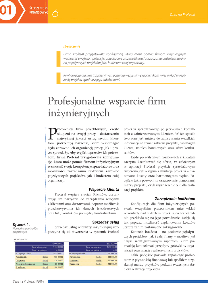 6 Czas na Profesal streszczenie Firma Profesal przygotowała konfigurację, która może pomóc firmom inżynieryjnym wzmocnić swoje kompetencje sprzedażowe oraz możliwości zarządzania budżetem zarówno pojedynczych projektów, jak i budżetem całej organizacji. Konfiguracja dla firm inżynieryjnych pozwala wszystkim pracownikom mieć wkład w realizację projektu zgodnie z jego założeniami. Profesjonalne wsparcie firm inżynieryjnych P racownicy firm projektowych, często skupieni na swojej pracy i dostarczeniu najwyższej jakości usług swoim klientom, potrzebują narzędzi, które wspomagać będą zarówno ich organizację pracy, jak i proces sprzedaży. Aby wyjść naprzeciw ich potrzebom, firma Profesal przygotowała konfigurację, która może pomóc firmom inżynieryjnym wzmocnić swoje kompetencje sprzedażowe oraz możliwości zarządzania budżetem zarówno pojedynczych projektów, jak i budżetem całej organizacji. Wsparcie klienta Profesal wspiera swoich Klientów, dostarczając im narzędzia do zarządzania relacjami z klientami oraz dostawcami, poprzez możliwość przechowywania ich danych teleadresowych oraz listy kontaktów pomiędzy kontrahentami. Rysunek. 1. Monitoring przychodów projektowych Czas na Profesal 1/2014 Sprzedaż usług Sprzedaż usług w branży inżynieryjnej rozpoczyna się od stworzenia w systemie Profesal projektu sprzedażowego po pierwszych kontaktach z zainteresowanym klientem. W ten sposób tworzone jest miejsce do zapisywania wszelkich informacji na temat zakresu projektu, wymagań klienta, ustaleń handlowych oraz ofert konkurentów. Kiedy po wstępnych rozmowach z klientem zaczyna kształtować się oferta, w założonym w aplikacji Profesal projekcie sprzedażowym tworzona jest wstępna kalkulacja projektu – planowane koszty oraz harmonogram wpłat. Podejście takie pozwoli na oszacowanie planowanej marży projektu, czyli wyznaczenie celu dla realizacji projektu. Zarządzanie budżetem Konfiguracja dla firm inżynieryjnych pozwala wszystkim pracownikom mieć wkład w kontrolę nad budżetem projektu, co bezpośrednio przekłada się na jego powodzenie. Dzieje się tak poprzez możliwość zaplanowania kosztów jeszcze zanim zostaną one zaksięgowane. Kontrola budżetu – na poziomie pojedynczych projektów, jak i całej firmy – możliwa jest dzięki skonfigurowanym raportom, które pozwalają kontrolować przepływ gotówki w organizacji oraz marżę realizowanych projektów. Takie podejście pozwala zapobiegać problemom z płynnością finansową lub spadkiem uzyskanej marzy projektów podczas wczesnych stadiów realizacji projektów. 7 Czas na Profesal A by zagwarantować sobie powodzenie projektu, nie wystarczy śledzić wyłącznie jego budżetu. Ważne jest, by określić listę niezbędnych do wykonania prac, oraz oszacować ich pracochłonność. Następnie na podstawie tych danych Kierownik Projektu ma możliwość przygotowania planowanego harmonogramu ofertowego. Rysunek. 2. Monitoring kosztów projektowych Fazy projektu – Faza planowania Rysunek. 3. Kontrola marży projektu Planowanie budżetu Aby dobrze zarządzać budżetem firmy, należy śledzić przepływ gotówki na poziomie pojedynczych transakcji, jak i w szerszym zakresie – na poziomie budżetu całej firmy. Zarządzanie Harmonogramem Rysunek. 4. Formularz zarządzania budżetem projektowym Aby zagwarantować sobie powodzenie projektu, nie wystarczy śledzić wyłącznie jego budżetu. Ważne jest, by określić listę niezbędnych do wykonania prac, oraz oszacować ich pracochłonność. Następnie na podstawie tych danych Kierownik Projektu ma możliwość przygotowania planowanego harmonogramu ofertowego. Kiedy projekt przechodzi w fazę realizacji, pojawia się harmonogram realizacyjny, który dostosowywany jest przez Kierownika Projektu do zmieniających się warunków. Podczas tworzenia oferty dla klienta powinna zostać wyznaczona osoba odpowiedzialna za prowadzenie działań sprzedażowych. Osoba ta – Kierownik Projektu – podczas tworzenia oferty dla Klienta powinna stworzyć planowany budżet projektu, by móc określić, jakie są planowane koszty oraz jaka będzie spodziewana marża. Wyznaczenie finansowego celu pozwala wyznaczyć najlepszą drogę prowadzenia projektu. Każdy planowany koszt lub przychód może zostać oszacowany szczegółowo (np. w postaci listy materiałów) lub grupowo według kategorii (np. koszty materiałów, koszty usług). Po złożeniu oferty i akceptacji jej przez klienta planowany budżet w projekcie sprzedażowym nie ulega zmianie. Od tego momentu będzie stanowił punkt odniesienia podczas realizacji projektu. Planowanie harmonogramu Oprócz planów finansowych, przed wysłaniem oferty do klienta ważne jest stworzenie harmonogramu wykonywanych prac. Jest to konieczne, by móc prawidłowo zaplanować terminy realizacji prac. Uzupełnieniem dla planowanego budżetu jest zaplanowanie harmonogramu prac. Harmonogram jest listą zadań, które muszą zostać wykonane, by zrealizować projekt. Projekt sprzedażowy, oprócz harmonogramu, może zawierać również zadania związane z samą sprzedażą. Wszelkie umówione spotkania z Klientem, wewnętrzne konsultacje oraz inne wydarzenia mające związek z procesem sprzedaży mogą zostać zapisane w projekcie. Czas na Profesal 1/2014