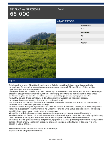 Załuż DZIAŁKA na SPRZEDAŻ 65 000 44/4623/OGS Agricultural Flat Rectangle No 2 Asphalt Opis Działka rolna o pow. 24 a 88 m2, położona w Załużu z możliwością uzyskania pozwolenia na budowę. Ma kształt prostokąta nieregularnego o wymiarach 68 m x 30 m x 70 m x 43 m i położona jest na terenie płaskim. Dostępne media na działce: prąd, siła, wodociąg, linie telefoniczne. Załuż jest na etapie końcowym procedur przygotowawczych do wykonania inwestycji budowy sieci kanalizacyjnej. Możliwość podłączenia gazu do działki - instalacje gazowe przebiegają przez przylegające działki. Korzystny dojazd drogą asfaltową. Z działki specjalnie wydzielono fragment obszaru na zapewnienie swobodnego dostępu do drogi publicznej. Nieruchomość leży w bezpośrednim sąsiedztwie zabudowy istniejącej – graniczy z trzech stron z terenami mieszkalnictwa jednorodzinnego. W miejscowości dostępne są komunikacje: PKS z Leskiem, Sanokiem, Przemyślem oraz połączenie kolejowe z Zagórzem oraz Chyrowem na Ukrainie. Ponadto wieś Załuż posiada szkołę, bibliotekę, kościół, sklep spożywczy i spożywczo-przemysłowy. W pobliżu znajduje się nowoczesne gospodarstwo agroturystyczne z sauną i basenem. W odległości około 300 m od przedmiotowej nieruchomości płynie rzeka San ze strefą kąpieliskową oraz kamienistą plażą, jest to również wspaniałe miejsce dla miłośników wędkowania. W okolicy można spotkać obiekty zabytkowe, tj.: pałac z XIX w z parkiem podworskim, ruiny zamku Sobień (2 km) oraz w pobliskich rejonach: Skansen oraz Zamek Królewski w Sanoku (7,5 km), zamek w Lesku (7 km). Wspaniałe miejsce na zamieszkanie, jak i rekreację. Zapraszam do obejrzenia w terenie. MM Nieruchomości Opiekun oferty: Joanna Gacek tel.: 785-525-402 email: [email protected] MM Nieruchomości oddział w Sanoku tel. +48 13 492 41 61 +48 881-799-704 ZAPŁACISZ TYLKO WTEDY, KIEDY OKAŻEMY SIĘ SKUTECZNI! MM 360 tel. +48 881 799 704; +48 13 492 41 61 email: [email protected] MM Nieruchomości Powered by TCPDF (www.tcpdf.org)