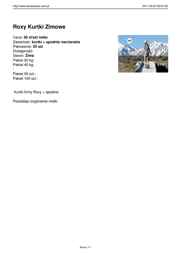 http://www.taniaodziez.com.pl 2017-03-07 00:57:52 Roxy Kurtki Zimowe Cena: 90 zł/szt netto Zawartość: kurtki + spodnie narciarskie Pakowanie: 20 szt Dostępność: Sezon: Zima Pakiet 20 kg: Pakiet 40 kg: : Pakiet 50 szt.: Pakiet 100 szt.: Kurtki firmy Roxy + spodnie Posiadaja oryginalnie metki Strona 1/1