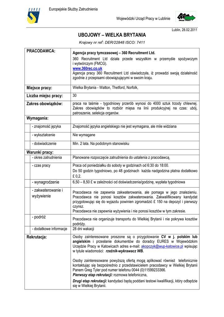 Europejskie SłuŜby Zatrudnienia Wojewódzki Urząd Pracy w Lublinie Lublin, 28.02.2011 UBOJOWY – WIELKA BRYTANIA i Krajowy nr ref : DER/22848 ISCO: 7411 PRACODAWCA: Agencja pracy tymczasowej – 360 Recruitment Ltd. 360 Recruitment Ltd działa przede wszystkim w przemyśle spoŜywczym i wytwórczym (FMCG). www.360rec.co.uk Agencja pracy 360 Recruitment Ltd oświadczyła, iŜ prowadzi swoją działalność zgodnie z przepisami obowiązującymi w swoim kraju. Miejsce pracy: Wielka Brytania - Watton, Thetford, Norfolk, Liczba miejsc pracy: 30 Zakres obowiązków: praca na taśmie - tygodniowy przerób wynosi do 4000 sztuk trzody chlewnej. Zakres obowiązków to rozbiór mięsa na linii produkcyjnej na czas: ubój, patroszenie, selekcja organów. Wymagania: - znajomość języka Znajomość języka angielskiego nie jest wymagana, ale mile widziana - wykształcenie Nie wymagane - doświadczenie Min. 2 lata. Na podobnym stanowisku Warunki pracy: - okres zatrudnienia Planowane rozpoczęcie zatrudnienia do ustalenia z pracodawcą. - czas pracy Praca od poniedziałku do soboty w godzinach od 6:30 do 18:00. Do 50 godzin tygodniowo, po 48 godzinach kaŜda nadgodzina płatna dodatkowo £ 0,2. 6,50 – 8,50 £ w zaleŜności od doświadczenia/godzinę, wypłata tygodniowa - wynagrodzenie - zakwaterowanie i wyŜywienie - podróŜ - dodatkowe informacje Rekrutacja: Pracodawca nie zapewnia zakwaterowania, ale pomaga w jego znalezieniu. Pracodawca nie ponosi kosztów zakwaterowania. Zakwalifikowany kandydat przygotowując się do wyjazdu powinien zgromadzić £ 150 na depozyt i pierwszy czynsz. Pracodawca nie zapewnia wyŜywienia i nie ponosi kosztów w tym zakresie. Pracodawca nie organizuje transportu do Wielkiej Brytanii i nie pokrywa kosztów podróŜy. 28 dni wakacji Osoby zainteresowane proszone są o przygotowanie CV w j. polskim lub angielskim i przesłanie dokumentów do doradcy EURES w Wojewódzkim Urzędzie Pracy w Katowicach adres e-mail: [email protected] wpisując w tytule wiadomości: rzeźnik-wykrawacz WB. Osoby zainteresowane powyŜszą ofertą mogą aplikować równieŜ telefonicznie kontaktując się bezpośrednio z przedstawicielem pracodawcy w Wielkiej Brytanii Panem Greg Tyler pod numer telefonu 0044 (0)11599233366. Pierwszy etap rekrutacji: rozmowa telefoniczna, Drugi etap rekrutacji: kandydaci będą poddani testowi kwalifikacji, który odbędzie się w Wielkiej Brytanii. Uprzejmie informujemy, że skontaktujemy się wyłącznie z wybranymi kandydatami. UWAGA: 1. Umowa z zagranicznym pracodawcą zostanie zawarta zgodnie z prawem kraju zatrudnienia. Oznacza to, że wszystkie roszczenia odnośnie do warunków, które obejmuje umowa, można kierować wyłącznie do odpowiedniego sądu w kraju zatrudnienia. Publiczne służby zatrudnienia (EURES) nie mogą pośredniczyć ani reprezentować pracownika w sądzie kraju zatrudnienia w przypadku sporu z pracodawcą. 2. Publiczne służby zatrudnienia (EURES) dokładają wszelkich starań, aby zapewnić rzetelność i wiarygodność ofert pracy zgłoszonych w lokalnym urzędzie pracy. Należy wyjaśnić, że oferta pracy została zgłoszona przez stronę trzecią i EURES nie odpowiada za ewentualne rozbieżności między warunkami pracy określonymi w ofercie pracy i warunkami oferowanymi przez potencjalnego pracodawcę. 3. Na podstawie ustawy o ochronie danych osobowych z dnia 29 sierpnia 1997 r. (Dz. U. z 2002 r. Nr 101, poz. 926 ze zm.) informujemy, Ŝe administratorem danych osobowych wskazanych w dokumentach przekazanych w odpowiedzi na ofertę pracy jest Wojewódzki Urząd Pracy w Katowicach, ul. Kościuszki 30, 40-048 Katowice. 4. Dane osobowe wskazane dobrowolnie w ww. dokumentach będą przetwarzane i udostępniane publicznym słuŜbom zatrudnienia, pracodawcom lub podmiotom reprezentującym pracodawców do celów związanych z pośrednictwem pracy w ramach sieci EURES, na podstawie ustawy z dnia 20 kwietnia 2004 r. o promocji zatrudnienia i instytucjach rynku pracy (Dz. U. z 2008 r. Nr 69, poz. 415 ze zm.) przez okres konieczny do osiągnięcia celu określonego w przedmiotowej ustawie. Osobie, której dane osobowe dotyczą przysługuje prawo dostępu do ich treści i prawo ich poprawiania. OFERTA WAśNA DO 31 maja 2011. Więcej ofert pracy za granicą: www.ec.europa.eu/eures www.eures.wup.lublin.pl