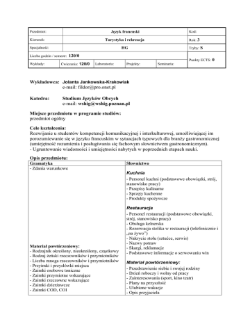 Przedmiot: Język francuski Kierunek: Turystyka i rekreacja Kod: Rok: 3 Tryby: S HG Specjalność: Liczba godzin / semestr: 120/0 Punkty ECTS: Wykłady: Ćwiczenia: 120/0 Laboratoria: Projekty: 0 Seminaria: Wykładowca: Jolanta Jankowska-Krakowiak e-mail: [email protected] Katedra: Studium Języków Obcych e-mail: [email protected] Miejsce przedmiotu w programie studiów: przedmiot ogólny Cele kształcenia: Rozwijanie u studentów kompetencji komunikacyjnej i interkulturowej, umoŜliwiającej im porozumiewanie się w języku francuskim w sytuacjach typowych dla branŜy gastronomicznej (umiejętność rozumienia i posługiwania się fachowym słownictwem gastronomicznym). - Ugruntowanie wiadomości i umiejętności nabytych w poprzednich etapach nauki. Opis przedmiotu: Gramatyka - Zdania warunkowe Słownictwo Kuchnia - Personel kuchni (podstawowe obowiązki, strój, stanowisko pracy) - Przepisy kulinarne - Sprzęty kuchenne - Produkty spoŜywcze Materiał powtórzeniowy: - Rodzajnik określony, nieokreślony, cząstkowy - Rodzaj Ŝeński rzeczowników i przymiotników - Liczba mnoga rzeczowników i przymiotników - Przyimki i przysłówki miejsca - Zaimki osobowe toniczne - Zaimki przymiotne wskazujące - Zaimki rzeczowne wskazujące - Zaimki dzierŜawcze - Zaimki COD, COI Restauracja - Personel restauracji (podstawowe obowiązki, strój, stanowisko pracy) - Obsługa kelnerska - Rezerwacja stolika w restauracji (telefonicznie i „na Ŝywo”) - Nakrycie stołu (sztućce, serwis) - Nazwy potraw - Skargi, reklamacje - Podstawowe informacje o serwowaniu win Materiał powtórzeniowy: - Przedstawienie siebie i swojej rodziny - Dzień roboczy i wolny od pracy - Zainteresowania (sport, kino teatr) - Plany na przyszłość - Ulubione wakacje - Opis przyjaciela - Zaimki EN, Y - Zaimki względne proste - Typy pytań - Typy przeczeń - Czasowniki 1, 2 grupy koniugacyjnej - Czasowniki zwrotne - Czasowniki nieregularne - Passé Composé / Imparfait - Futur Simple / Futur Proche - Conditionnel - Zdania warunkowe Forma prowadzenia zajęć: Lektorat - ćwiczenia Metody oceny: - Kartkówki z bieŜącego materiału leksykalno – gramatycznego - Prace pisemne - Sprawdzian w formie ustnej – raz w semestrze - Sprawdziany pisemne – przynajmniej dwa w semestrze Bibliografia: Literatura obowiązkowa: - Le français de l`hôtellerie et de la restauration CLE International -francais.com intermediaire CLE International Literatura zalecana: - „Le Français du Tourisme ” CLE International - „Repetytorium gramatyczne” Kram - „Repetytorium tematyczno-leksykalne” Skoraszewski - „Gramatyka języka francuskiego” J. Terech, Z. Terech - Artykuły, dokumenty, foldery, katalogi Lektor korzysta z licznych materiałów autorskich preparowanych na potrzeby kursu.