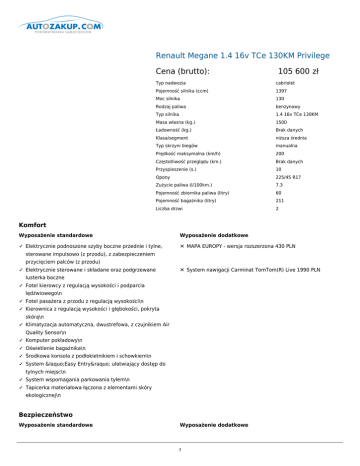 Renault Megane 1.4 16v TCe 130KM Privilege Cena (brutto): 105 600 zł Typ nadwozia cabriolet Pojemność silnika (ccm) 1397 Moc silnika 130 Rodzaj paliwa benzynowy Typ silnika 1.4 16v TCe 130KM Masa własna (kg.) 1500 Ładowność (kg.) Brak danych Klasa/segment niższa średnia Typ skrzyni biegów manualna Prędkość maksymalna (km/h) 200 Częstotliwość przeglądu (km.) Brak danych Przyspieszenie (s.) 10 Opony 225/45 R17 Zużycie paliwa (l/100km.) 7.3 Pojemność zbiornika paliwa (litry) 60 Pojemność bagażnika (litry) 211 Liczba drzwi 2 Komfort Wyposażenie standardowe Wyposażenie dodatkowe ✓ Elektrycznie podnoszone szyby boczne przednie i tylne, ✕ MAPA EUROPY - wersja rozszerzona 430 PLN sterowane impulsowo (z przodu), z zabezpieczeniem przycięciem palców (z przodu) ✓ Elektrycznie sterowane i składane oraz podgrzewane ✕ System nawigacji Carminat TomTom(R) Live 1990 PLN lusterka boczne ✓ Fotel kierowcy z regulacją wysokości i podparcia lędźwiowego\n ✓ Fotel pasażera z przodu z regulacją wysokości\n ✓ Kierownica z regulacją wysokości i głębokości, pokryta skórą\n ✓ Klimatyzacja automatyczna, dwustrefowa, z czujnikiem Air Quality Sensor\n ✓ Komputer pokładowy\n ✓ Oświetlenie bagażnika\n ✓ Środkowa konsola z podłokietnikiem i schowkiem\n ✓ System «Easy Entry» ułatwiający dostęp do tylnych miejsc\n ✓ System wspomagania parkowania tyłem\n ✓ Tapicerka materiałowa łączona z elementami skóry ekologicznej\n Bezpieczeństwo Wyposażenie standardowe Wyposażenie dodatkowe 1 ✓ 2-punktowy system mocowania fotelika dla dziecka ISOFIX na tylnych miejscach\n ✓ 3-punktowe pasy bezpieczeństwa z ogranicznikami napięcia na tylnych miejscach\n ✓ 3-punktowe pasy bezpieczeństwa, z napinaczami dostosowującymi się do siły zderzenia i ogranicznikami napięcia, na przednich miejscach\n ✓ ABS z systemem wspomagania nagłego hamowania (AFU)\n ✓ Automatyczna blokada drzwi podczas jazdy\n ✓ Automatycznie włączane światła awaryjne w razie nagłego hamowania\n ✓ Boczne poduszki powietrzne chroniące głowę, klatkę piersiową i miednicę osób siedzących na przednich ✓ Czołowa miejscach\n poduszka powietrzna kierowcy i pasażera dostosowujące się do siły zderzenia\n ✓ Dwa zagłówki z tyłu\n ✓ Elektronicznie kodowany system blokady zapłonu\n ✓ Elektryczne, zmienne wspomaganie układu kierowniczego\n ✓ Możliwość ręcznej dezaktywacji poduszki powietrznej pasażera z przodu\n ✓ Pałąki przeciwkapotażowe\n ✓ Poduszki powietrzne zapobiegające nurkowaniu wbudowane w fotele przednie\n ✓ Ręczny hamulec postojowy\n ✓ Światła przeciwmgłowe\n ✓ Sygnalizacja niezapięcia pasa bezpieczeństwa kierowcy i pasażera z przodu\n ✓ System dynamicznej kontroli toru jazdy (ESC)\n ✓ Zagłówki zapobiegające urazom kręgów szyjnych, z regulacją wysokości i kąta nachylenia, na przednich miejscach\n Dodatki Wyposażenie standardowe Wyposażenie dodatkowe ✓ Dach z czarnego, błyszczącego szkła ✕ Koło zapasowe (wyklucza zestaw do naprawy opon) 310 PLN ✓ Elektrochromatyczne lusterko wewnętrzne ✕ Obręcze kół ze stopu metali lekkich 18" 1990 PLN ✓ Funkcja oświetlania drogi do domu ✕ Radioodtwarzacz R-Plug&Radio+ 3D Sound by Arkamys® 1600 PLN ✓ Instalacja do montażu alarmu ✕ Tapicerka skórzana łączona z elementami skóry ekologicznej 5300 PLN ✓ karta Renault Hands Free\n ✓ Obręcze kół ze stopu metali lekkich 17"\n ✓ Obudowy lusterek bocznych w kolorze czarny, błyszczący\n ✓ Oświetlenie schowka w desce rozdzielczej\n ✓ Ozdobna listwa wokół przedniej szyby i boków nadwozia oraz zewnętrzne klamki drzwi w kolorze matowego chromu\n ✓ Podświetlane lusterka w osłonach przeciwsłonecznych\n ✓ Radioodtwarzacz R-Plug&Radio\n ✓ 2 regulator-ogranicznik prędkości\n 3 ✓ System «Short Drop» regulujący wysokość ustawienia szyb przy zamykaniu i otwieraniu drzwi\n ✓ Szyba przeciwwiatrowa\n ✓ Wycieraczki przedniej szyby o zmiennej częstotliwości pracy, z czujnikiem\n ✓ Zamykany schowek w desce rozdzielczej\n ✓ Zestaw do naprawy opon\n Doprecyzowanie oferty ✕ Pakiet Komfort - 1800 PLN Fotele przednie podgrzewane Siatka zapobiegająca zawirowaniom powietrza ✕ Pakiet Xenon - 4780 PLN Funkcja doświetlania zakrętów Reflektory Bi-ksenonowe Spryskiwacze reflektorów Kontakt: Nazwa użytkownika: admin Nazwa firmy: qqq Adres: qqq 12, 41-706 qqq1, NIP: 954 REGON: 1 Telefon: 123, 1 Fax: 1 Email: 1 www: 4