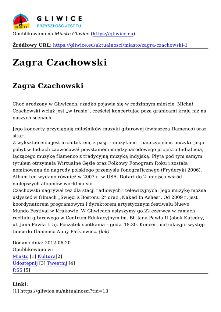 Opublikowano na Miasto Gliwice (https://gliwice.eu) Źródłowy URL: https://gliwice.eu/aktualnosci/miasto/zagra-czachowski-1 Zagra Czachowski Zagra Czachowski Choć urodzony w Gliwicach, rzadko pojawia się w rodzinnym mieście. Michał Czachowski wciąż jest „w trasie”, częściej koncertując poza granicami kraju niż na naszych scenach. Jego koncerty przyciągają miłośników muzyki gitarowej (zwłaszcza flamenco) oraz sitar. Z wykształcenia jest architektem, z pasji – muzykiem i nauczycielem muzyki. Jego pobyt w Indiach zaowocował powstaniem międzynarodowego projektu Indialucia, łączącego muzykę flamenco z tradycyjną muzyką indyjską. Płyta pod tym samym tytułem otrzymała Wirtualne Gęśle oraz Folkowy Fonogram Roku i została nominowana do nagrody polskiego przemysłu fonograficznego (Fryderyki 2006). Album ten wydano również w 2007 r. w USA. Dotarł do 2. miejsca wśród najlepszych albumów world music. Czachowski nagrywał też dla stacji radiowych i telewizyjnych. Jego muzykę można usłyszeć w filmach „Święci z Bostonu 2” oraz „Naked In Ashes”. Od 2009 r. jest koordynatorem programowym i dyrektorem artystycznym festiwalu Nuevo Mundo Festival w Krakowie. W Gliwicach usłyszymy go 22 czerwca w ramach recitalu gitarowego w Centrum Edukacyjnym im. Bł. Jana Pawła II (obok Katedry, ul. Jana Pawła II 5). Początek spotkania – godz. 18.30. Koncert uatrakcyjni występ tancerki flamenco Anny Patkiewicz. (kik) Dodano dnia: 2012-06-20 Opublikowano w: Miasto [1] Kultura[2] Udostępnij [3] Tweetnij [4] RSS [5] Linki: [1] https://gliwice.eu/aktualnosci?tid=13 [2] https://gliwice.eu/aktualnosci?tid=15 [3] https://www.facebook.com/share.php?u=https://gliwice.eu/printpdf/aktualnosci/miasto/z czachowski-1&t=Zagra Czachowski [4] https://twitter.com/intent/tweet?text=Zagra Czachowski&url=https://gliwice.eu/printpdf/aktualnosci/miasto/zagra-czachowski1%23twitter [5] https://gliwice.eu/rss/aktualnosci