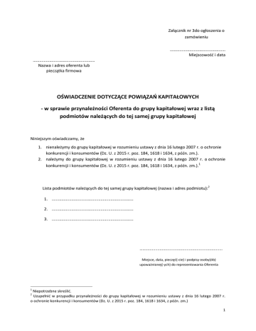 Załącznik nr 3do ogłoszenia o zamówieniu …………………………………………… Miejscowośd i data ………………………………………………… Nazwa i adres oferenta lub pieczątka firmowa OŚWIADCZENIE DOTYCZĄCE POWIĄZAŃ KAPITAŁOWYCH - w sprawie przynależności Oferenta do grupy kapitałowej wraz z listą podmiotów należących do tej samej grupy kapitałowej Niniejszym oświadczamy, że 1. nienależymy do grupy kapitałowej w rozumieniu ustawy z dnia 16 lutego 2007 r. o ochronie konkurencji i konsumentów (Dz. U. z 2015 r. poz. 184, 1618 i 1634, z późn. zm.). 2. należymy do grupy kapitałowej w rozumieniu ustawy z dnia 16 lutego 2007 r. o ochronie 1 konkurencji i konsumentów (Dz. U. z 2015 r. poz. 184, 1618 i 1634, z późn. zm.). Lista podmiotów należących do tej samej grupy kapitałowej (nazwa i adres podmiotu):2 1. ………………………………………………………………… 2. ………………………………………………………………… 3. ………………………………………………………………… ……....................................................................... Miejsce, data, pieczęd(-cie) i podpisy osoby(ób) upoważnionej(-ych) do reprezentowania Oferenta 1 Niepotrzebne skreślid. Uzupełnid w przypadku przynależności do grupy kapitałowej w rozumieniu ustawy z dnia 16 lutego 2007 r. o ochronie konkurencji i konsumentów (Dz. U. z 2015 r. poz. 184, 1618 i 1634, z późn. zm.) 2 1