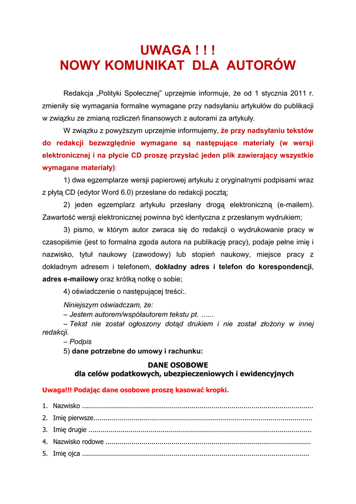 UWAGA ! ! ! NOWY KOMUNIKAT DLA AUTORÓW Redakcja „Polityki Społecznej” uprzejmie informuje, że od 1 stycznia 2011 r. zmieniły się wymagania formalne wymagane przy nadsyłaniu artykułów do publikacji w związku ze zmianą rozliczeń finansowych z autorami za artykuły. W związku z powyższym uprzejmie informujemy, że przy nadsyłaniu tekstów do redakcji bezwzględnie wymagane są następujące materiały (w wersji elektronicznej i na płycie CD proszę przysłać jeden plik zawierający wszystkie wymagane materiały): 1) dwa egzemplarze wersji papierowej artykułu z oryginalnymi podpisami wraz z płytą CD (edytor Word 6.0) przesłane do redakcji pocztą; 2) jeden egzemplarz artykułu przesłany drogą elektroniczną (e-mailem). Zawartość wersji elektronicznej powinna być identyczna z przesłanym wydrukiem; 3) pismo, w którym autor zwraca się do redakcji o wydrukowanie pracy w czasopiśmie (jest to formalna zgoda autora na publikację pracy), podaje pełne imię i nazwisko, tytuł naukowy (zawodowy) lub stopień naukowy, miejsce pracy z dokładnym adresem i telefonem, dokładny adres i telefon do korespondencji, adres e-mailowy oraz krótką notkę o sobie; 4) oświadczenie o następującej treści:. Niniejszym oświadczam, że: – Jestem autorem/współautorem tekstu pt. …... – Tekst nie został ogłoszony dotąd drukiem i nie został złożony w innej redakcji. – Podpis 5) dane potrzebne do umowy i rachunku: DANE OSOBOWE dla celów podatkowych, ubezpieczeniowych i ewidencyjnych Uwaga!!! Podając dane osobowe proszę kasować kropki. 1. Nazwisko .................................................................................................................... 2. Imię pierwsze.............................................................................................................. 3. Imię drugie ................................................................................................................ 4. Nazwisko rodowe ....................................................................................................... 5. Imię ojca .................................................................................................................. 6. Imię matki ................................................................................................................. 7. Data i miejsce urodzenia ............................................................................................. 8. Obywatelstwo ............................................................................................................. 9. PESEL........................................................................................................................ 10. NIP ……………………………………………………………………………………………………………………….. 11. Adres zameldowania.................................................................................................. a. Miejscowość .............................................................. b. Kod pocztowy ............................................................ c. Ulica ........................................................................ d. Nr domu .................................................................. e. Nr lokalu .................................................................. f. Województwo ........................................................... g. Powiat ..................................................................... h. Gmina ..................................................................... 12. Adres zamieszkania (dane jak w p. 11) ......................................................................... 13. Adres do korespondencji (dane jak w p. 11) ................................................................. 14. Numer, seria dowodu osobistego ……...……………………………………………………………………… 15. Organ wydający dowód osobisty ……………………………………………………………………………… 16. Numer i adres Urzędu Skarbowego............................................................................... 17. Oddział NFZ ............................................................................................................... 18. Nazwa banku.............................................................................................................. 19. Numer konta .............................................................................................................. 6) artykuły studentów/doktorantów i osób nieposiadających stopnia doktora muszą mieć dołączoną pozytywną opinię promotora/opiekuna naukowego o złożonym artykule; 7) tytuł każdego artykułu powinien być podany w językach polskim i angielskim. W przypadku recenzji publikacji podajemy tytuł polski oraz jego brzmienie w języku angielskim (w przypadku publikacji zagranicznej prosimy o podanie także oryginalnego tytułu recenzowanego dzieła). W przypadku sprawozdań, omówień wydarzeń naukowych czy innych materiałów podajemy tytuł polski oraz jego brzmienie w języku angielskim; 8) artykuł powinien zawierać streszczenie (ok. 600 znaków) w języku polskim oraz streszczenie w języku angielskim (ok. 600 znaków) – dotyczy artykułów problemowych, teoretycznych, historycznych, materiałów prezentujących wyniki badań czy doświadczenia zagraniczne (nie dotyczy recenzji, sprawozdań czy omówień wydarzeń naukowych); 9) artykuł powinien zawierać słowa kluczowe w języku polskim i w języku angielskim (nie dotyczy recenzji, sprawozdań z wydarzeń naukowych). Prace przygotowane niezgodnie z zamieszczonymi powyżej formalnymi warunkami publikacji nie będą przyjmowane do redakcji. Warunkiem opublikowania tekstu jest pozytywna opinia recenzentów potwierdzona decyzją redaktora naczelnego. 1. Na początku artykułu powinno być umieszczone imi