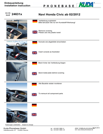 Einbauanleitung installation instruction Art.-Nr.: item# 24631x Navi Honda Civic ab 02/2012 Verkleidung aushebeln Bitte benutzen Sie nur ein Kunststoff-Werkzeug! Remove covering Please use only plastic tools! Konsole wie abgebildet einschieben Insert console as illustrated Blech hinter die Verkleidung biegen Bend metal plate behind covering Alle Bauteile wieder montieren To remount all component parts Änderungen vorbehalten Subject to change Kuda-Phonebase GmbH Osterdammerstr. 67 D-49401 Damme tel: +49 5491 9695 -0 fax: +49 5491 9695 -30 04.04.2012 eMail: [email protected] net: www.kuda-phonebase.de Instructions d´ installation instrucciones de instalación Art. 24631x Navi Honda Civic ab 02/2012 Tirez la couverture Veuillez n’utiliser qu’un outil de matière plastique Suelte el revestimiento Use sólo herramientas de plástico! Inserez la console comme illustré Meta la consola como mostrado Tordez la tôle derrière la couverture Tuerza la chapa detrás del revestimiento Remontez les éléments de construction Remonte todos partes de construcción . Nous nous réservons la possibilité de modification instrukcja montazu Kuda-Phonebase GmbH Osterdammerstr. 67 D-49401 Damme Salvo posibles modificaciones tel: +49 5491 9695 -0 fax: +49 5491 9695 -30 04.04.2012 eMail: [email protected] net: www.kuda-phonebase.de instrukcja montazu installatie instructie Art. 24631x Navi Honda Civic ab 02/2012 Bekleding uitnemen Alleen plastic gereedschap gebruiken alstublieft! Wywazyc tapicerke Prosze uzywac tylko narzedzi z tworzywa sztucznego. Konsole zoals afgebeeld inschuiven Wsunosc konsole, jak przedstawiono na zdjeciu. Uniklem achter de bekleding buigen Blaszke zagiac za tapicerke Remonte todos partes de construcción Wszystkie elementy ponownie zamontowac Nous nous réservons la possibilité de modification Kuda-Phonebase GmbH Osterdammerstr. 67 D-49401 Damme Salvo posibles modificaciones tel: +49 5491 9695 -0 fax: +49 5491 9695 -30 04.04.2012 eMail: [email protected] net: www.kuda-phonebase.de