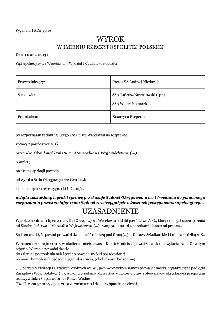 Sygn. akt I ACa 33/13 WYROK W IMIENIU RZECZYPOSPOLITEJ POLSKIEJ Dnia 1 marca 2013 r. Sąd Apelacyjny we Wrocławiu – Wydział I Cywilny w składzie: Przewodniczący: Prezes SA Andrzej Niedużak Sędziowie: SSA Tadeusz Nowakowski (spr.) SSA Walter Komorek Protokolant: Katarzyna Rzepecka po rozpoznaniu w dniu 15 lutego 2013 r. we Wrocławiu na rozprawie sprawy z powództwa A. G. przeciwko Skarbowi Państwa - Marszałkowi Województwa (...) o zapłatę na skutek apelacji powoda od wyroku Sądu Okręgowego we Wrocławiu z dnia 11 lipca 2012 r. sygn. akt I C 200/12 uchyla zaskarżony wyrok i sprawę przekazuje Sądowi Okręgowemu we Wrocławiu do ponownego rozpoznania pozostawiając temu Sądowi rozstrzygnięcie o kosztach postępowania apelacyjnego. UZASADNIENIE Wyrokiem z dnia 11 lipca 2012 r. Sąd Okręgowy we Wrocławiu oddalił powództwo A. G., który domagał się zasądzenia od Skarbu Państwa – Marszałka Województwa (...) kwoty 500.000 zł z odsetkami i kosztami procesu. Sąd ten ustalił, że powód prowadzi działalność rolniczą pod firmą (...) – Uprawy Szkółkarskie i Leśne z siedzibą w K.. W marcu oraz maju 2010r. w okolicach miejscowości K. miała miejsce powódź, na skutek wylania rzeki O. w tym rejonie. W czasie powodzi doszło do zalania i podtopienia należącej do powoda szkółki posadowionej na nieruchomościach będących jego własnością, (okoliczności bezsporne) (...) Zarząd Melioracji i Urządzeń Wodnych we W., jako wojewódzka samorządowa jednostka organizacyjna podległa Zarządowi Województwa (...), wykonuje zadania Marszałka w zakresie praw i obowiązków określonych przepisami ustawy z dnia 18 lipca 2001 r. - Prawo Wodne (Dz. U. z 2005r nr 239 poz. 2019 ze zmianami) i działa w oparciu o uchwałę nr Xll/114/2003 z dnia 29 sierpnia 2003 r. Sejmiku Województwa (...) w sprawie połączenia Regionalnych Zarządów Melioracji i Urządzeń Wodnych w L., L., Ś. oraz W. i utworzenia (...) Zarządu Melioracji i Urządzeń Wodnych we W. oraz nadania statutu. Jednostka ta realizuje zadania własne Samorządu Województwa zgodnie z art. 14 ust.1 pkt 6, 8 i 9 ustawy z dnia 5 czerwca 1998 r. o samorządzie województwa, określone odrębnymi ustawami, między innymi w zakresie gospodarki wodnej, w tym ochrony przeciwpowodziowej oraz wyposażenia i utrzymania wojewódzkich magazynów przeciwpowodziowych. Ponadto, realizuje powierzone ustawowo Marszałkowi Województwa zadania z zakresu administracji rządowej oraz zadania własne Marszałka Województwa wynikające z przepisów ustawy z dnia 18 lipca 2001 r. - Prawo wodne miedzy innymi w zakresie własności wód, gospodarki wodnej i melioracji oraz spółek wodnych. W tym zakresie, do zadań (...) Zarządu należy również: administrowanie wodami (rzeki, kanały, potoki) i urządzeniami melioracji podstawowych (wały przeciwpowodziowe, przepompownie, zbiorniki retencyjne, budowle hydrotechniczne, rurociągi i inne), dokonywanie uzgodnień związanych z kolizjami obcych urządzeń z administrowanymi wodami oraz urządzeniami melioracji wodnych (podstawowych i szczegółowych), systematyczne przeglądy i oceny stanu technicznego urządzeń, ochrona urządzeń przed niszczeniem i zanieczyszczeniem; utrzymywanie (remonty, konserwacje i udrożnienia) wód i urządzeń melioracji wodnych podstawowych. Planowanie i nadzorowanie tych prac oraz ich rozliczanie. Sporządzanie dokumentacji technicznych robót konserwacyjno-remontowych; programowanie, planowanie, określanie potrzeb terenowych i koncepcji rozwiązań technicznych inwestycji gospodarki wodnej i melioracji wodnych. Przy tak ustalonym stanie faktycznym Sąd Okręgowy uznał, że powództwo należało oddalić z uwagi na brak legitymacji biernej strony pozwanej. Analizując przepisy ustawy z 18.07.2001 r. Prawo wodne (tekst jedn. Dz.U. z 2012 r., poz. 145) w szczególności art. 16 ust. 3, art. 11 ust. 1 pkt 4, art., 13 i art. 14 ust. 4 sąd ten doszedł do przekonania, że w świetle regulacji ustawy Pr. wodne w rozpoznawanej sprawie bezsporne było, że prawa właścicielskie wobec rzeki O., w obszarze której nastąpiła powódź w 2010 r. wykonuje Marszałek Województwa (...) jako zadanie z zakresu administracji rządowej powierzone na podstawie ustawy. W aktualnym stanie prawnym w zakresie zasad odpowiedzialności odszkodowawczej organów władzy odpowiedzialność jednostki samorządu terytorialnego za szkodę wywołaną przy wykonywaniu zadań publicznych należy rozpatrywać z uwzględnieniem art. 417 k.c. w brzmieniu nadanym po wejściu w życie orzeczenia T.K. z 4.12.2001 r. (sygn.. akt SK18/2000/-Dz.U. 2001, nr 145, poz 1638). Zgodnie z art. 417 § 1 k.c. odpowiedzialność z tego przepisu może ponosić samodzielnie jednostka samorządu terytorialnego. Z punktu widzenia tego przepisu szczególne znaczenie ma to, że samorząd terytorialny jest odrębnym od państwa podmiotem, czego konsekwencją jest przyznanie osobowości prawnej jednostkom samorządu terytorialnego. Sąd Okręgowy wskazuje na status prawny województwa – jako jednostki samorządu terytorialnego przedstawiając przepisy ustawy z 5.06.1998 r. o samorządzie województwa (tekst jedn. Dz.U. z 2001 r., Nr 142, poz. 1590 ze zm.) w szczególności art. 6 i art. 14 ust. 2. Odnosi się do regulacji zawartej w art. 417 § 2 k.c. (chodzi o kompetencje przekazane w drodze porozumienia) i dochodzi do wniosku, że rozwiązanie zawarte w tym przepisie jest odmienne niż w obowiązującym wcześniej art. 4202 k.c. uchylonym ustawą z 17.06.2004 r. (Dz.U. Nr 162, poz. 1692). Sąd pierwszej instancji przywołuje także art. 166 Konstytucji R.P. i dochodzi do wniosku, że jeżeli źródłem wykonywania zadań z zakresu administracji publicznej, a dokładniej z zakresu administracji rządowej, przez jednostki samorządu terytorialnego jest ustawa, to odpowiedzialność za szkodę wyrządzoną przez niezgodne z prawem działanie lub zaniechanie przy wykonywaniu tego zadania ponosi wy